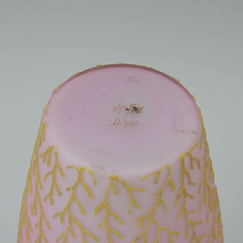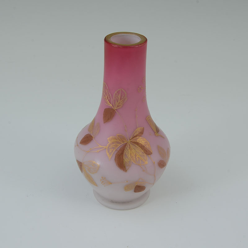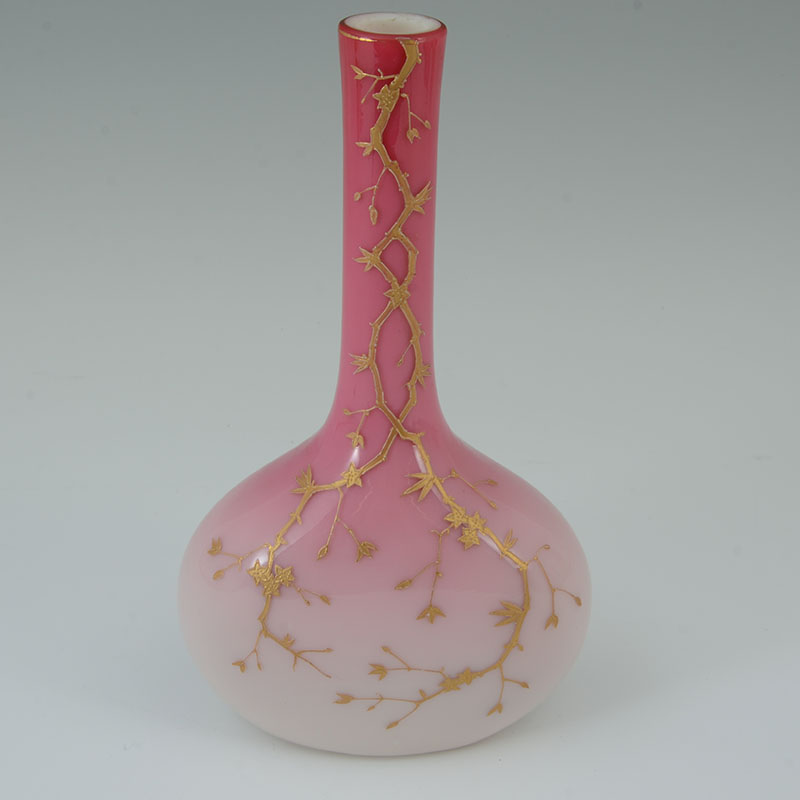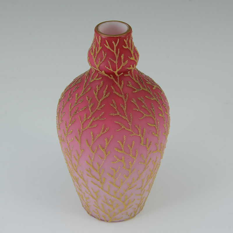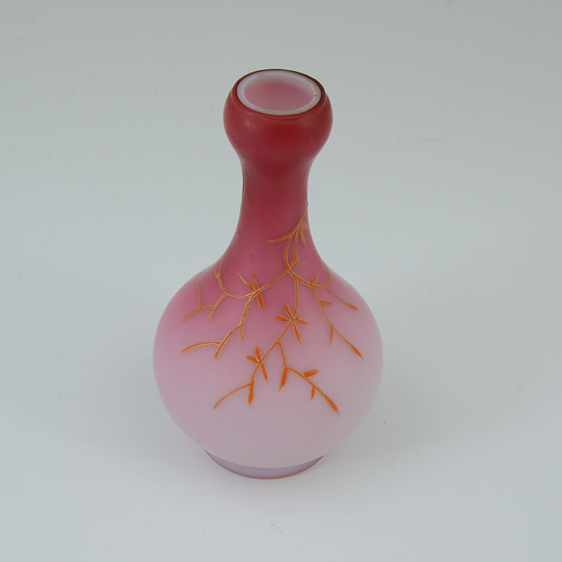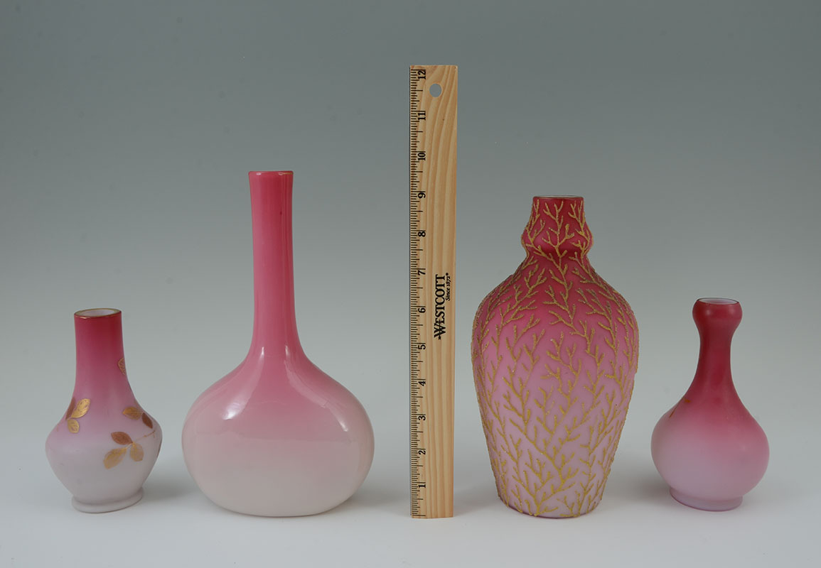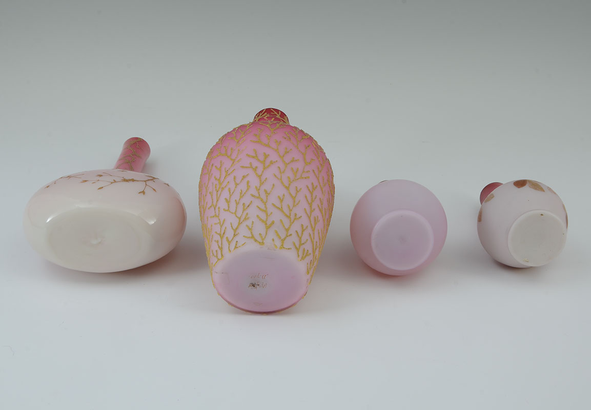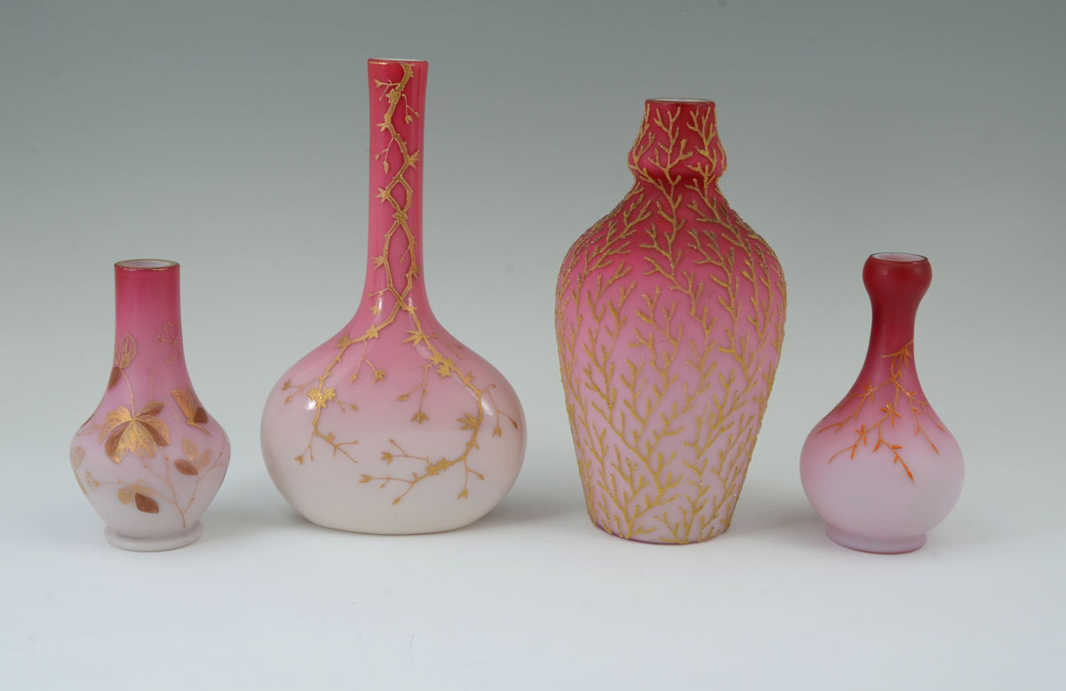 4 PIECE PEACHBLOW & CORALINE GLASS VASES: An assembled collection, attributed to Webb, to include 1) Coraline vase, numbered 674 / D. 700, 8 3/4'' h. x 4 3/4''. 2) Gilt decorated branches and flowers vase with elongated neck, 9 1/2'' h. x 5 3/4'' x 3''. 3) Gilt and red decorated vase, 6'' h. x 3 1/4''. 4) Gilt decorated branches and butterfly motif vase, 5 1/2'' h. x 3'' dia.