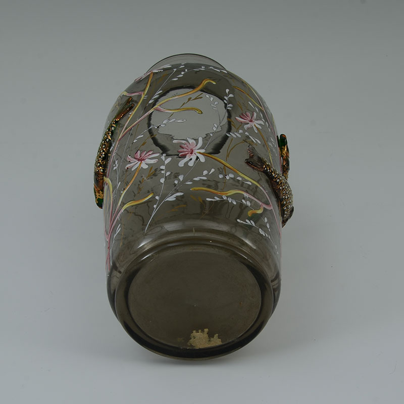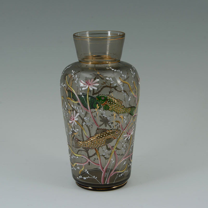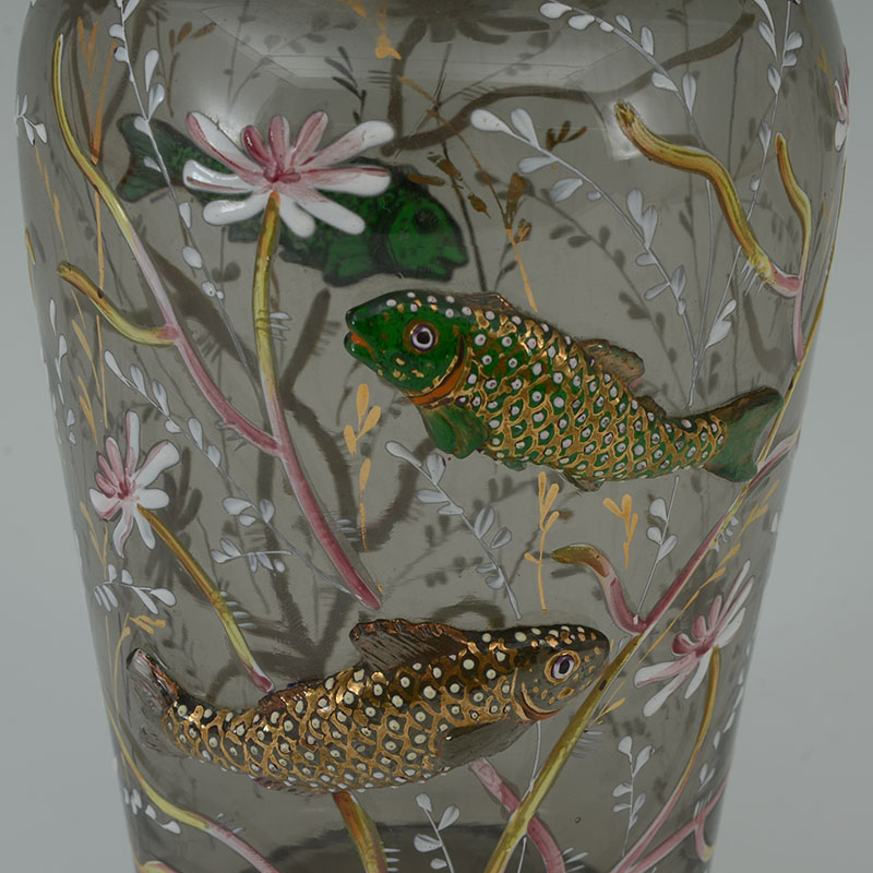 ATTRIB. MOSER APPLIED FISH VASE: Smoky glass baluster form vase with applied enamel raised fish and flowers, gilt accents, unmarked, attributed to Moser. 8 1/4'' h. x 4 1/4''.