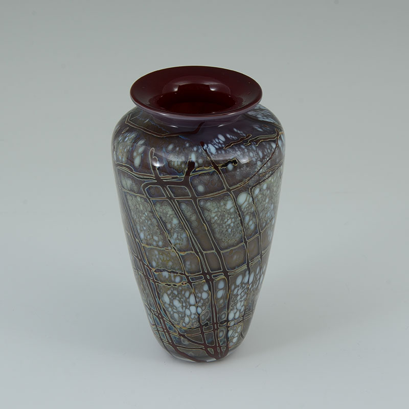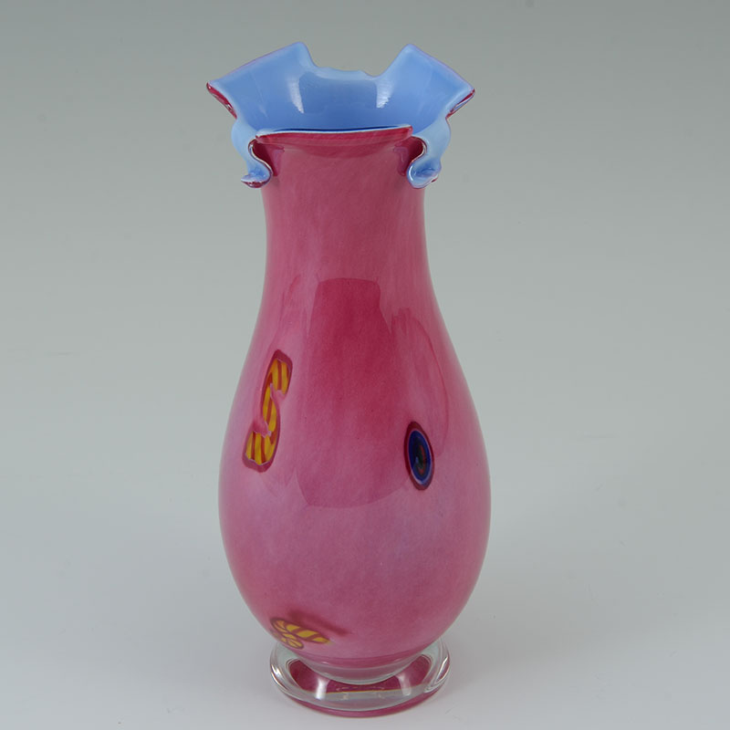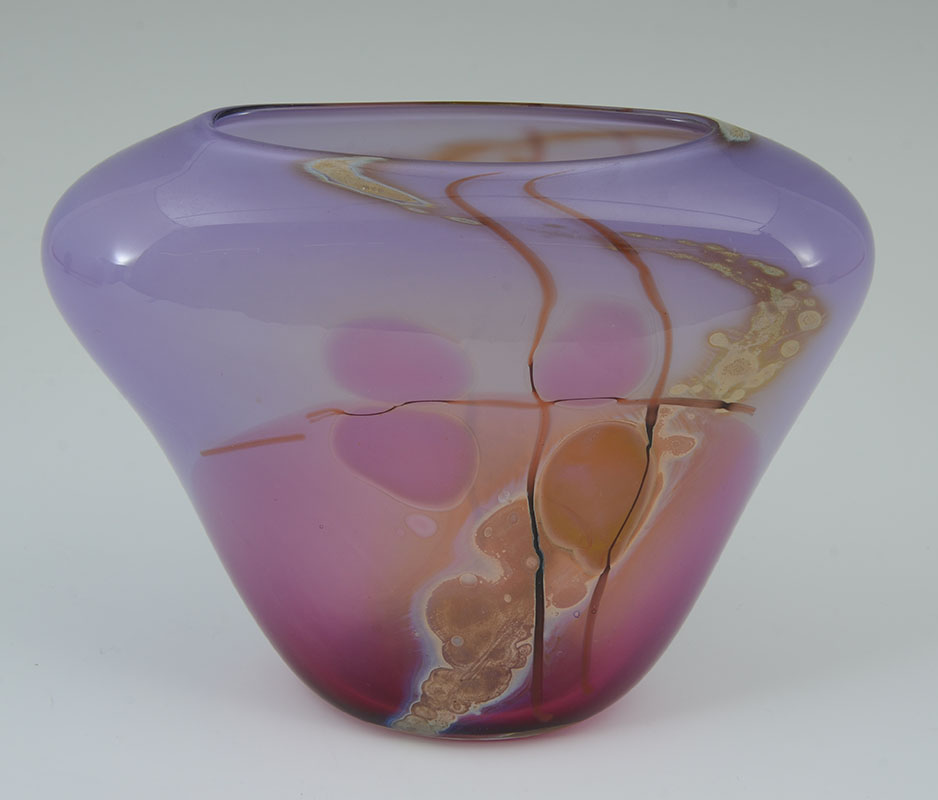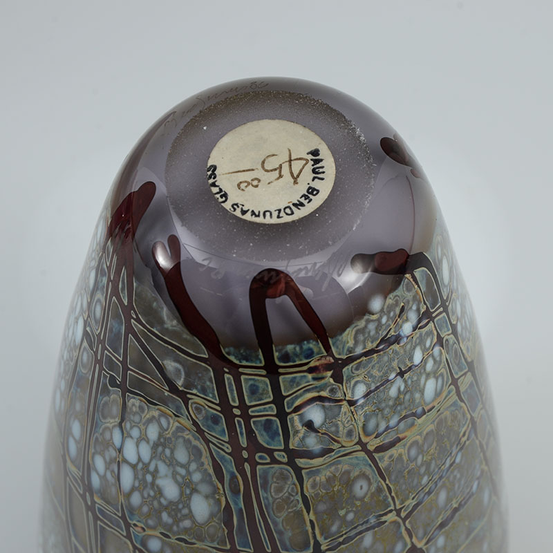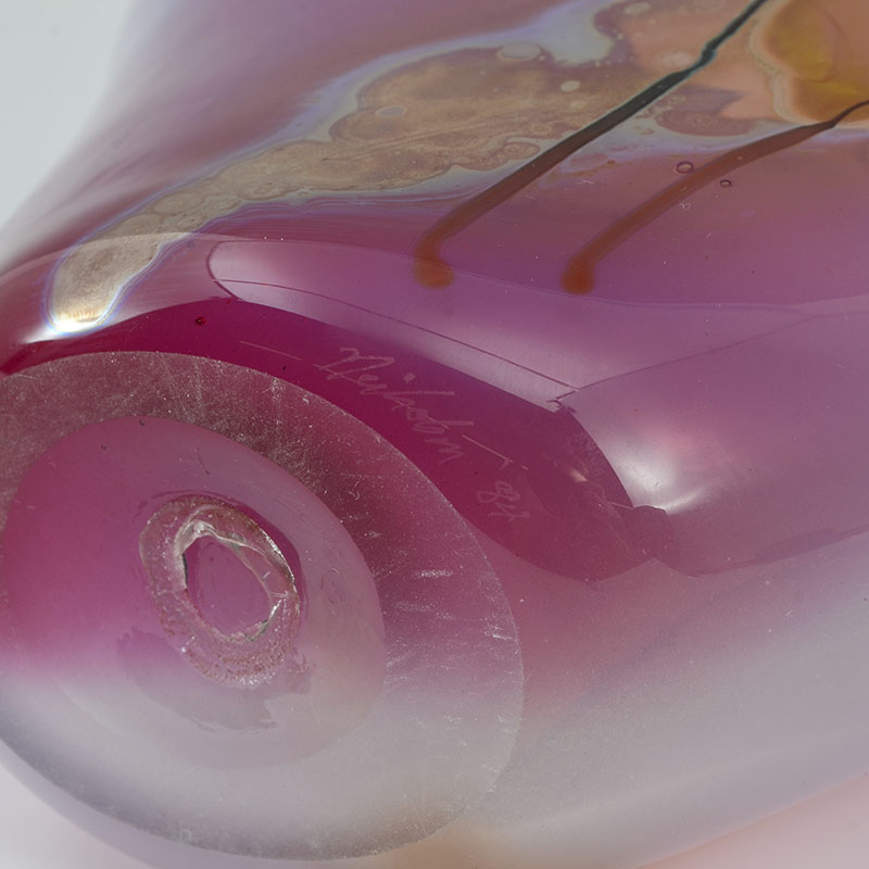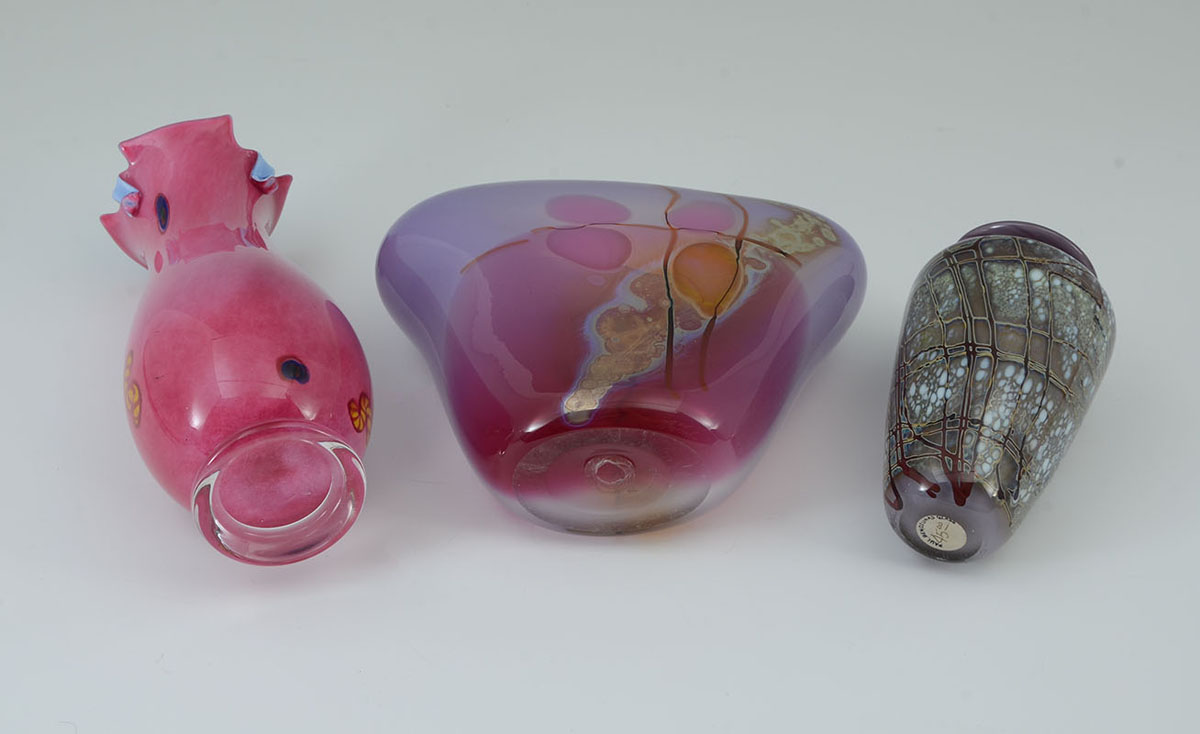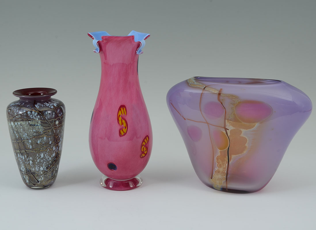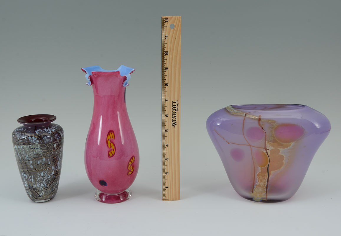 3 AMERICAN STUDIO ART GLASS VASES: An assembled collection of 3 pieces total to include 1) Small vase with Paul Bendzunas Glass original label, 5 3/4'' h. x 3 1/4''. 2) Illegibly signed A. Dorve? pink exterior, blue interior vase with shaped rim, 9'' h. 3) Illegible signed Neiholm? flared vase with pinks and purples, 6 1/2'' h. x 8 1/4'' x 3 1/4''.