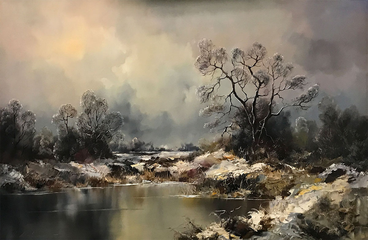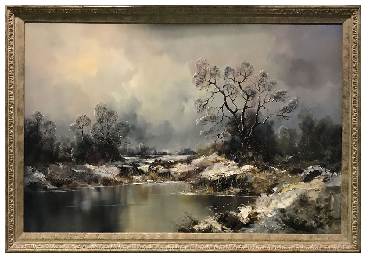 DIESTE, Hermann, (German, 1941-): Winter Landscape with Stream, Oil/ Canvas, 24'' x 336'', signed lower left, original pierce carved frame, 33'' x 44.5''.
