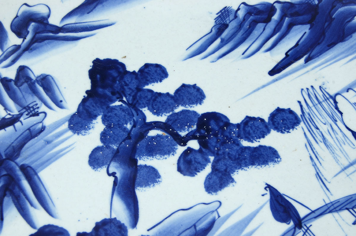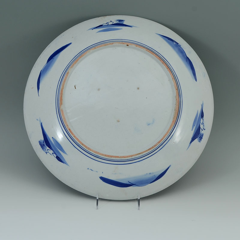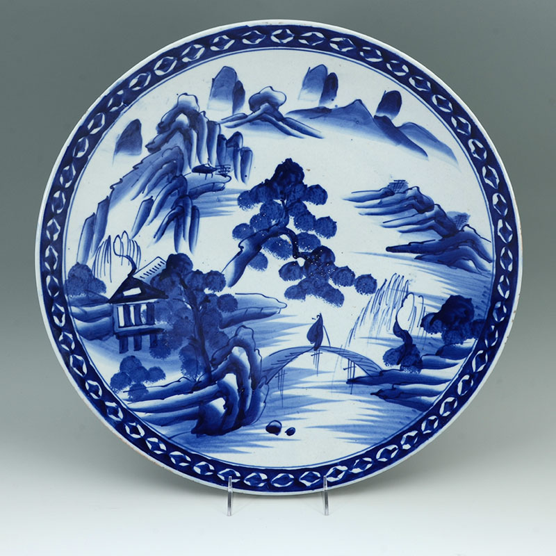 CHINESE BLUE & WHITE DECORATED CHARGER: Blue & decorated charge with outdoor genre scene featuring mountains, building, trees and bridge over water. No markings, measures 2 1/2'' x 18''.