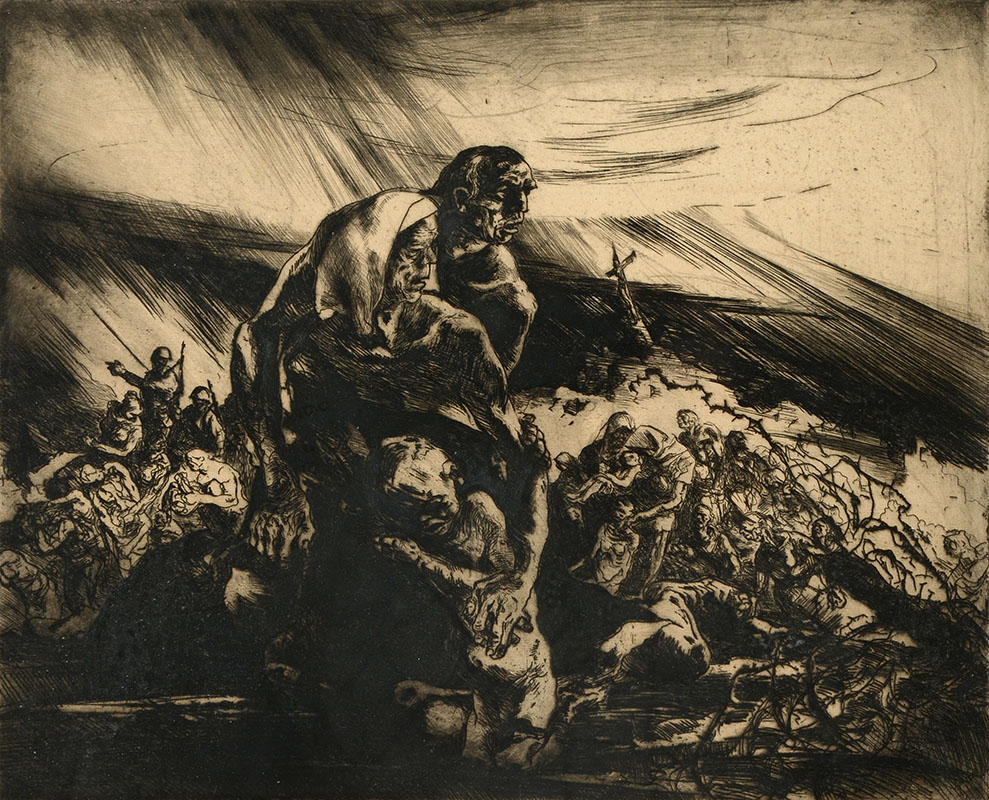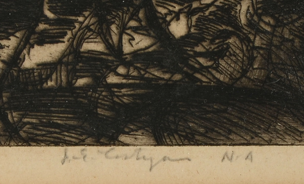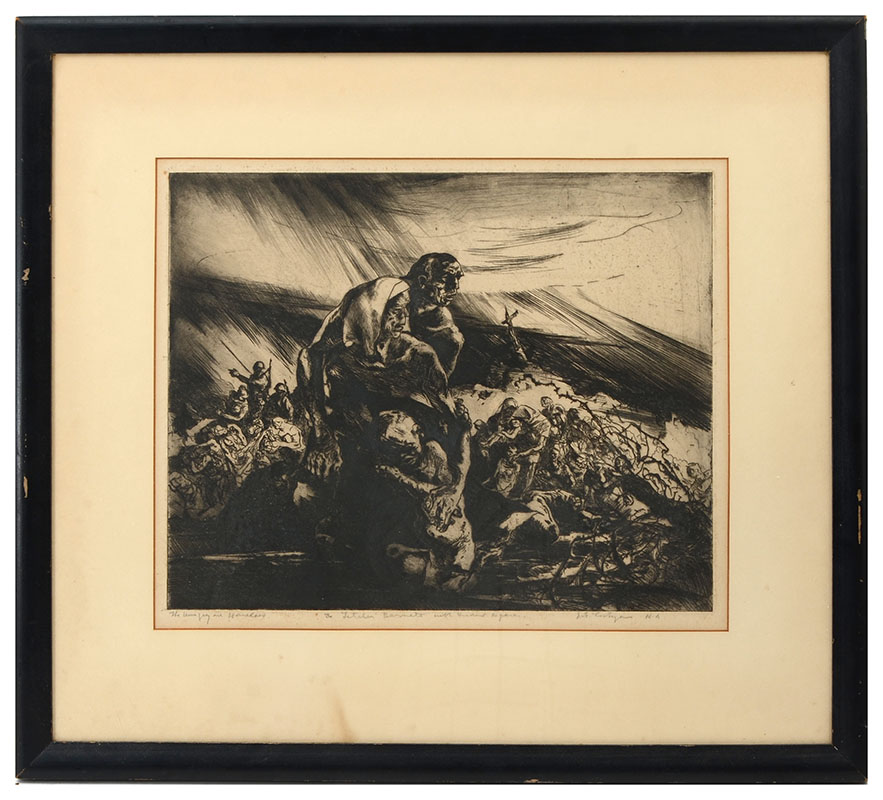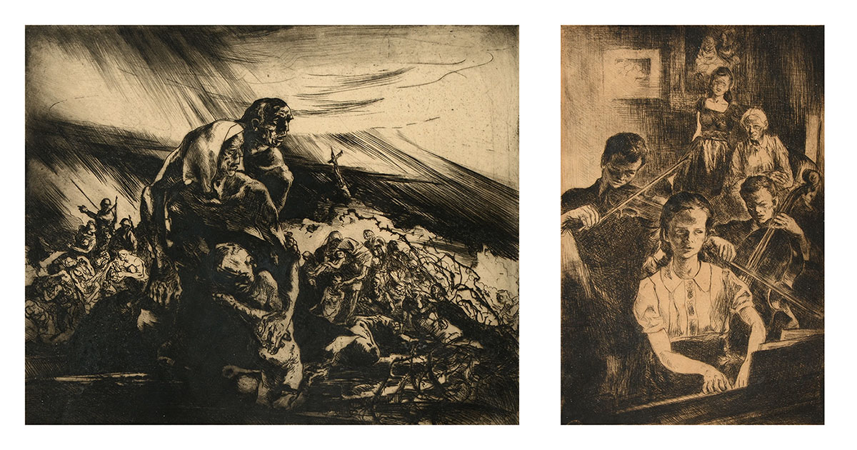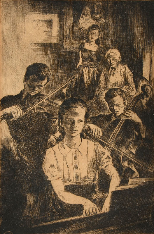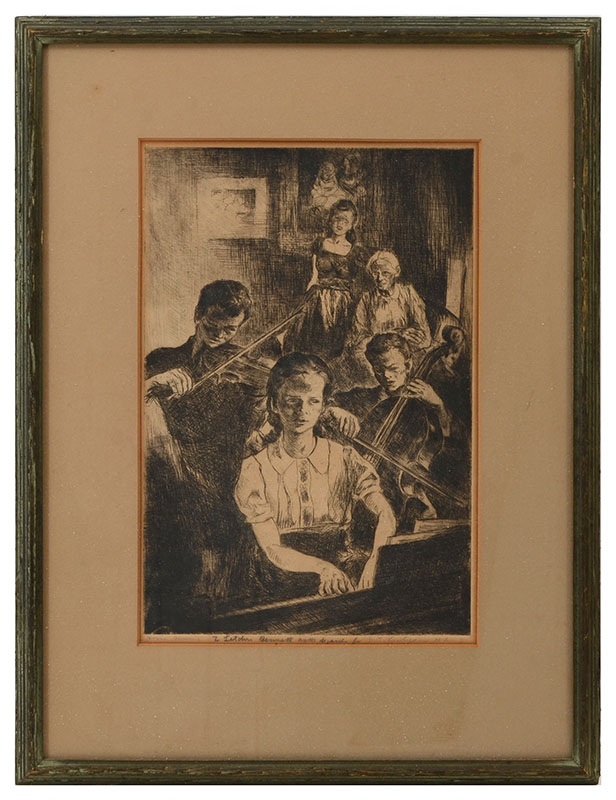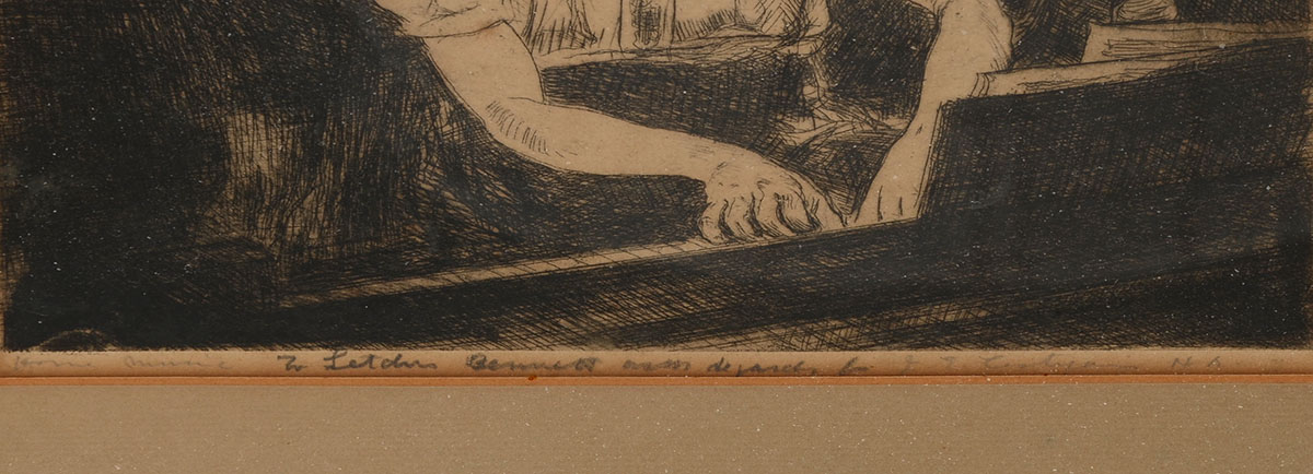 COSTIGAN, John (American, 1888-1972): 1) Home Music, sight size 12.25'' x 8'', pencil signed lower right, titled lower left, dedicated to Bennett, framed, 19'' 14''; 2) Hungry and the Homeless, sight size 12.5'' x 15'', impression size 11.75'' x 14.75'', pencil signed lower right, titled lower left, dedicated to Bennett with kind regards, framed, 20.5'' x 23.5''.