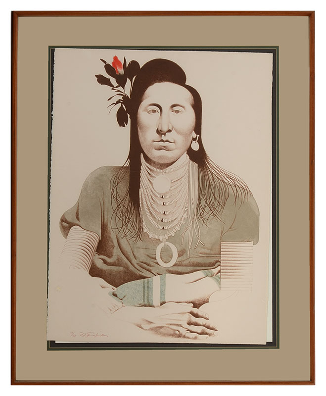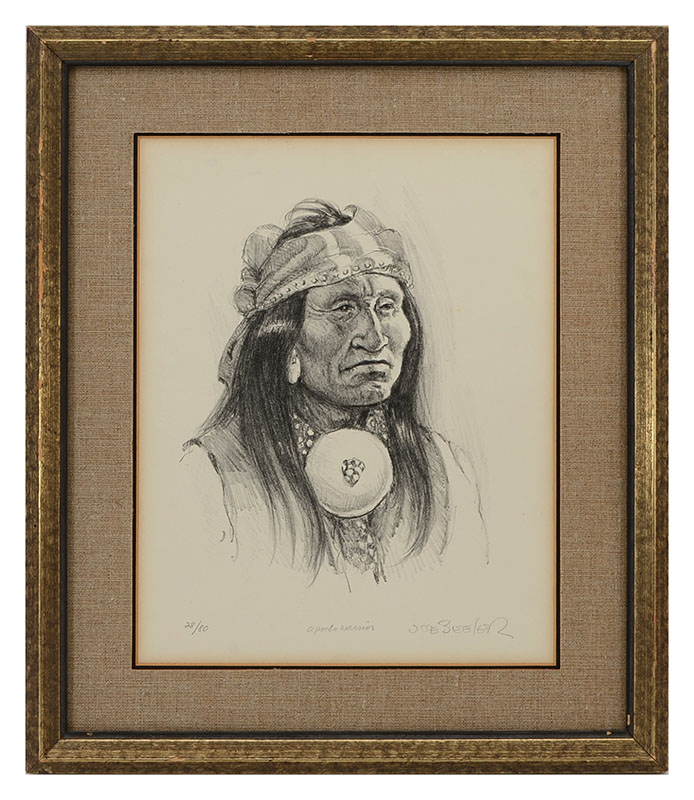 3 PIECE INDIAN PRINT LOT MARK ENGLISH, BEELER: 1) ENGLISH, Mark - Indian Portrait, Lithograph, 30'' x 22'', pencil signed lower left and numbered 47/50, 2 blind stamps in lower left corner, float mounted in frame, 38.5'' x 31''; 2), ENGLISH, Mark - Portrait of a Brave in the style of Warhol, Lithograph, sight size 29.5'' x 21'', pencil signed lower left, numbered 48/50, 2 blind stamps in lower left corner, framed, 37'' x 28.5''; 3) BEELER, Joe - Apache Warrior, Lithographs, sight size 13.5'' x 10.5'', pencil signed lower right, titled in margin and numbered28/80, lower left, 2 blind stamps in lower mid margin, framed without glass, 19.5'' x 16.5''.