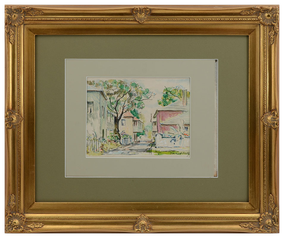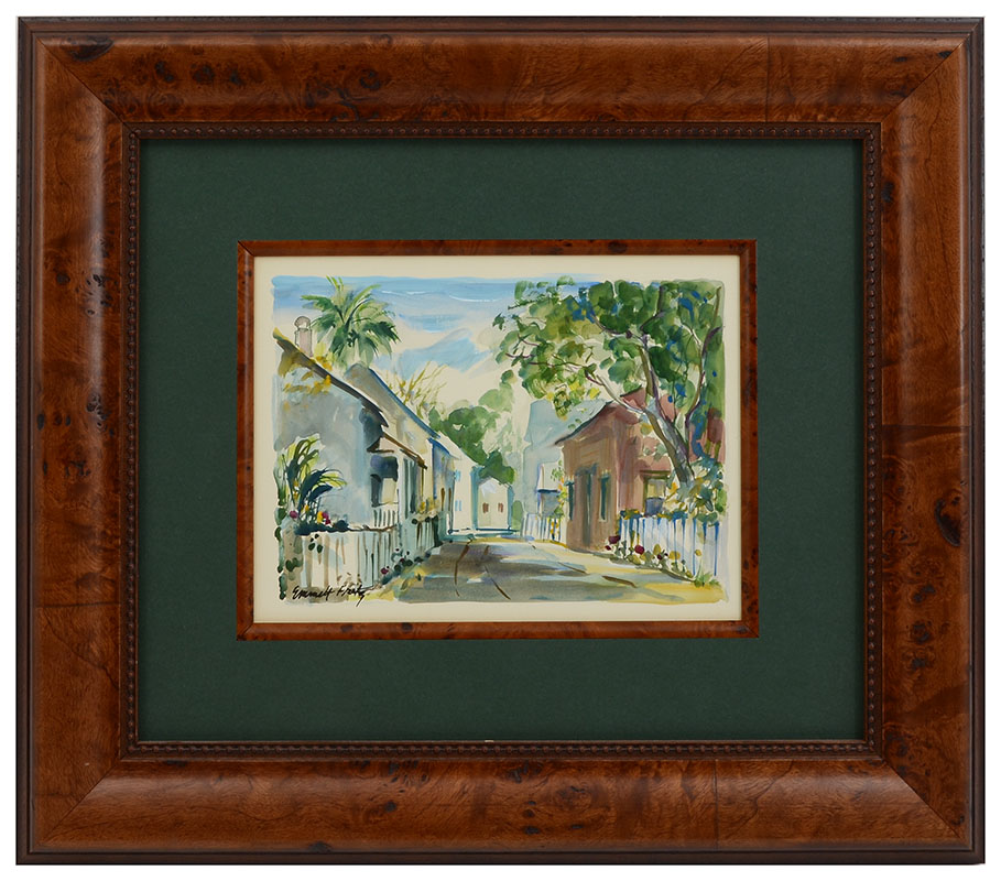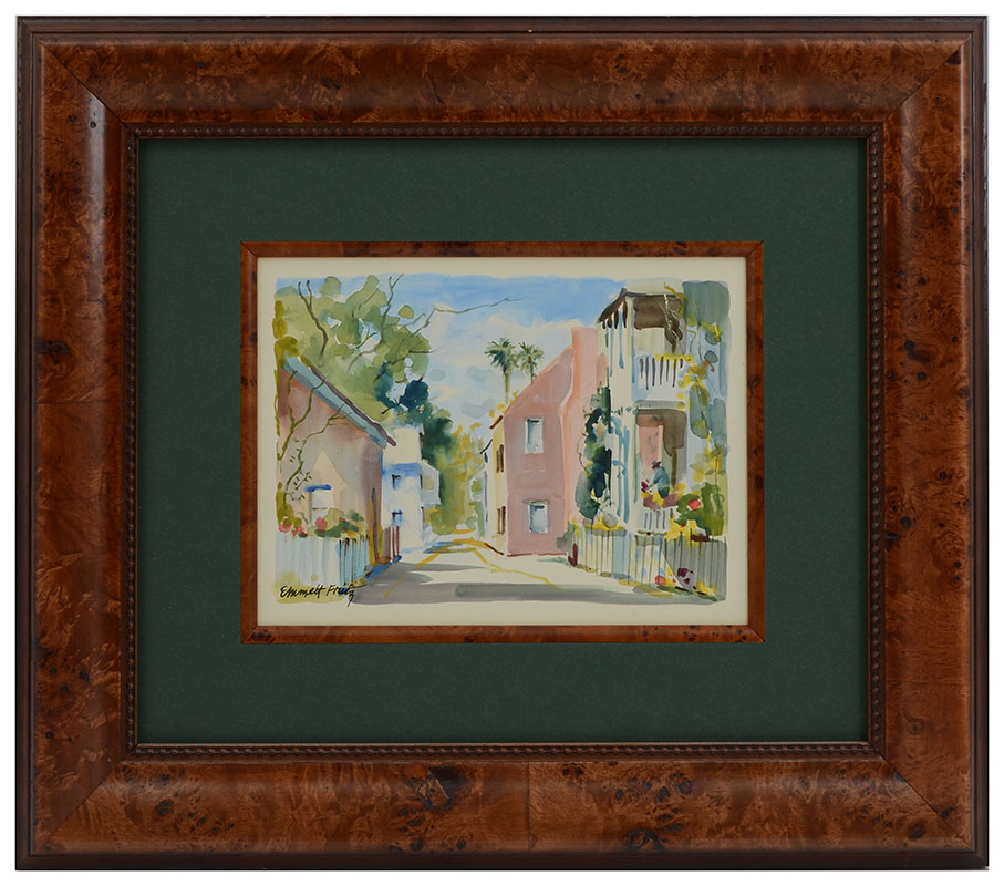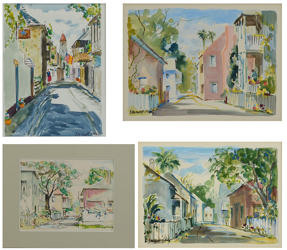 FRITZ, Emmett John, (American, 1917-1995): 4 Watercolors to include, 1) St. Augustine Street Scene, 8'' x10.5'', signed lower left, burl wood frame 18'' x 21'', 2) St. Augustine Street Scene with Figure, 9.5'' x 7.5'', signed lower right, framed 18'' x 15.25'', 3) St. George Street, 7.5'' x 9.5'', signed lower right, framed 21'' x 25'', 4) St. Augustine Street Scene, 8'' x 10.5'', signed lower left, burl wood frame, 18'' x 21''.