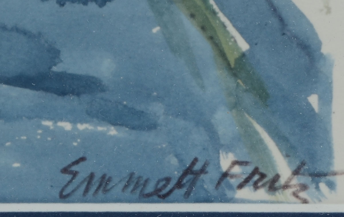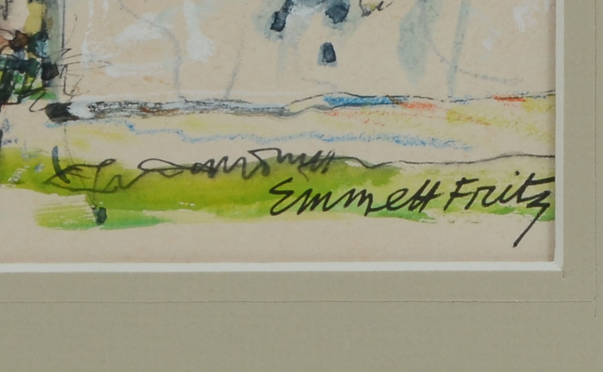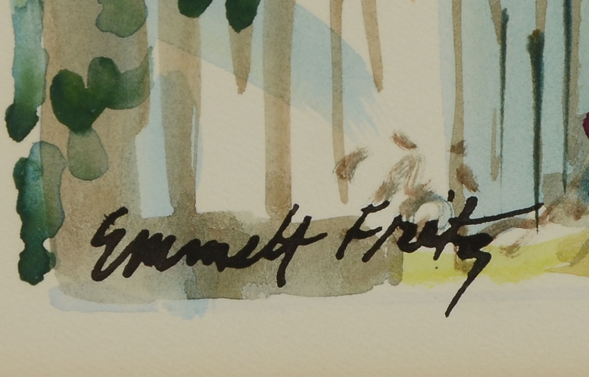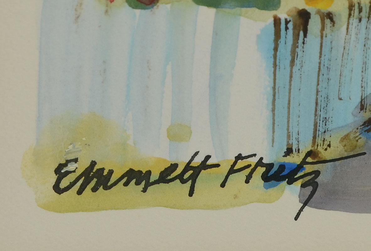 FRITZ, Emmett John, (American, 1917-1995): 4 Watercolors to include, 1) St. Augustine Street Scene, 8'' x10.5'', signed lower left, burl wood frame 18'' x 21'', 2) St. Augustine Street Scene with Figure, 9.5'' x 7.5'', signed lower right, framed 18'' x 15.25'', 3) St. George Street, 7.5'' x 9.5'', signed lower right, framed 21'' x 25'', 4) St. Augustine Street Scene, 8'' x 10.5'', signed lower left, burl wood frame, 18'' x 21''.