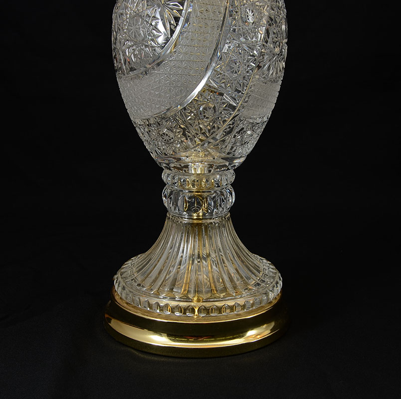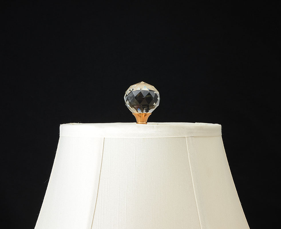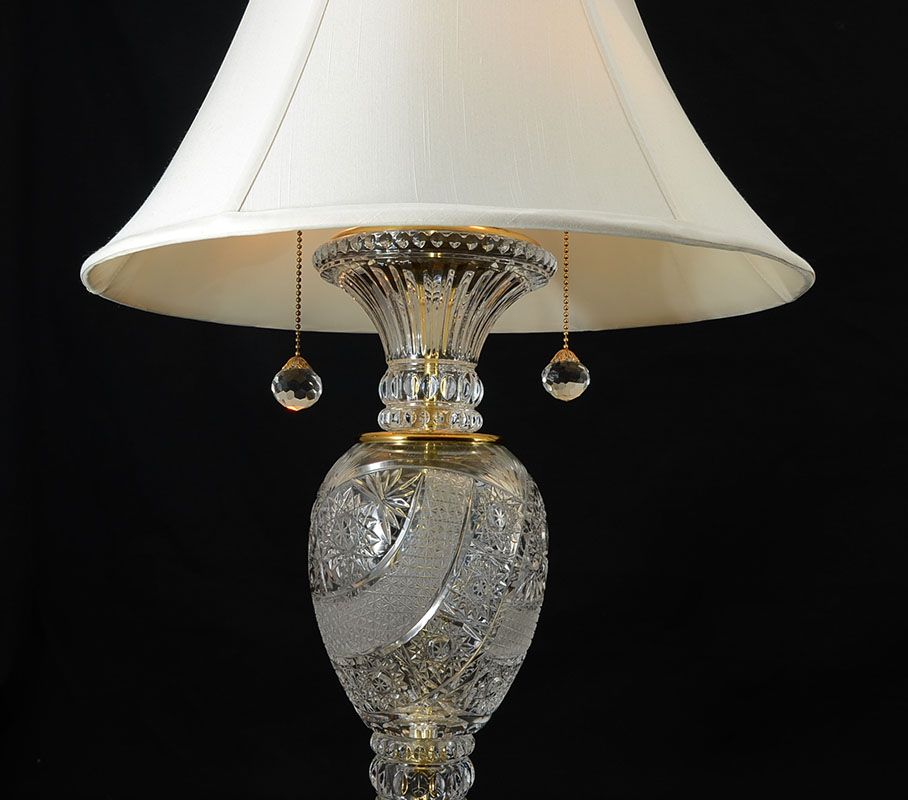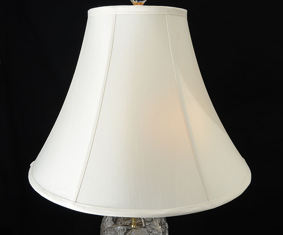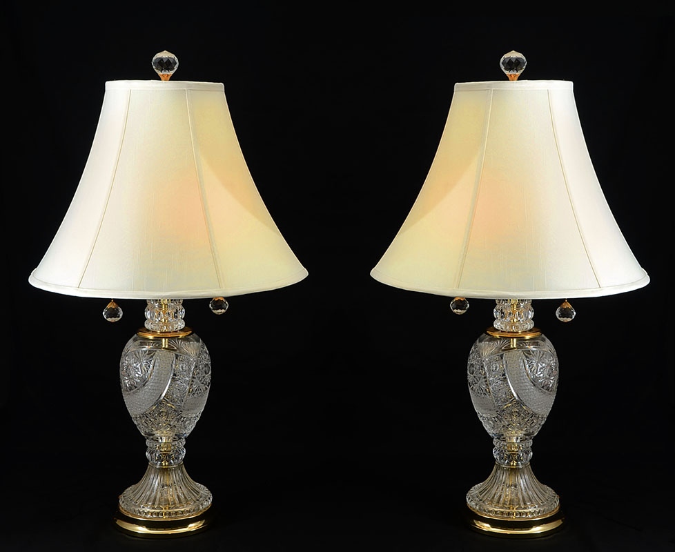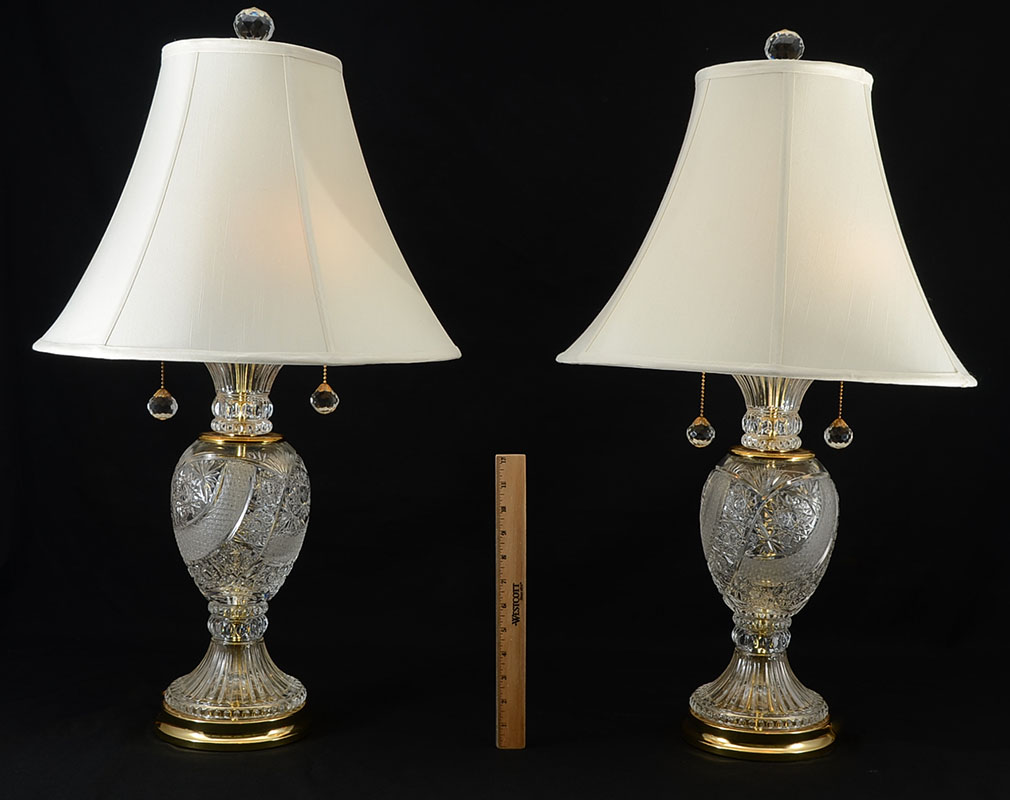 PAIR OF WATERFORD QUALITY CRYSTAL LAMPS: Cut crystal and brass bases, no visible markings, double socket fixture with faceted crystal ball pulls, faceted finial. Measure 29 1/2'' h. x 6 1/2''. Sold with cloth shade 12 1/4'' h. x 17'' dia.