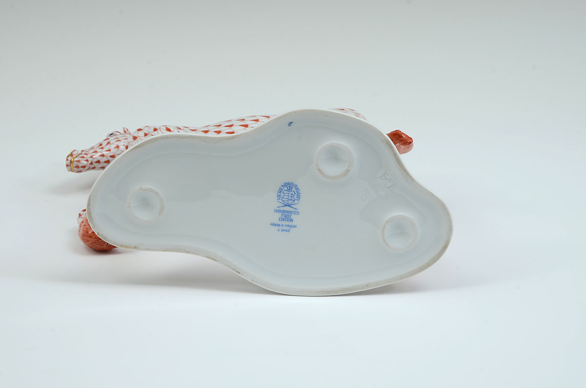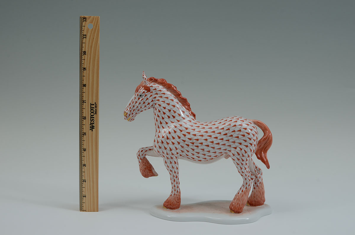 HEREND RUST FISHNET CLYDESDALE HORSE FIGURINE: Herend porcelain figure of a Clydesdale with on foot raised, marked first edition, overall 9'' h. x 9 3/4''.