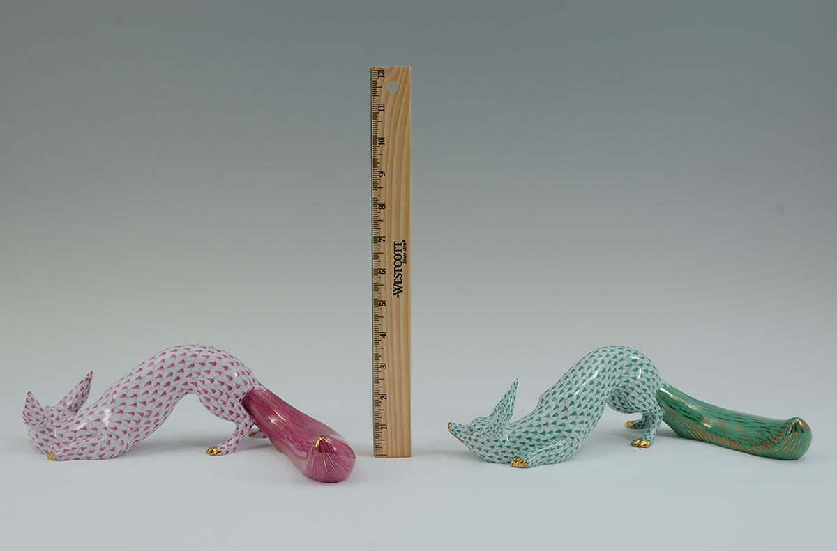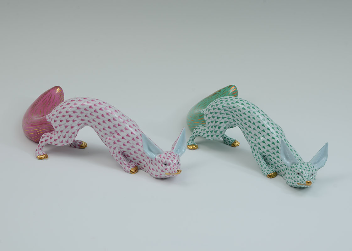 2 HEREND FISHNET FOX FIGURINES GREEN & RASPBERRY: 2 fishnet porcelain figures of foxes to include a green fishnet and raspberry fishnet, measure 3 1/4'' h. x 11 3/4''.