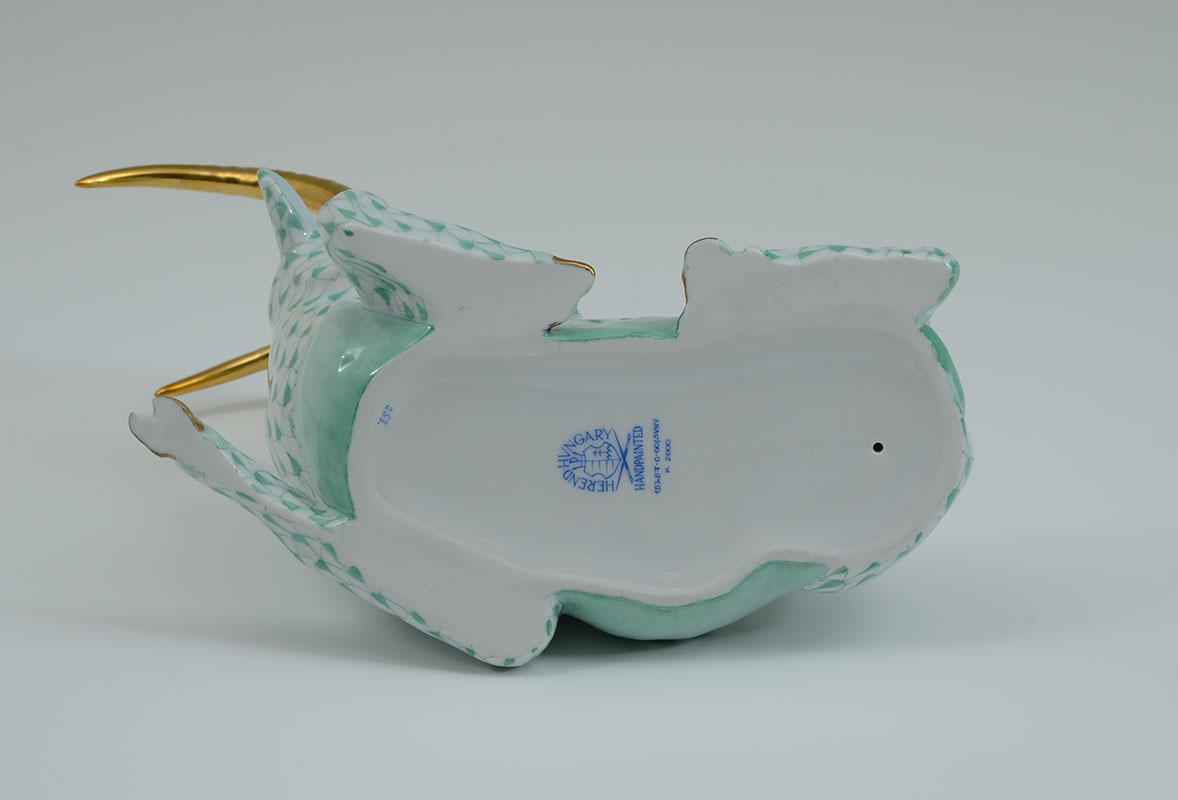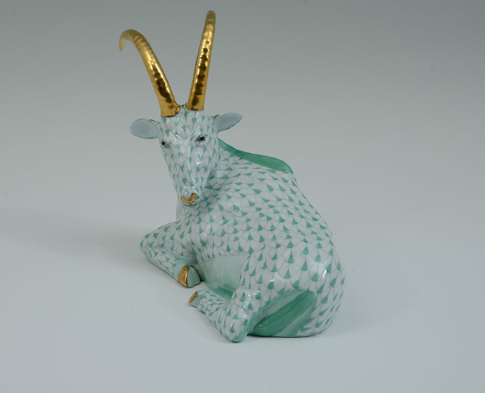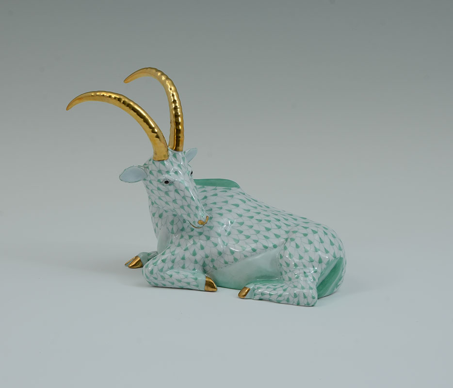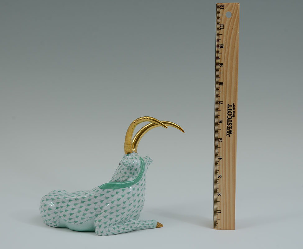 HEREND GREEN FISHNET ANTELOPE PORCELAIN FIGURINE: Green fishnet figure of a recumbent antelope with gilt horns, 6 1/4'' h. x 8''.