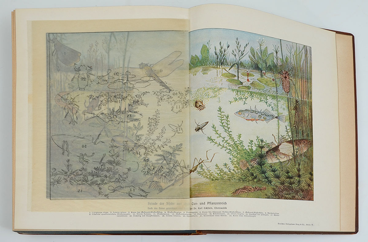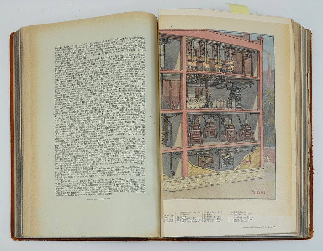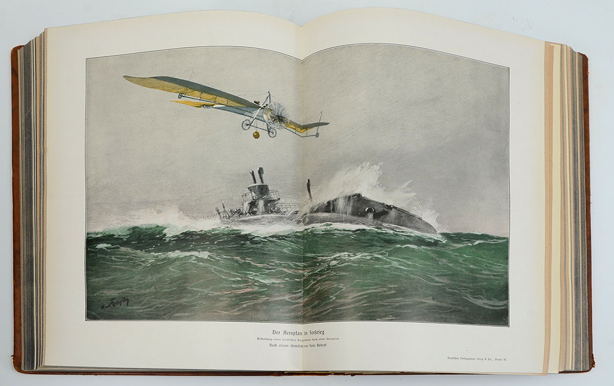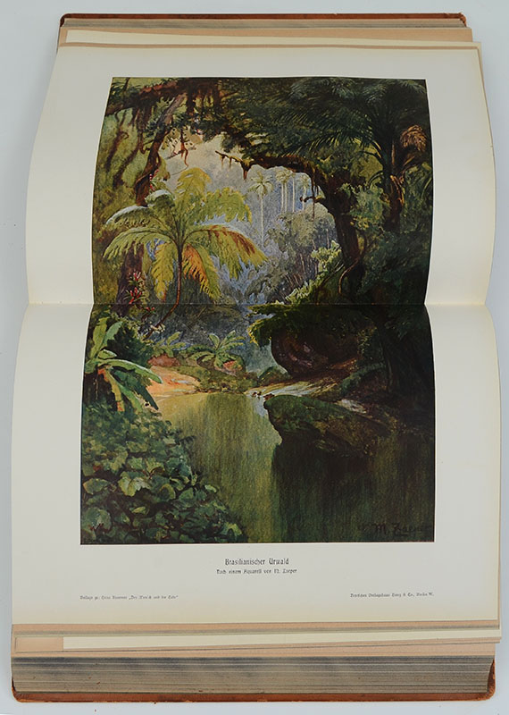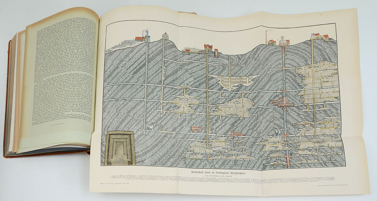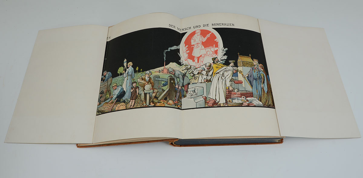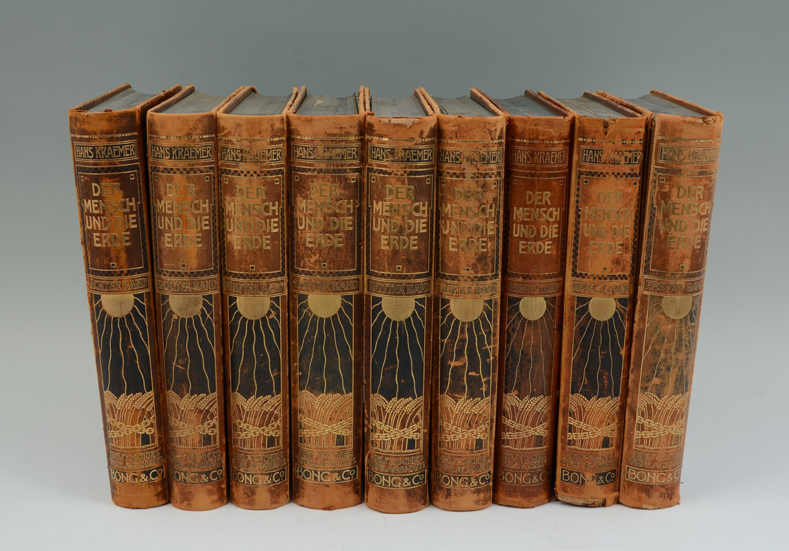 9 LEATHER BOUND DER MENSCH UND DIE ERDE BOOKS: Full title ''Der Mensch Und Die Erde'', by Hans Kraemer, published 1906, Deutiches Verlagshaus Bong & Co., Germany. Embossed full leather covers with gilt accents. Cover with raised Atlas holding the world, bordered by raised panels. Interiors with multiple pull out prints. 9 volumes of a 10 volume set, missing volume 10. 11 1/2'' x 8 1/2'' x 1 1/2''.