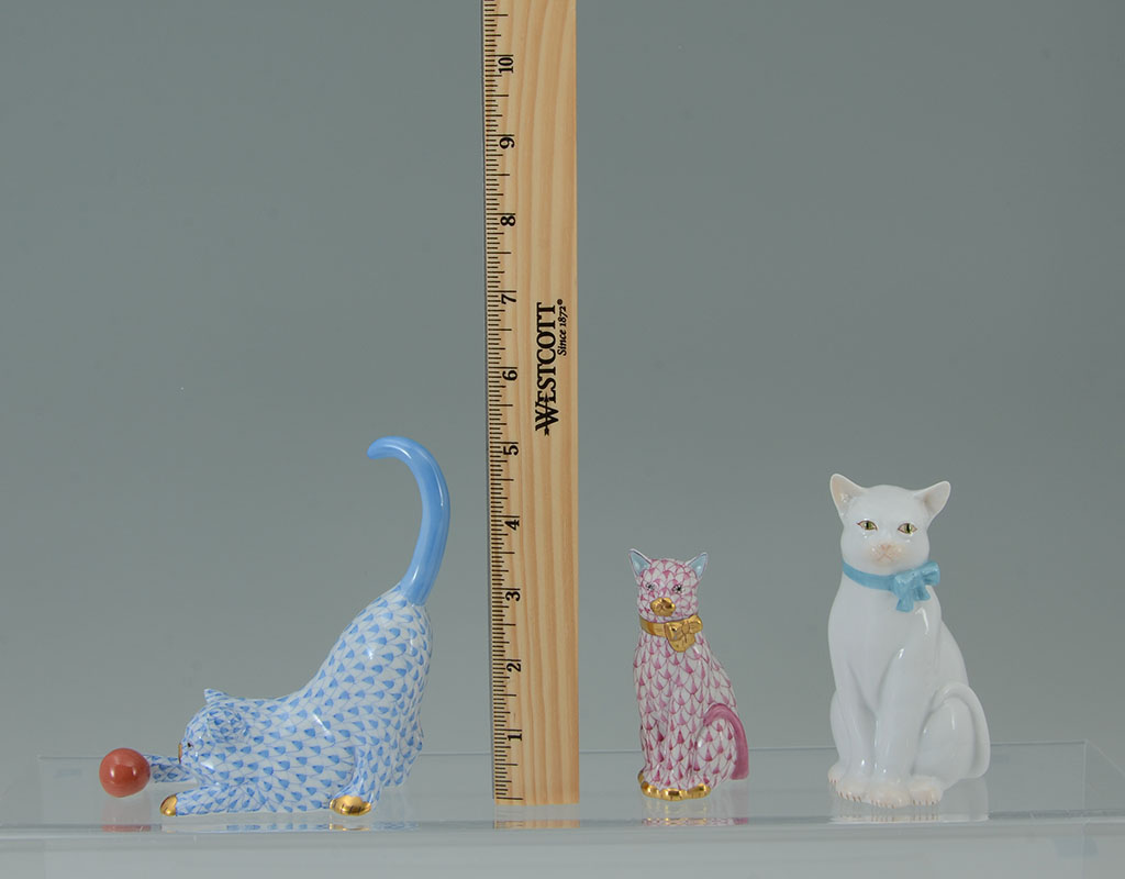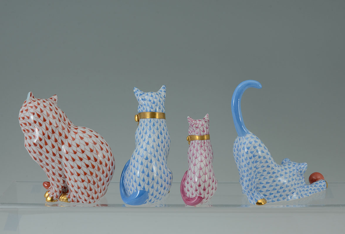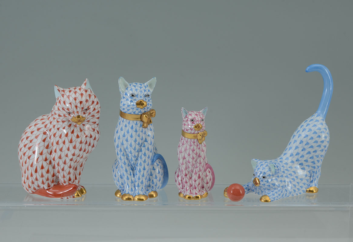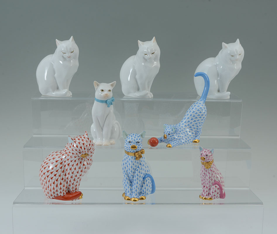 8 HEREND PORCELAIN CAT FIGURINES: An assembled collection of 8 total by Herend to include 1-3) White seated cats with decorated eyes, 4 1/2'' h. 2) Rust fishnet seated cat, 4 1/2''. 5) Blue fishnet seated cat, 4 3/4'' h. 6) Small raspberry fishnet seated cat, 3 1/2'' h. 7) Blue fishnet cat playing with ball, 5 1/8'' h. 8) White seated cat with blue bow, 4 1/2'' h.