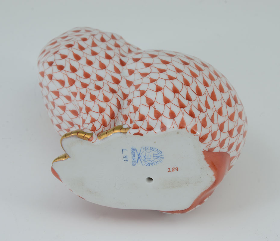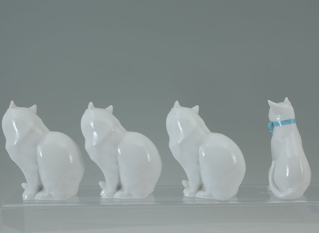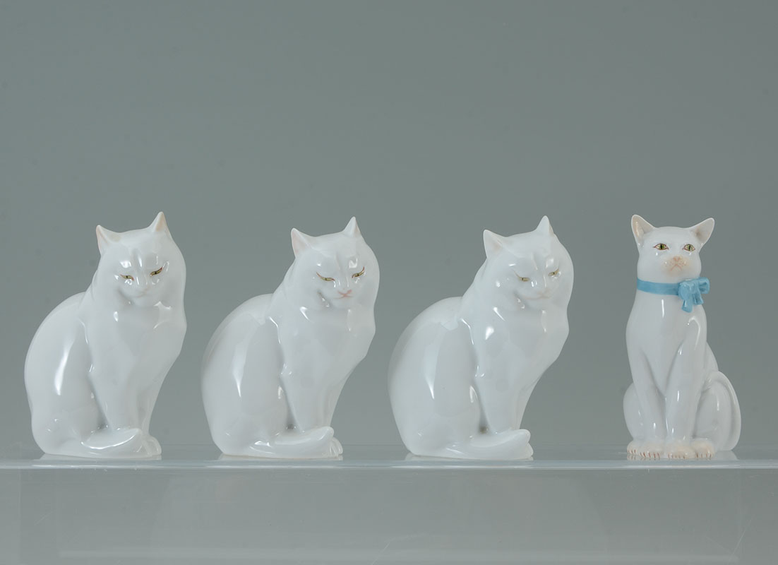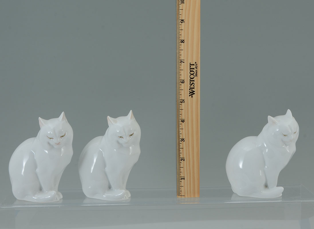 8 HEREND PORCELAIN CAT FIGURINES: An assembled collection of 8 total by Herend to include 1-3) White seated cats with decorated eyes, 4 1/2'' h. 2) Rust fishnet seated cat, 4 1/2''. 5) Blue fishnet seated cat, 4 3/4'' h. 6) Small raspberry fishnet seated cat, 3 1/2'' h. 7) Blue fishnet cat playing with ball, 5 1/8'' h. 8) White seated cat with blue bow, 4 1/2'' h.