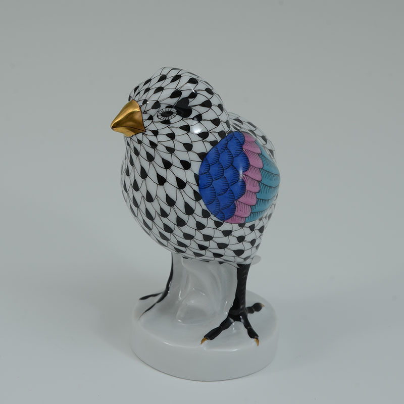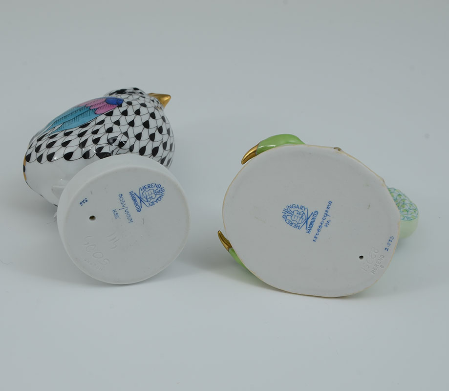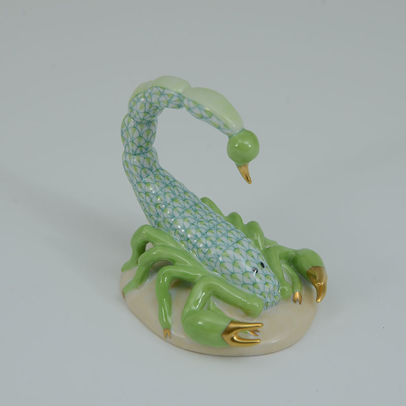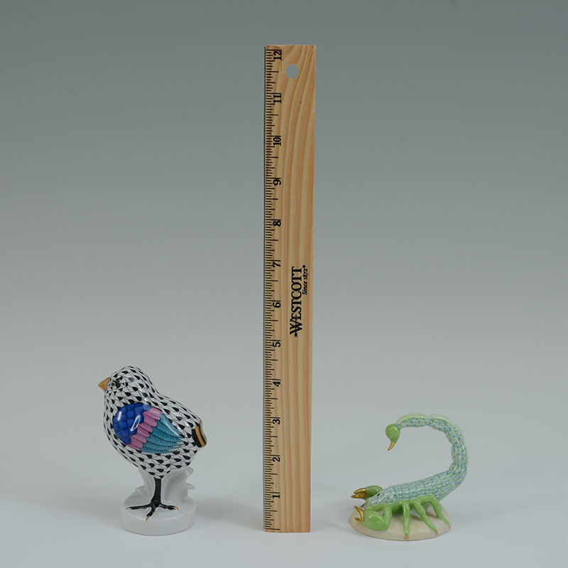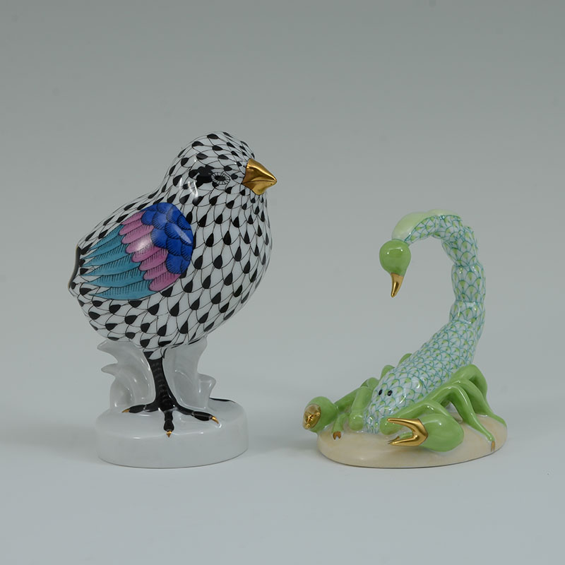 HEREND BLACK FISHNET CHICK & KEY LIME SCORPION: 2 porcelain figurines by Herend to include 1) Black fishnet chick with polychrome wings, 4'' h. 2) Key lime fishnet scorpion, 3'' h.