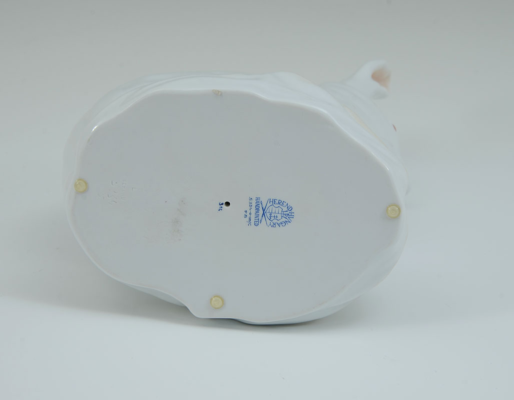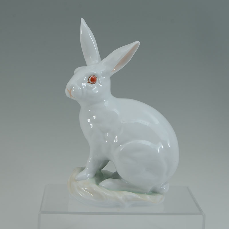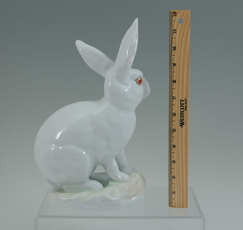 LARGE HEREND WHITE PORCELAIN RABBIT FIGURINE: White rabbit with red eyes and hints of green at feet, 11 1/2'' h. x 7 1/2''.