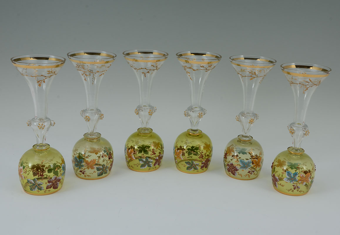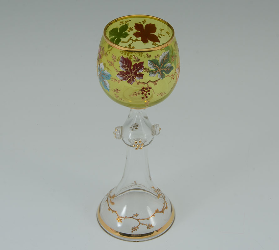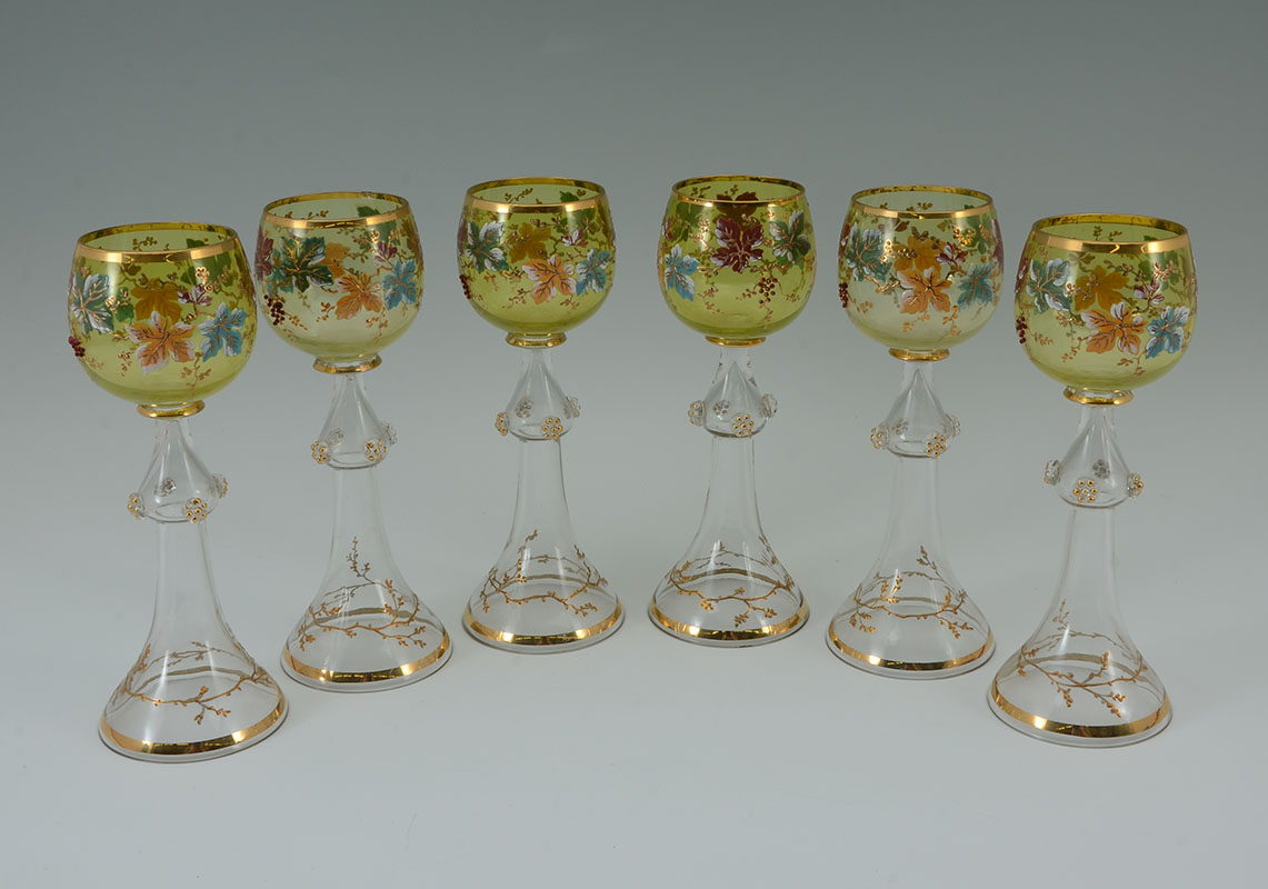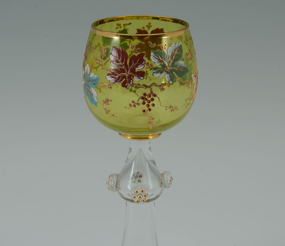 6 MOSER QUALITY FLORAL MOTIF WINE GLASSES: 6 Bohemian glass wine stems, light green bowl with enameled leaf and vine motifs. Hollow stem, flared foot with gilt branch design, 8 1/2'' h. x 3 1/4''.