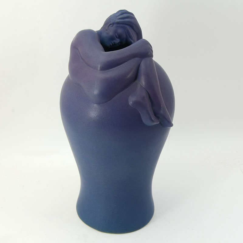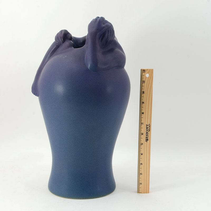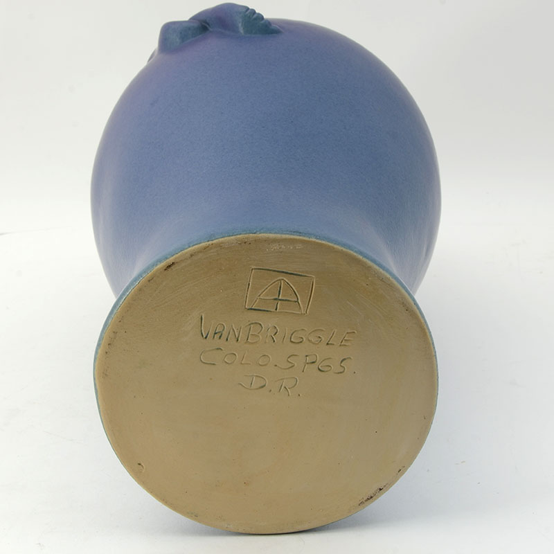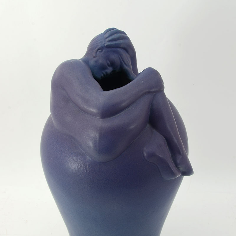LARGE VAN BRIGGLE DESPONDENCY VASE: Later 20th century production, purple / lavender glaze, figure of a despondent man at rim, etched marks on base with potter mark DR. Overall measure 17'' h. x 8 3/4''.