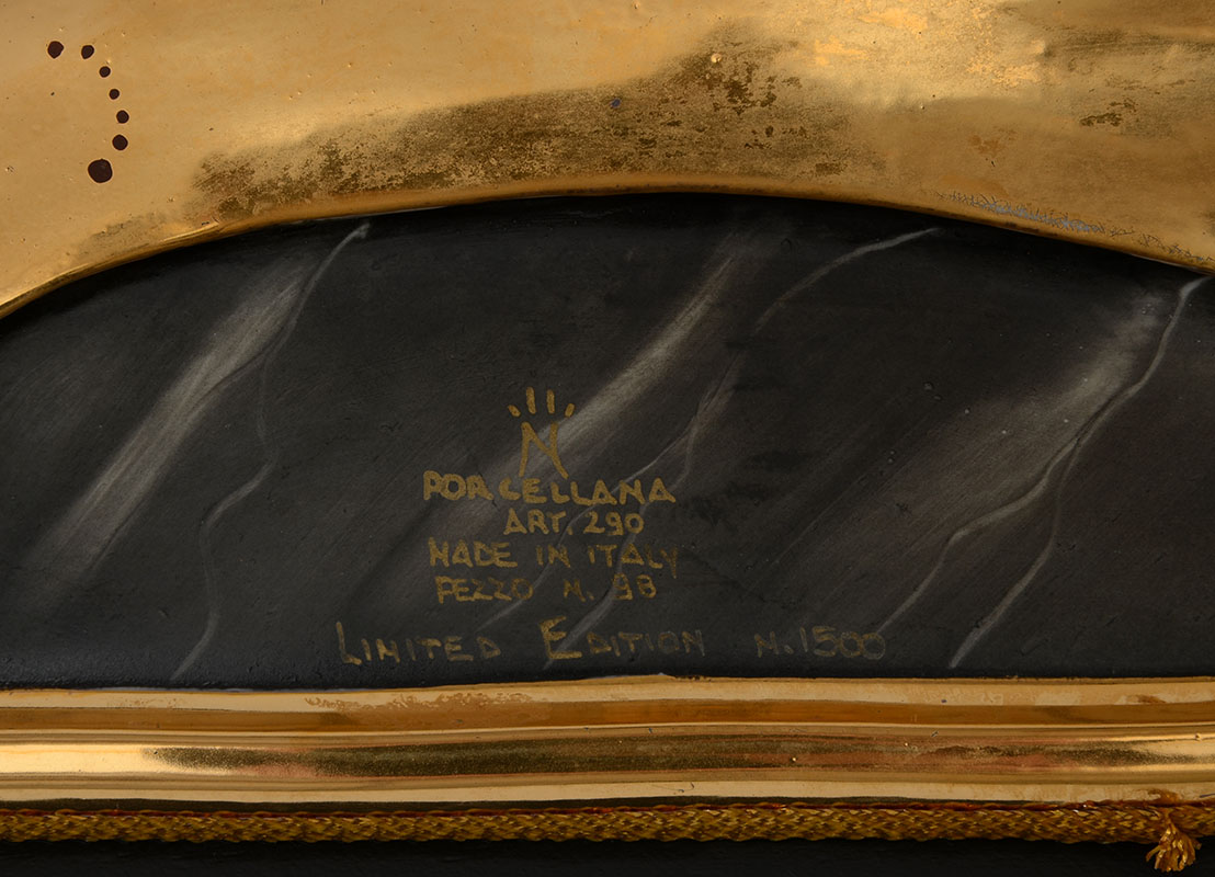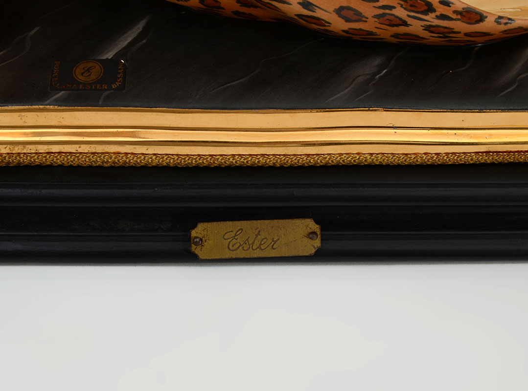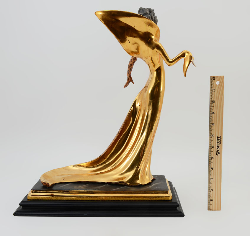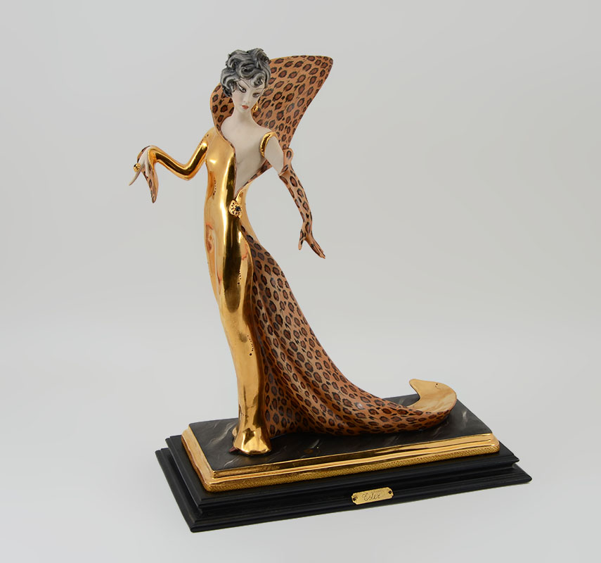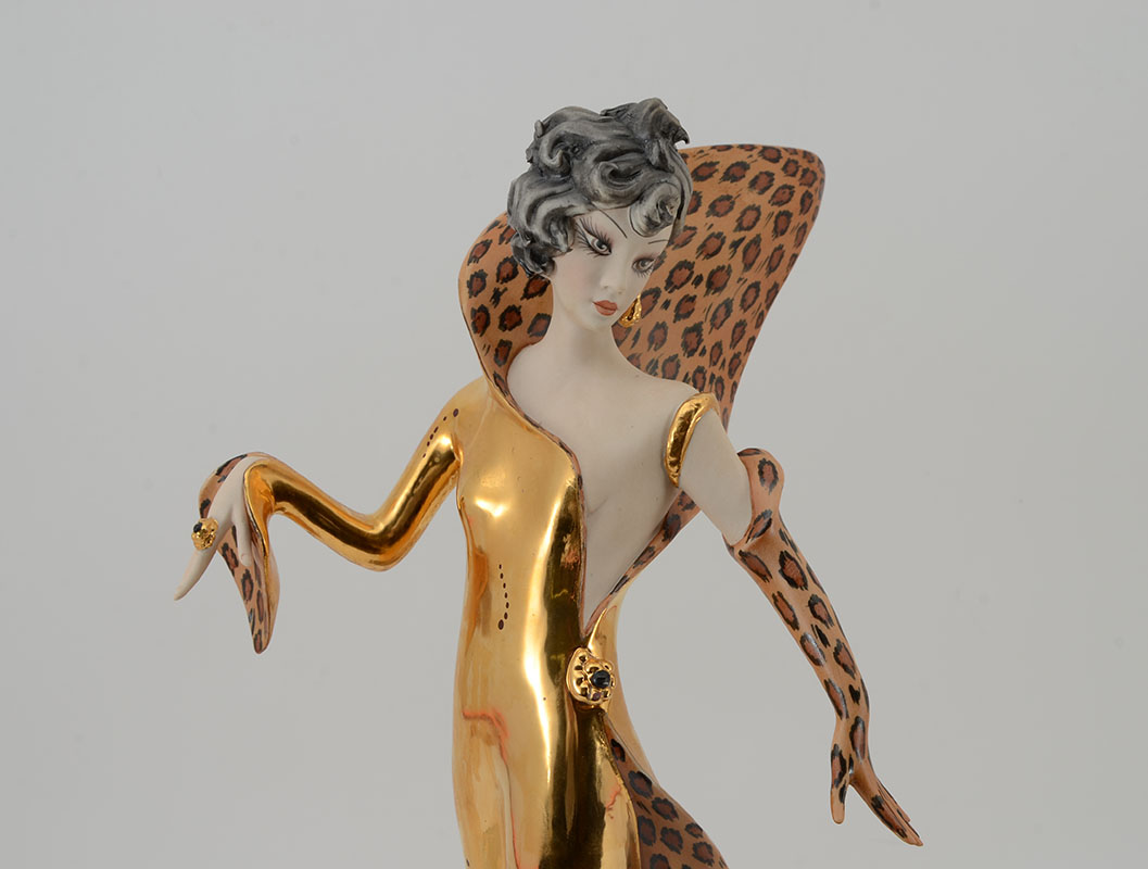 CAPODIMONTE ESTER BASSANO PORCELAIN DECO WOMAN FIGURE: Capodimonte porcelain figure of art deco style woman with flowing cheetah pattern and gilt dress on composite base. Marked on base, measures 18 1/2'' h. x 14 3/4'' x 7 1/2''.