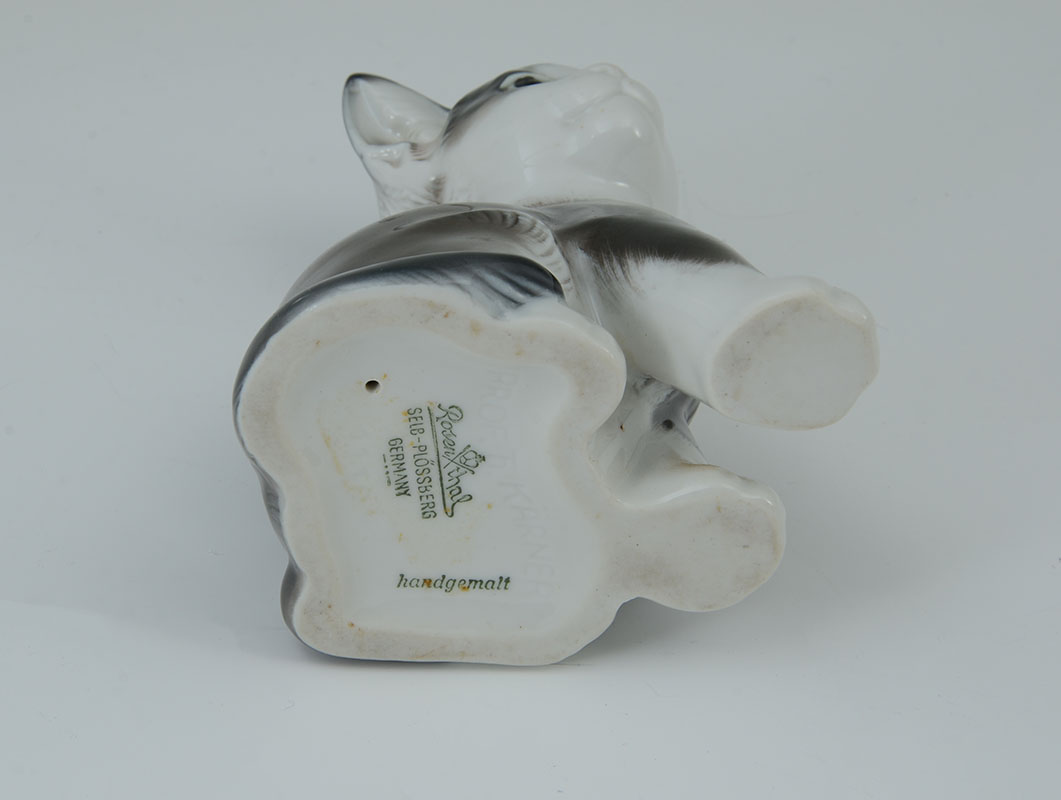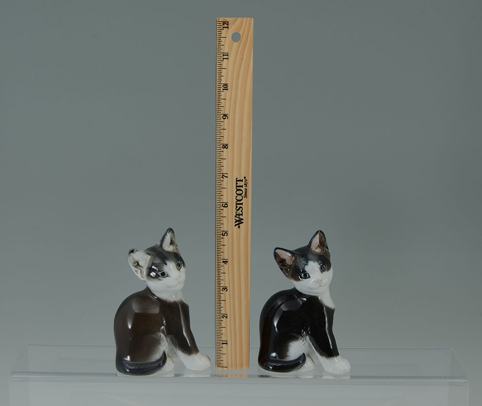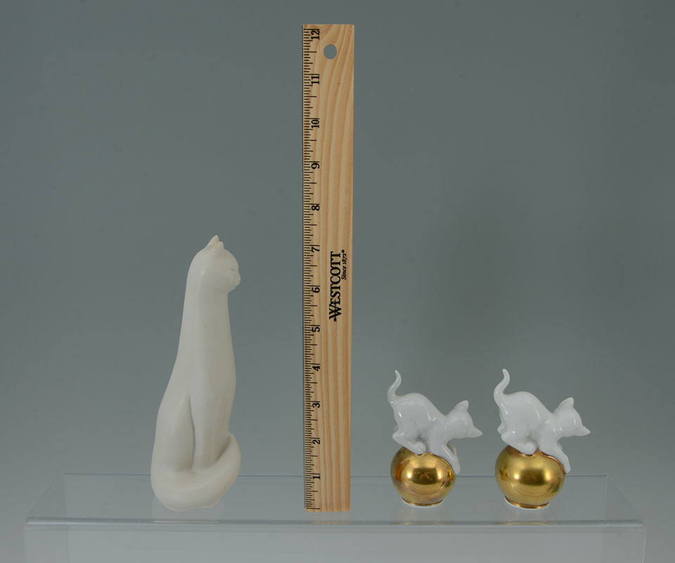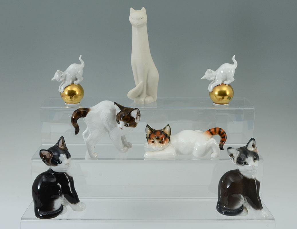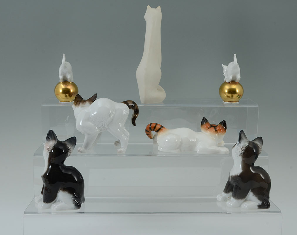 7 ROSENTHAL PORCELAIN CAT FIGURINES: An assembled collection of 7 pieces total, each by Rosenthal, assorted poses, colors and sizes, tallest 7'' h., small cats on globes 3 1/2'' h.