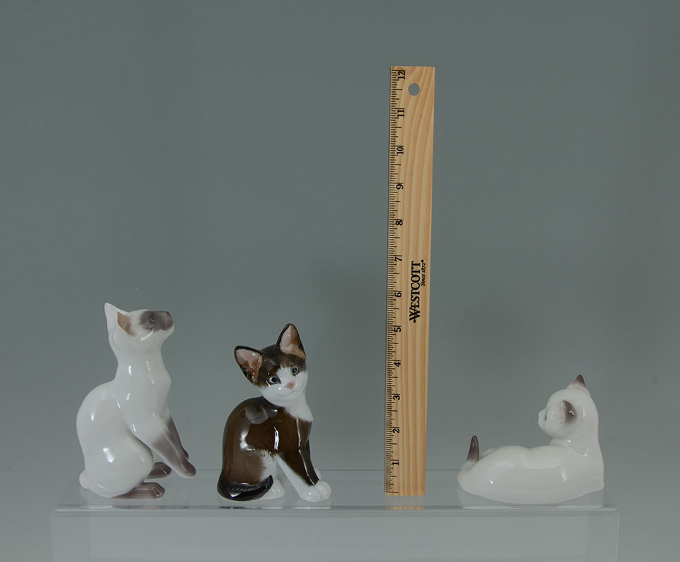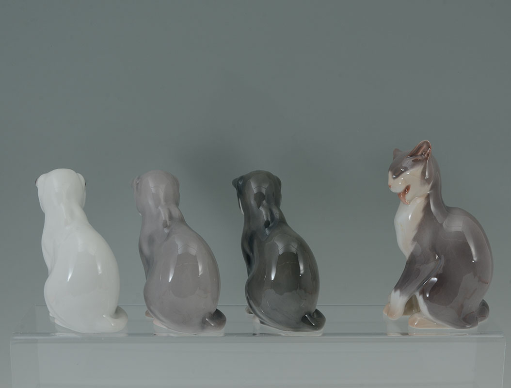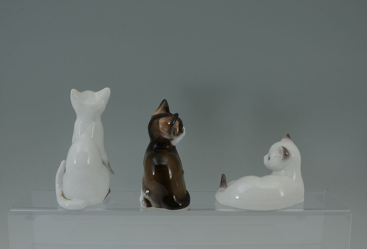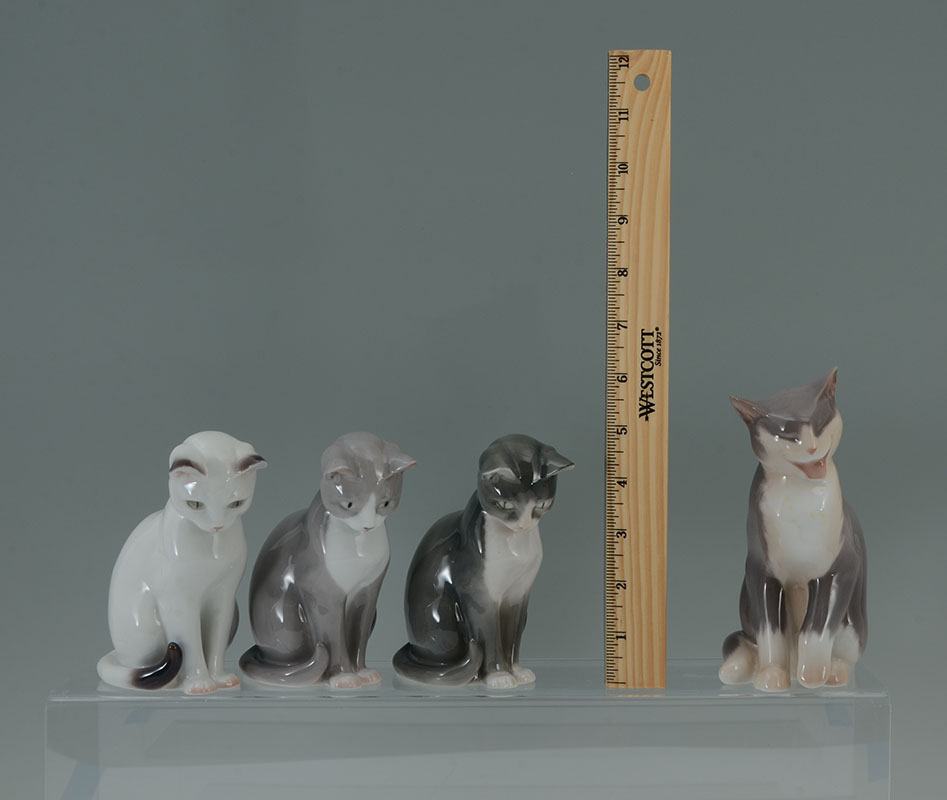 7 BING & GRONDAHL PORCELAIN CAT FIGURINES: An assembled collection of 7 pieces total, each by Bing & Grondahl, various poses and colors, tallest 6 1/4'' h., recumbent cat 4 1/2'' long.