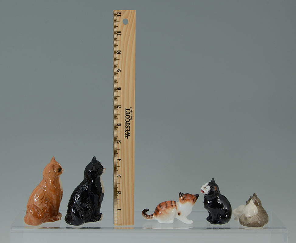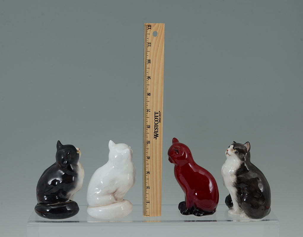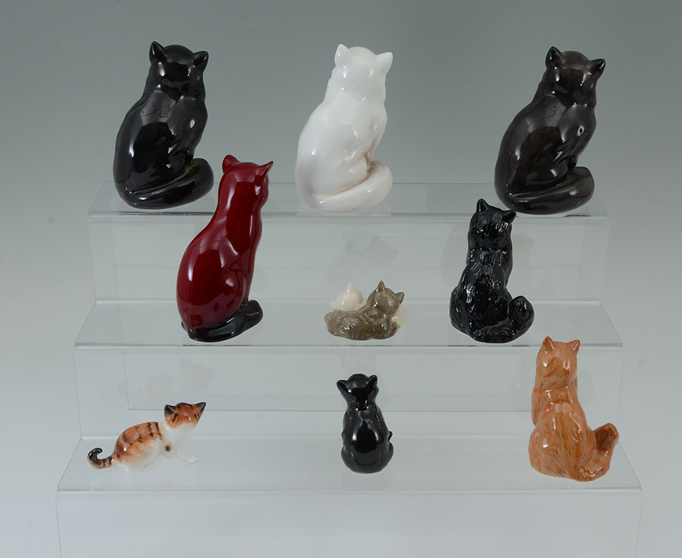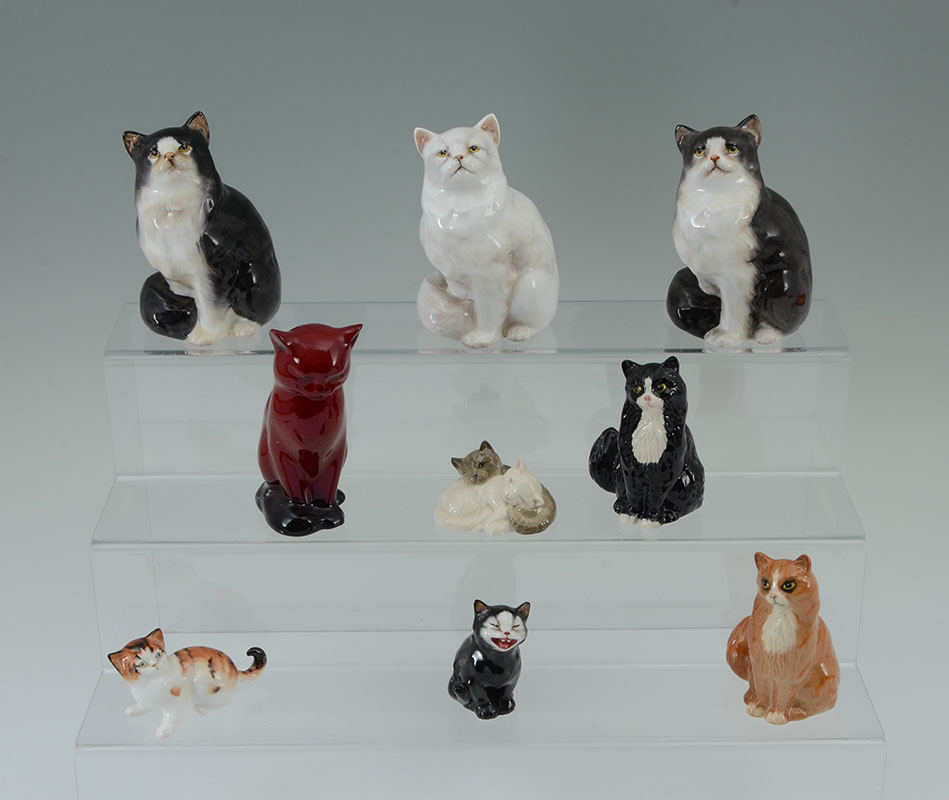 9 ROYAL DOULTON PORCELAIN CAT FIGURINES: An assembled collection of 9 pieces total, all Royal Doulton, various breeds, poses, and colors to include a flambe cat. Largest 4 3/4'' h. x 3 1/4'', smallest 2 cats sleeping, 2 1/2''.
