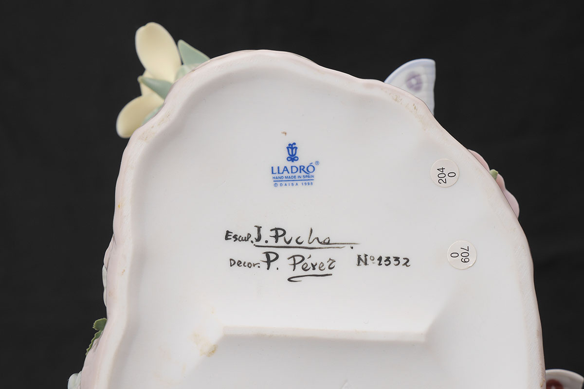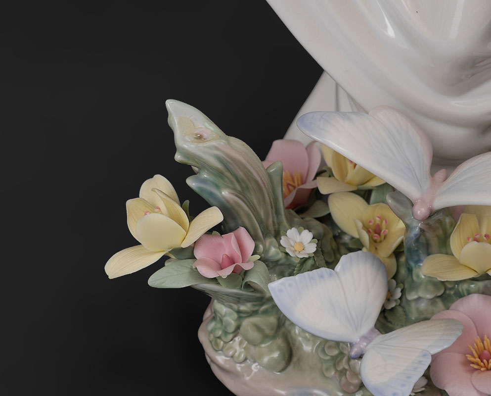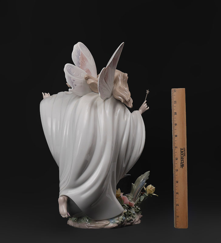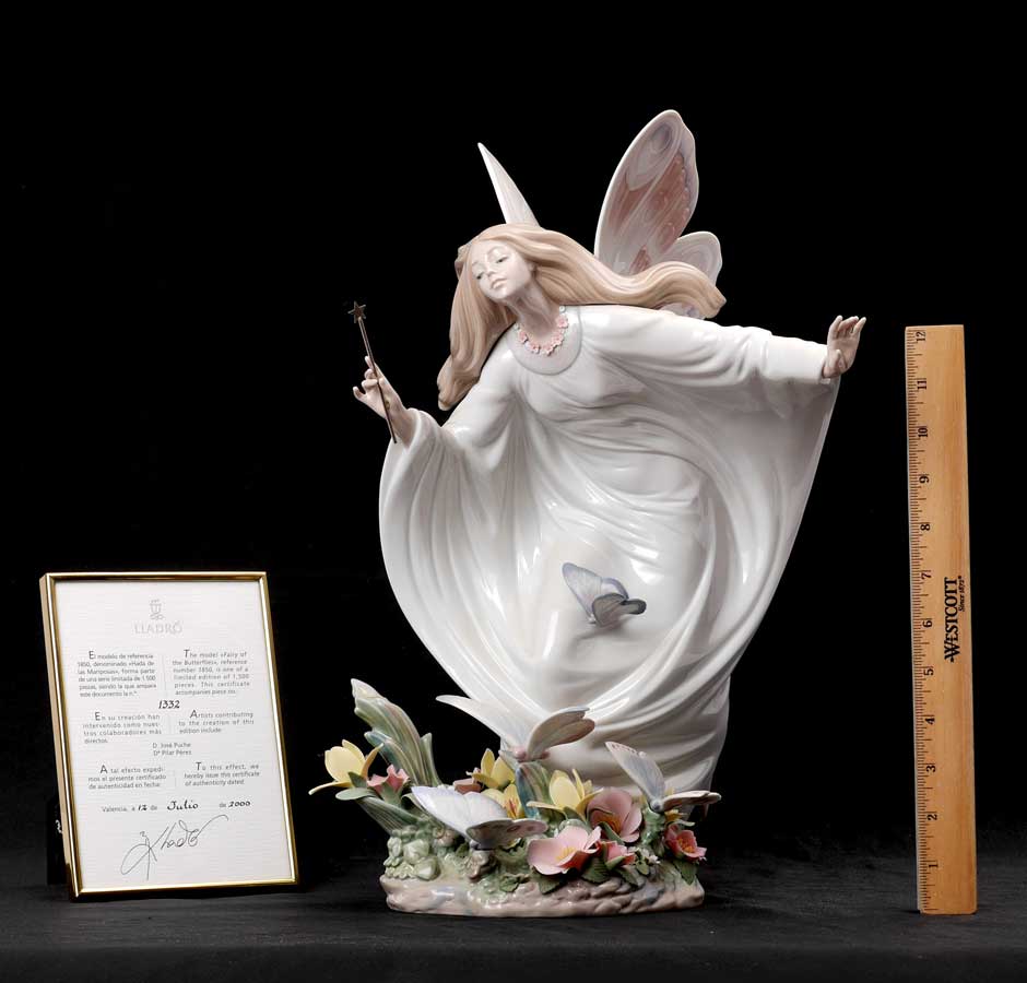 LLADRO 1850 FAIRY OF THE BUTTERFLIES PORCELAIN FIGURE: Glazed finish figure of a winged fairy holding a wand with butterflies and flowers, Spanish name ''Hada de las Mariposas'', limited edition 1332/1500, issued 1999, retired 2000, designed by Jose Puche, 16 3/4'' h. x 11 1/2'' x 11 1/2''. No box, sold with COA.