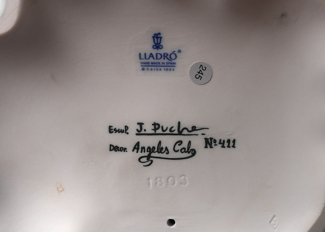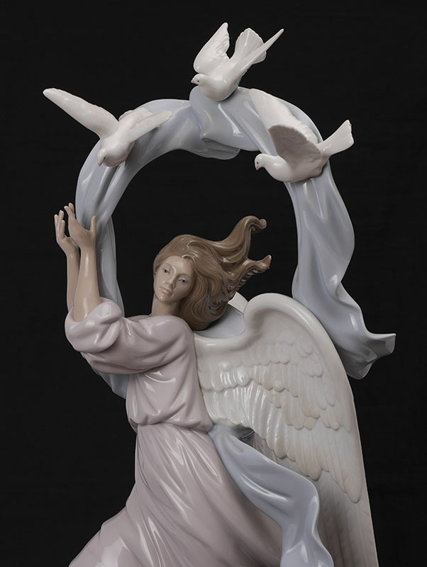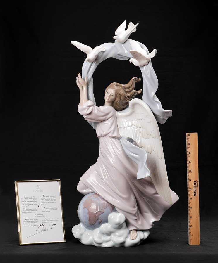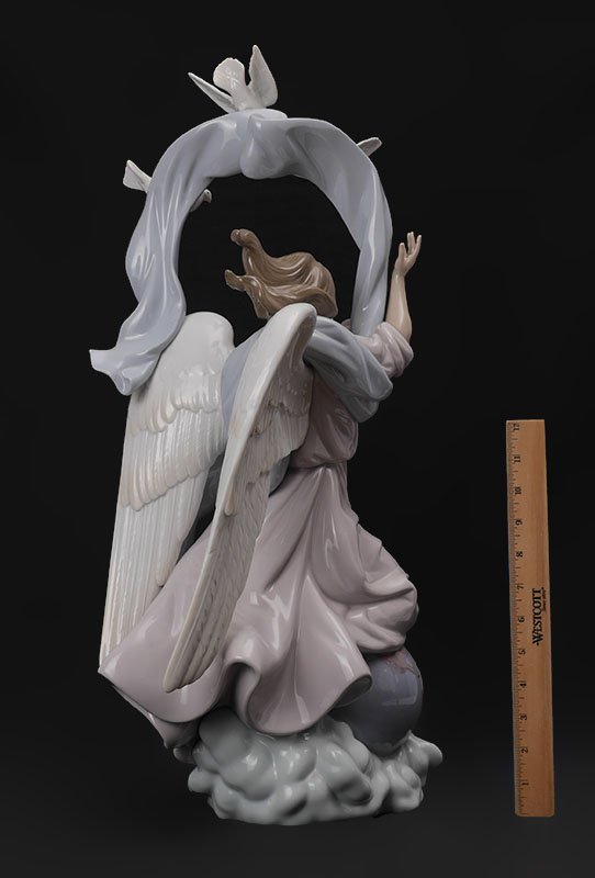 LLADRO 1803 VISION OF PEACE FIGURAL GROUP: Glazed finish porcelain figure of an angel standing on the Earth and cloud with doves and flowing ribbon above, Spanish name ''Angel de la Paz'', limited edition 411/1500, issued 1995, retired 2003, designed by Jose Puche, 24 1/2'' h. x 11 1/2'' x 10 1/2''. No box, sold with COA.