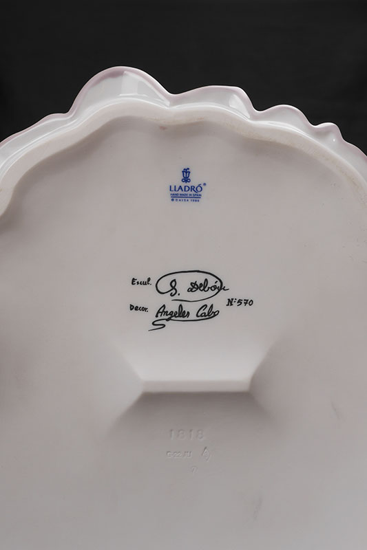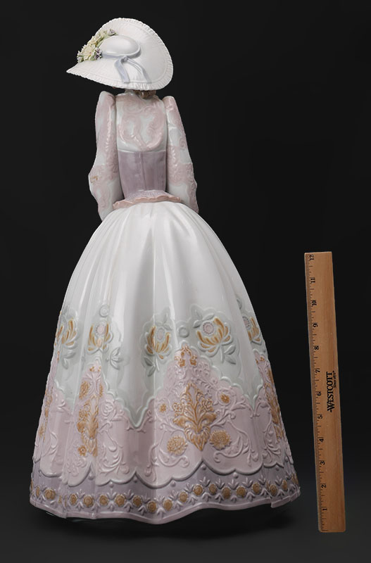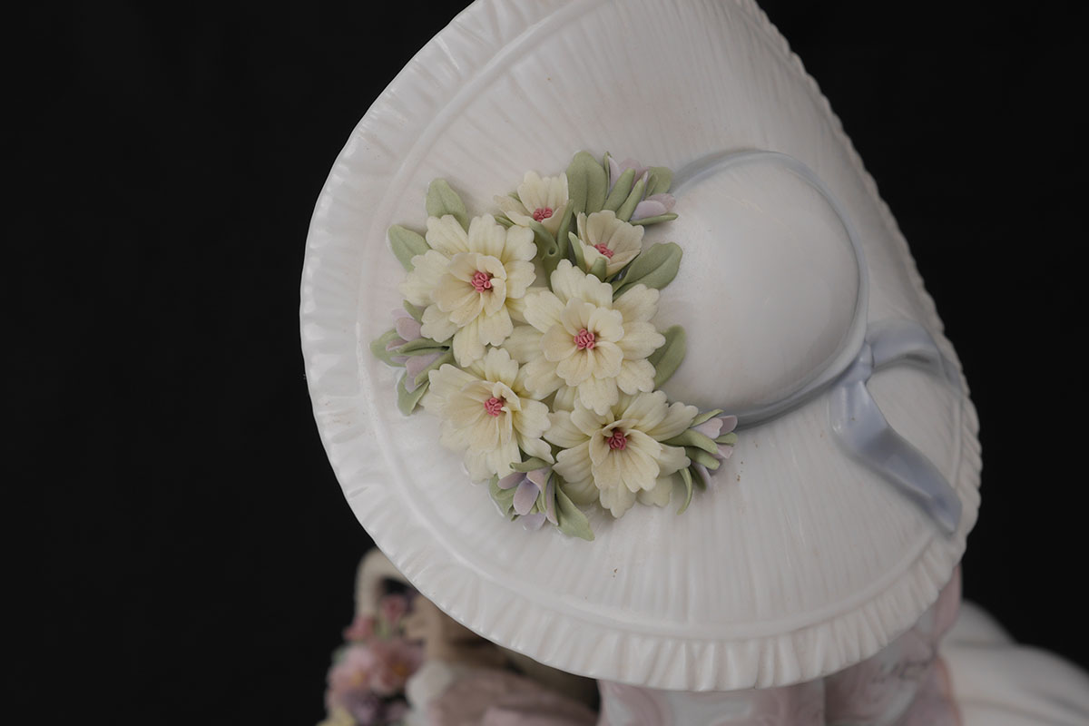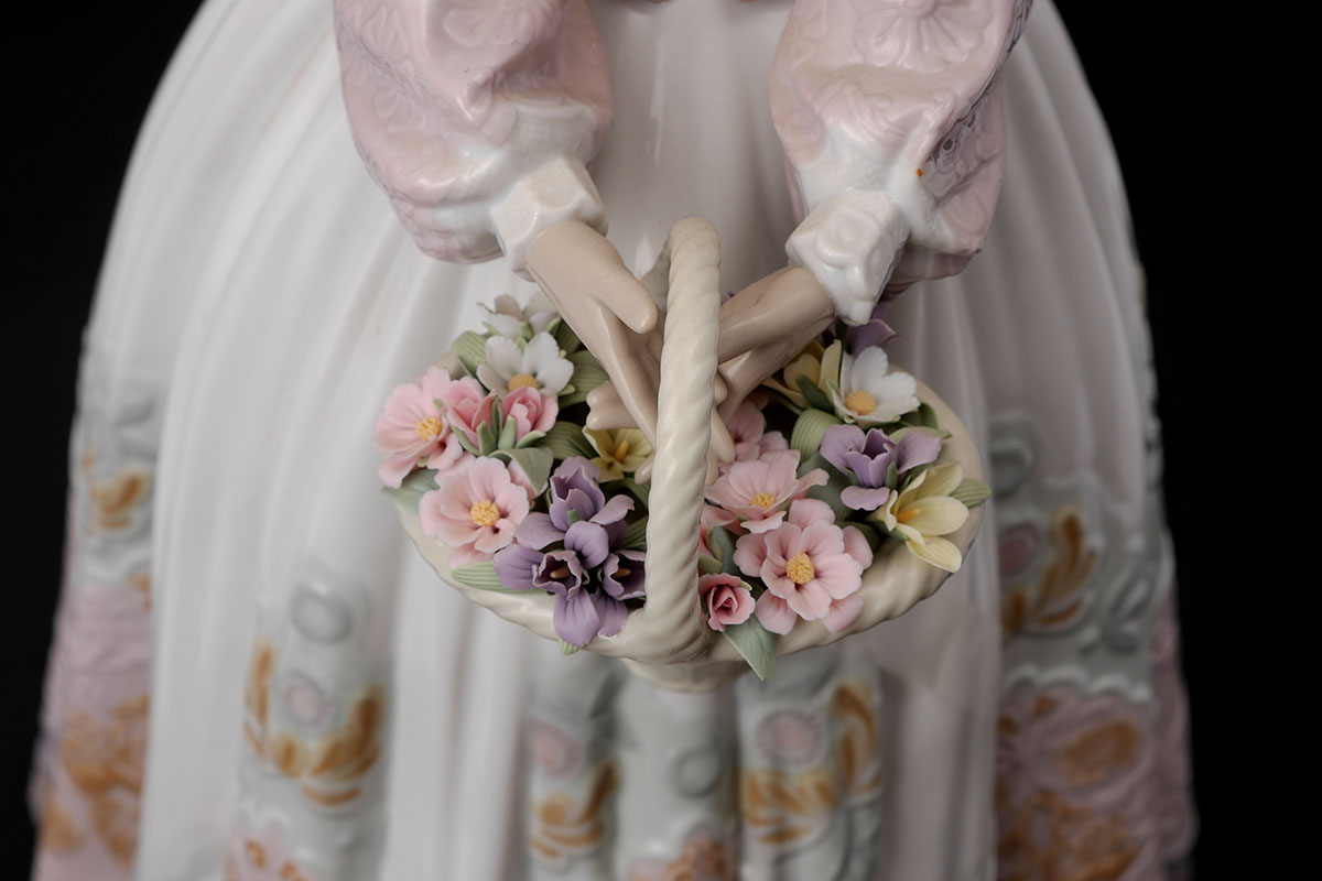 LLADRO 1818 SPRING COURTSHIP PORCELAIN FIGURE: Glazed finish large figure of a maiden holding a basket of flowers, Spanish name ''Primavera Elegante'', limited edition 570/1500, issued 1997, retired 2000, designed by Salvador Debon, 23 1/2'' h. x 12'' dia. No box.