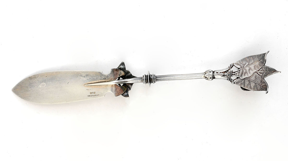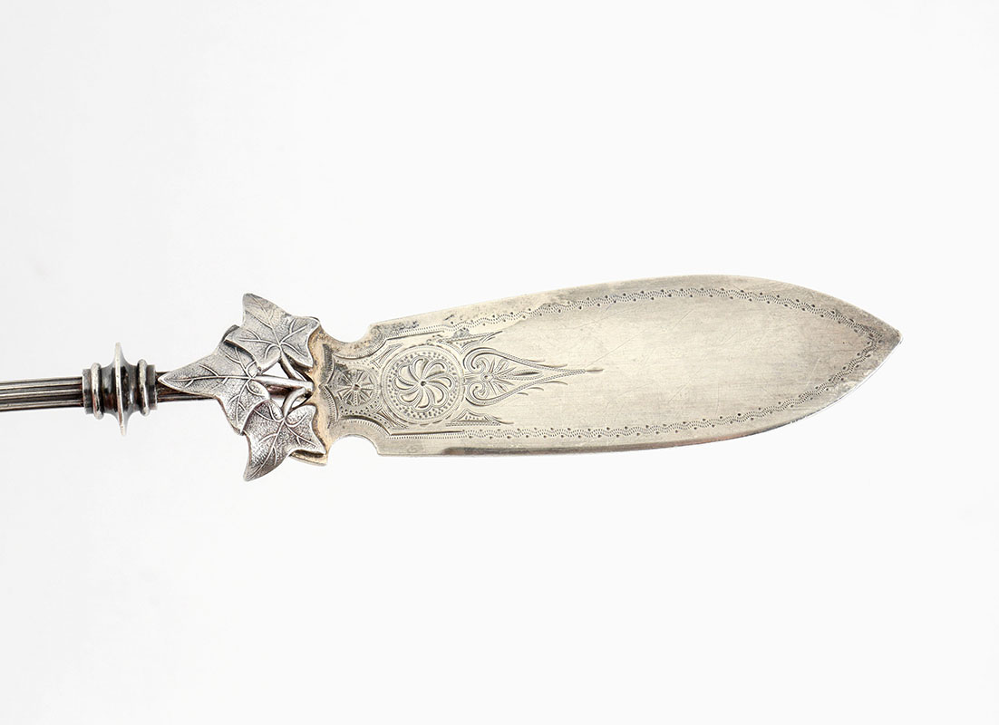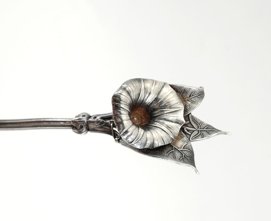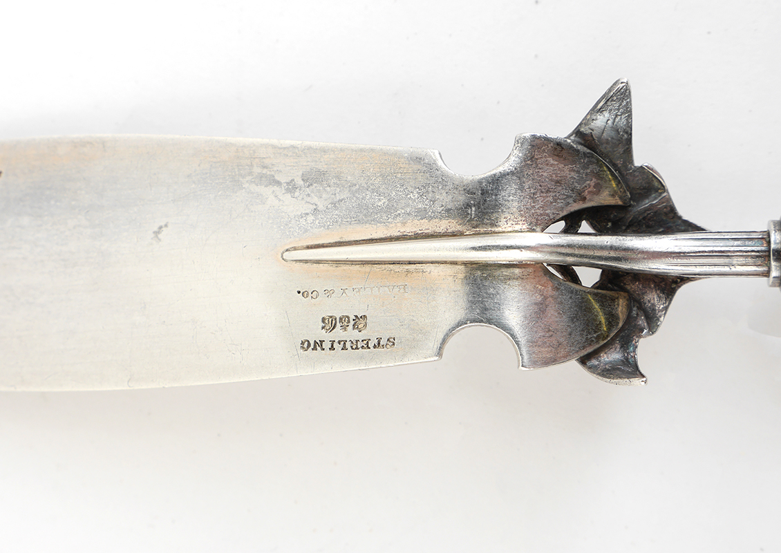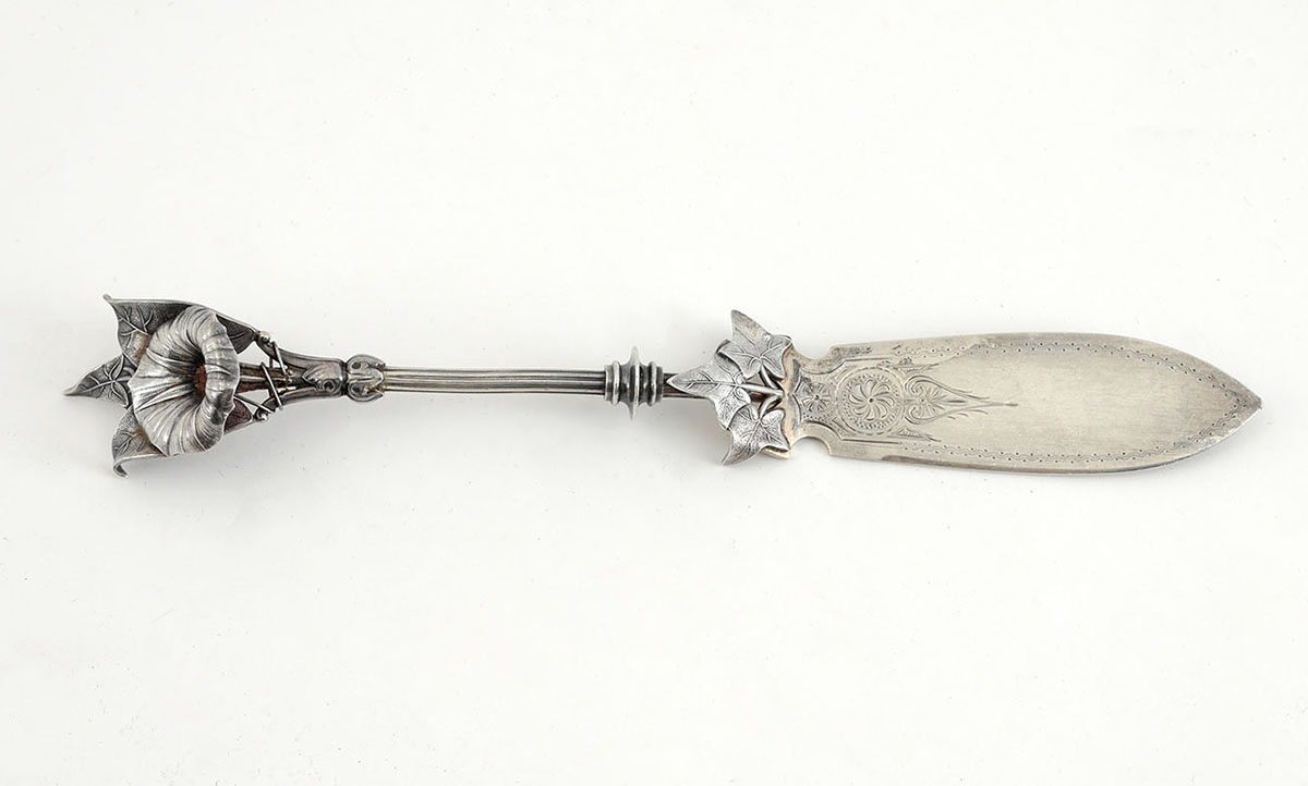 GORHAM MORNING GLORY MASTER BUTTER KNIFE: Circa 1865, master butter knife in the Morning Glory pattern by Gorham, retailed by Bailey & Co. Engraved blade, figural flower ferrule, overall 8 1/2'' long. Approx. 1.9 troy oz.