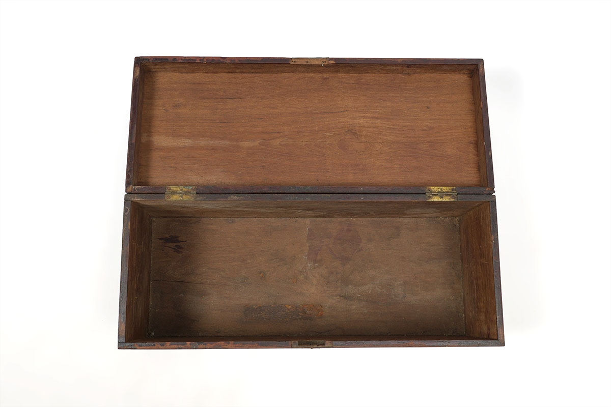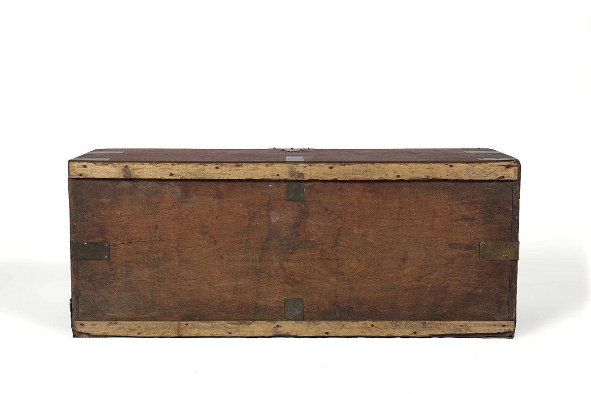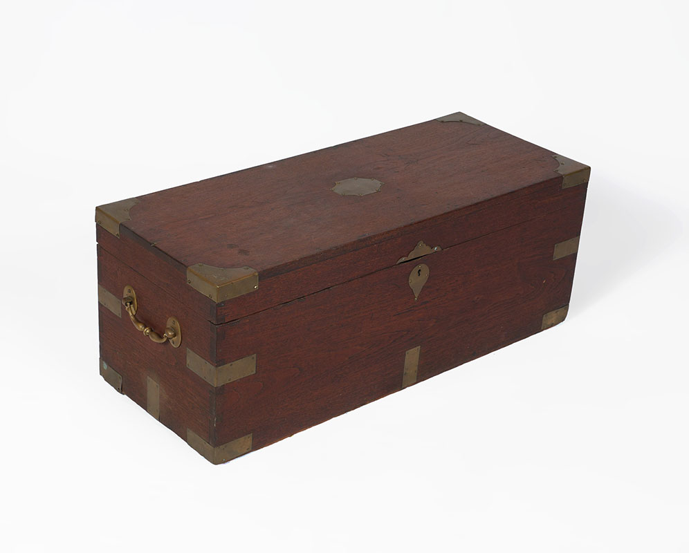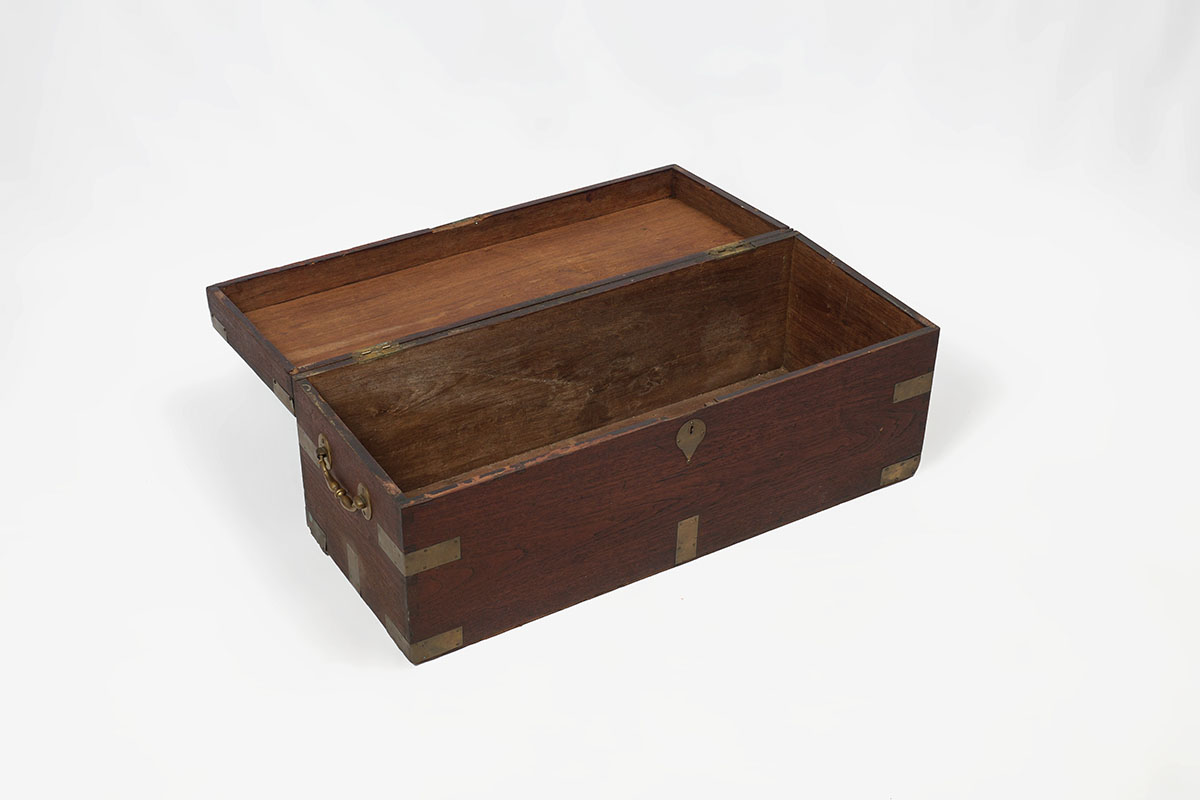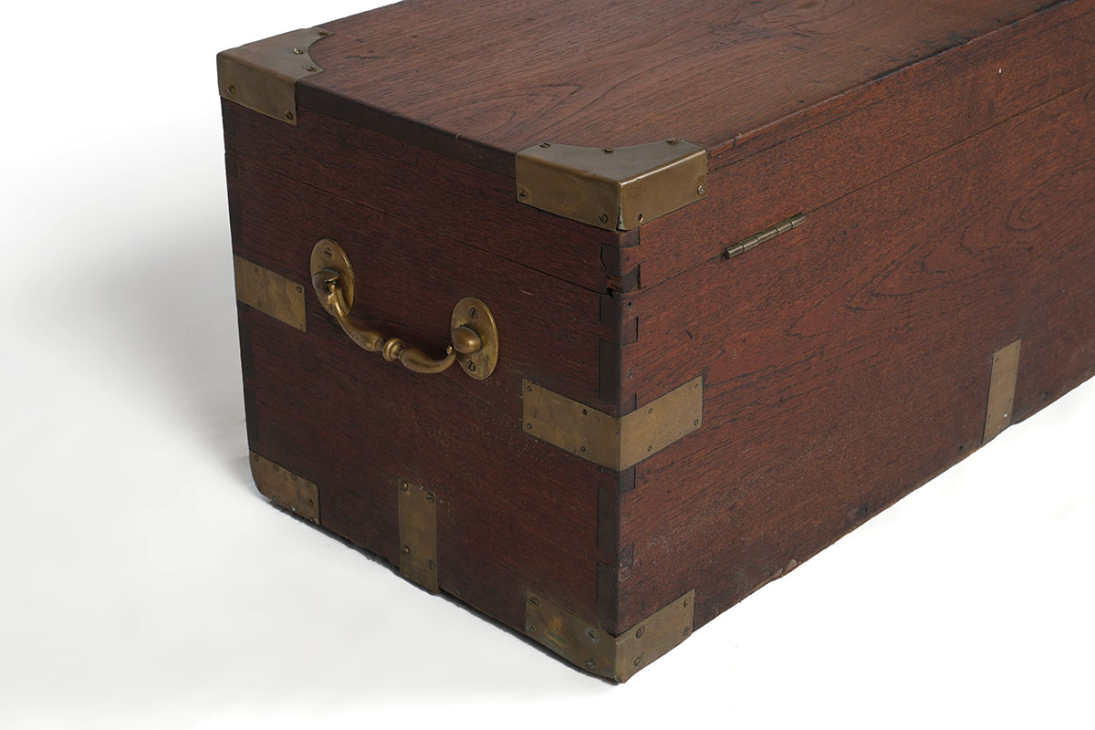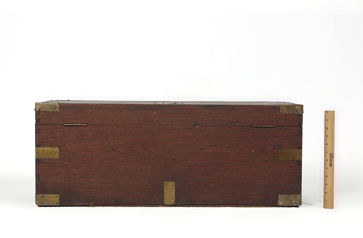 CAMPHOR WOOD SEA CAPTAINS CHEST: Mid to late 19th century campaign style chest typically referred to as sea captains chests, brass mounts, handles, and escutcheon. Hinged lid, overall measures 13'' h. x 33'' x 13''.