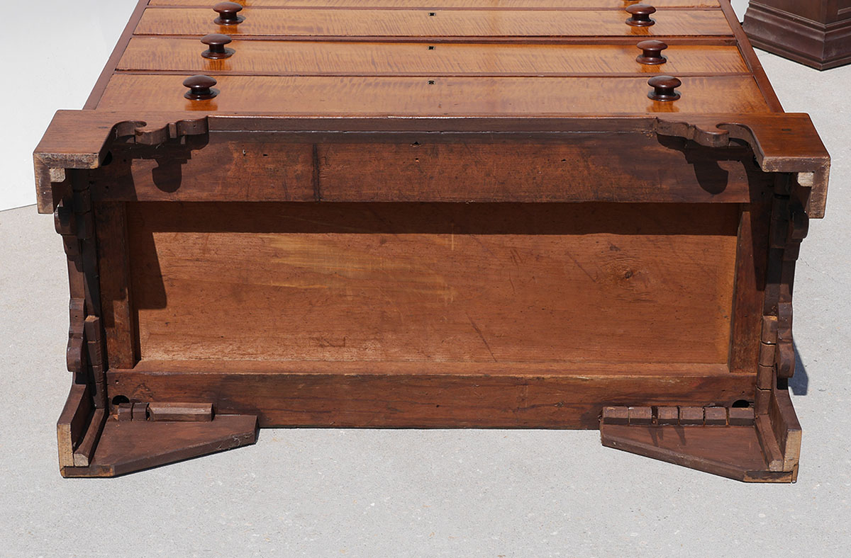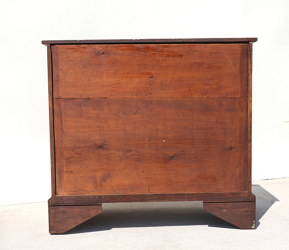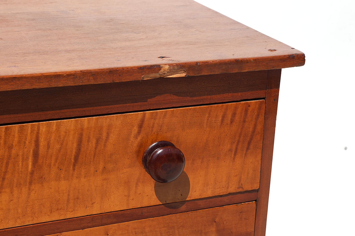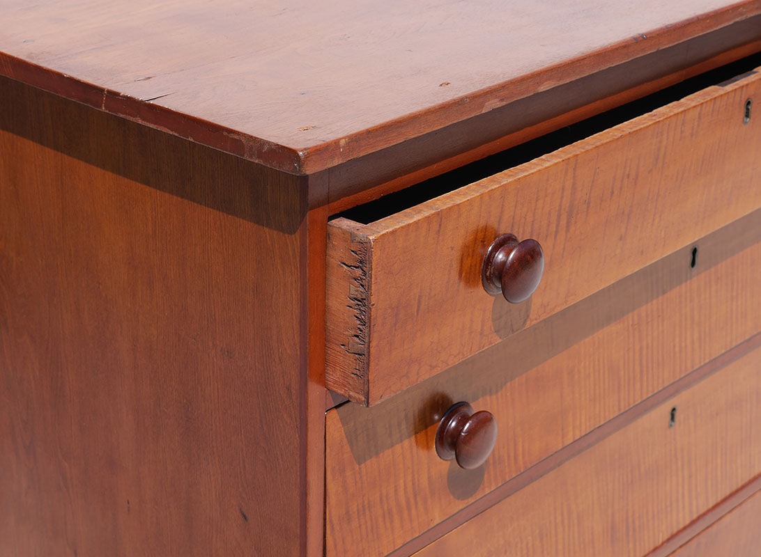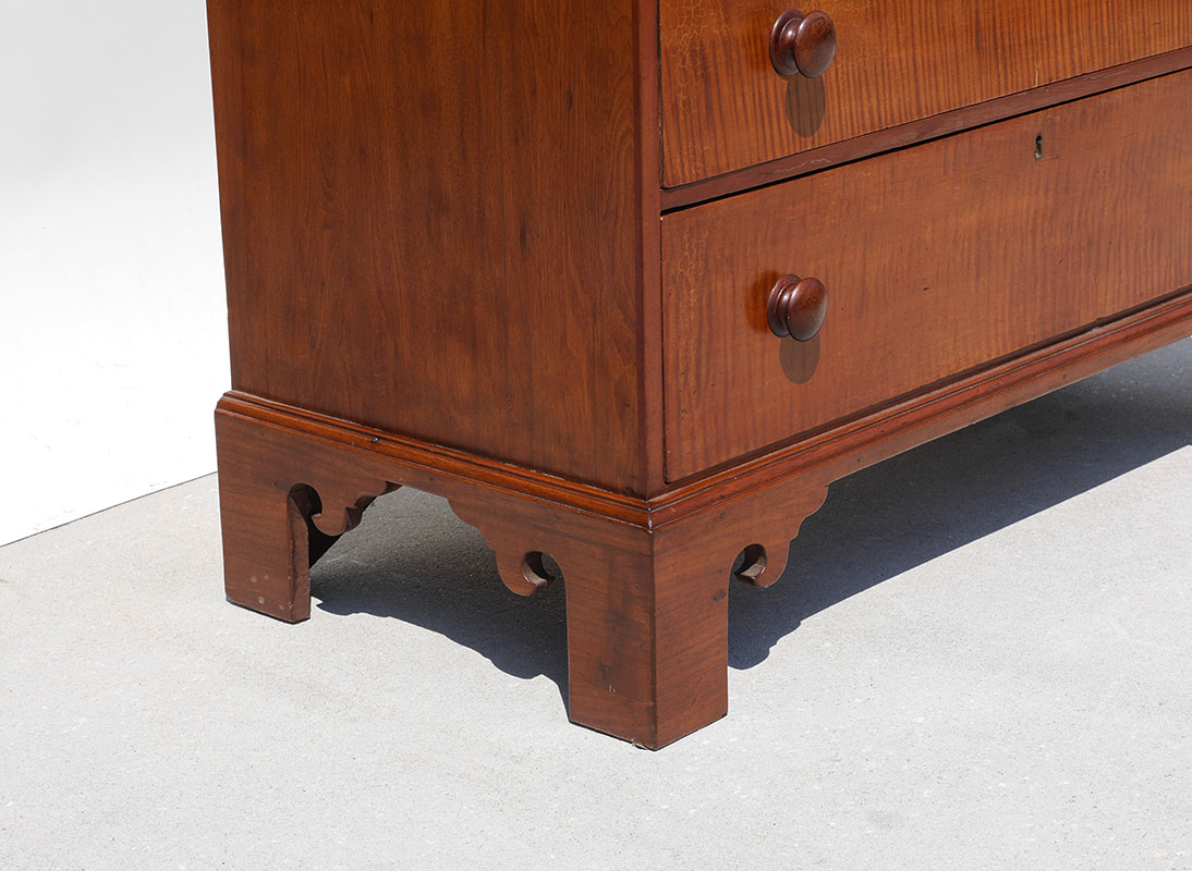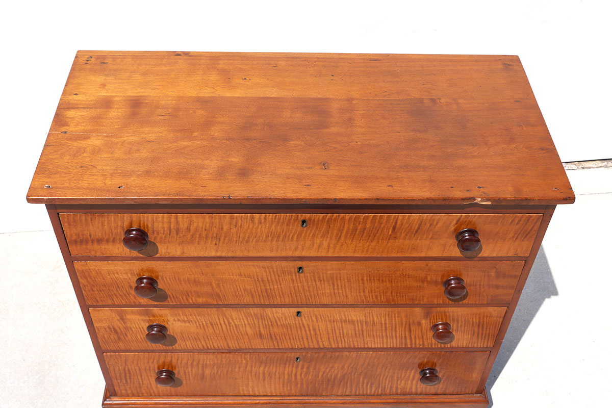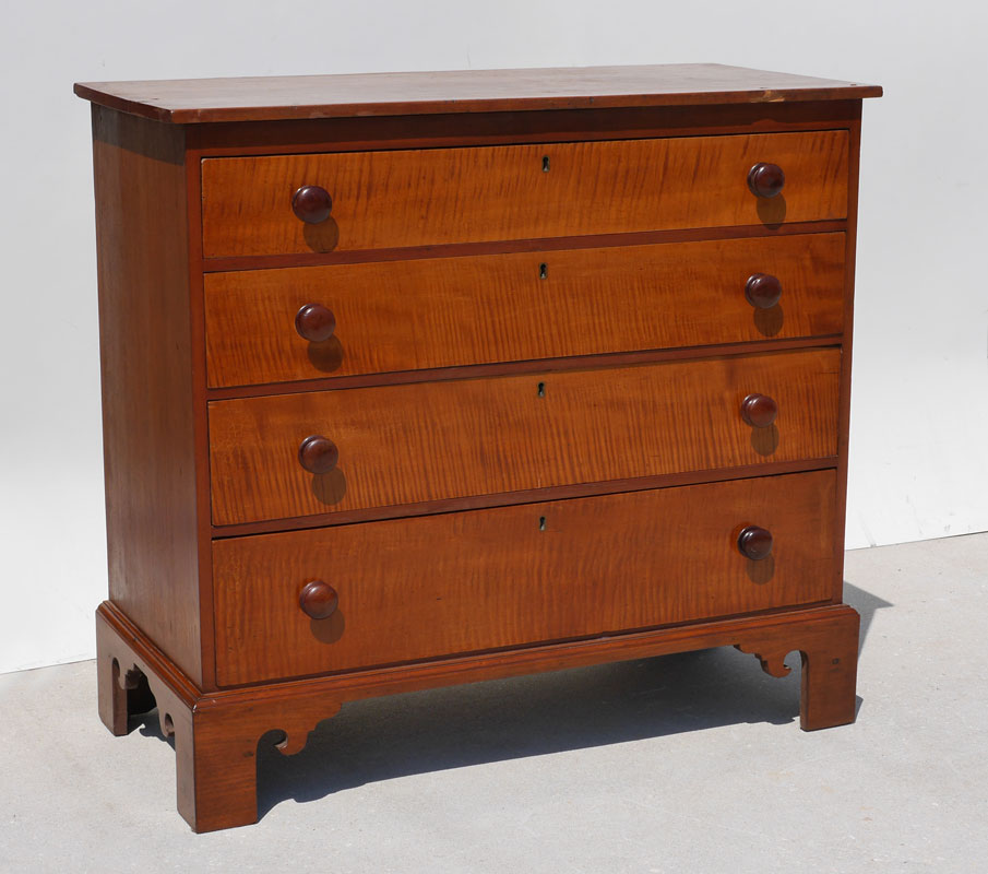 MAPLE CHEST OF DRAWERS: Early to mid 19th century, 4 graduated drawers with tiger maple veneer and wood pulls, bracket feet, overall 40 1/4'' h. x 44'' x 20 1/2''.