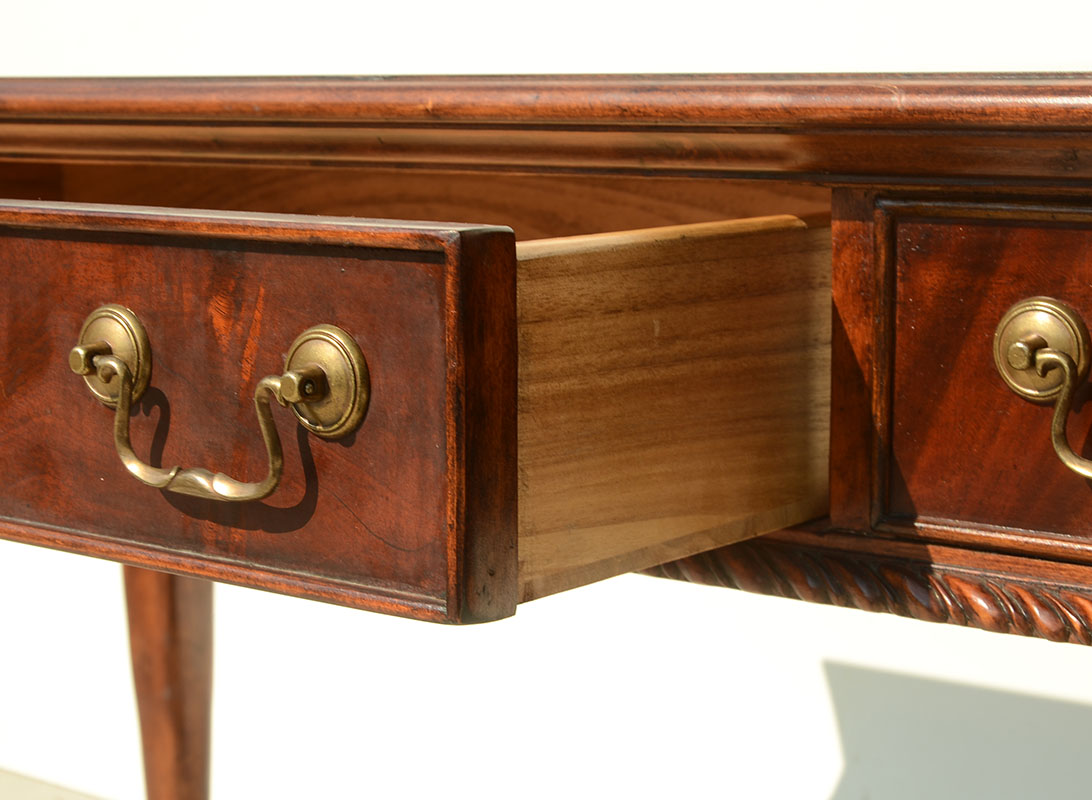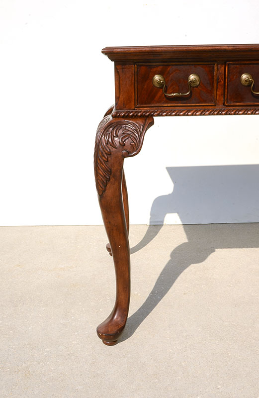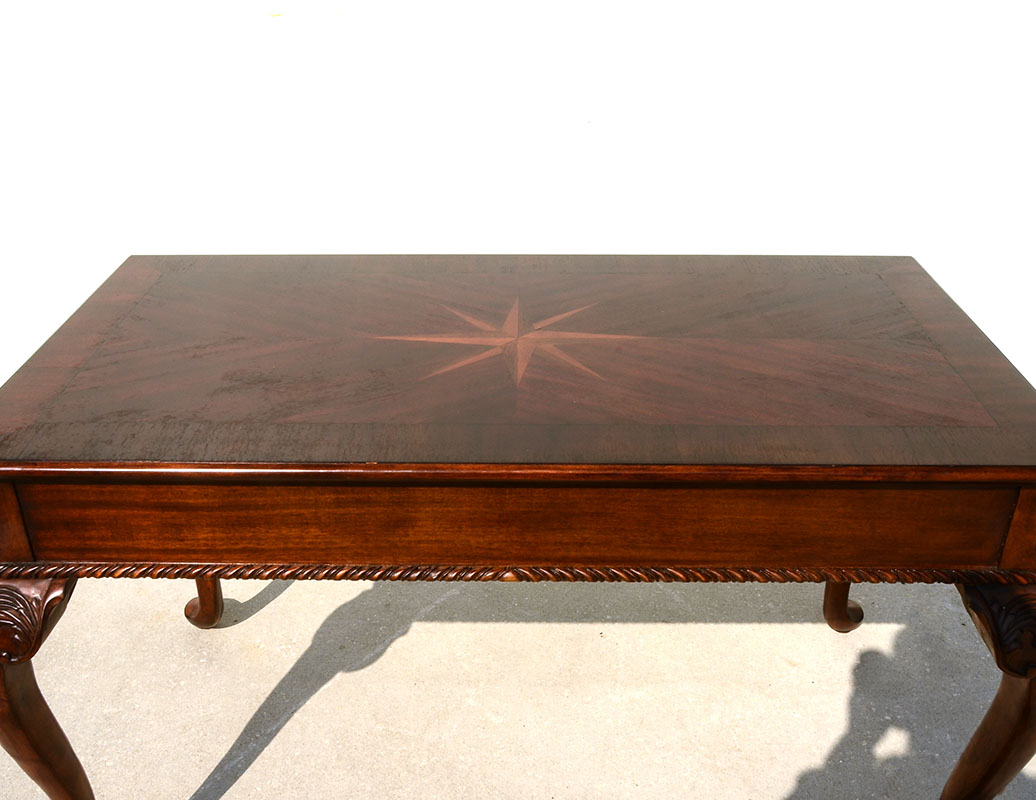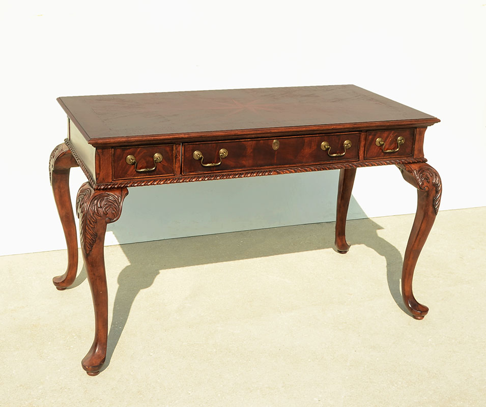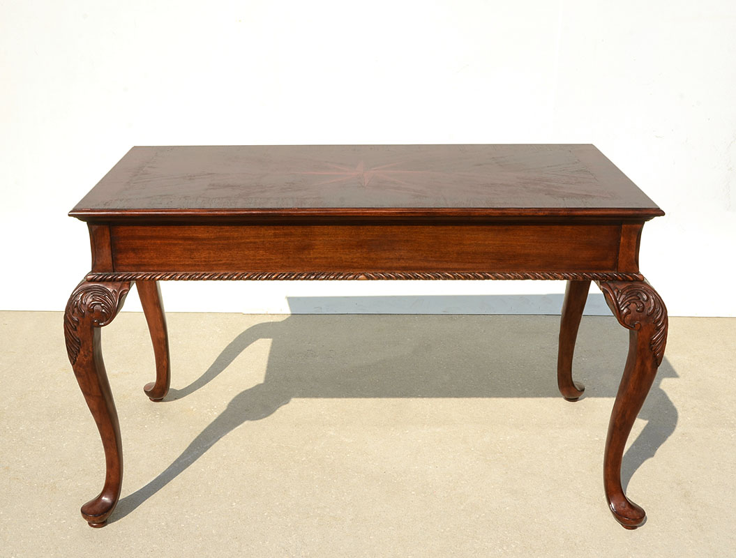 CARVED AND INLAID MAHOGANY DESK: Top with inlaid center patera star pattern, single drawer front with 2 false drawers, carved and shaped legs with foliate knees. Overall 30 1/4'' h. x 50'' x 26''