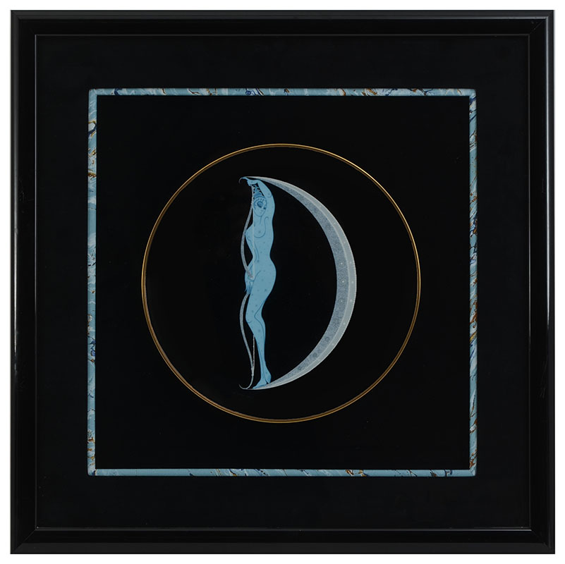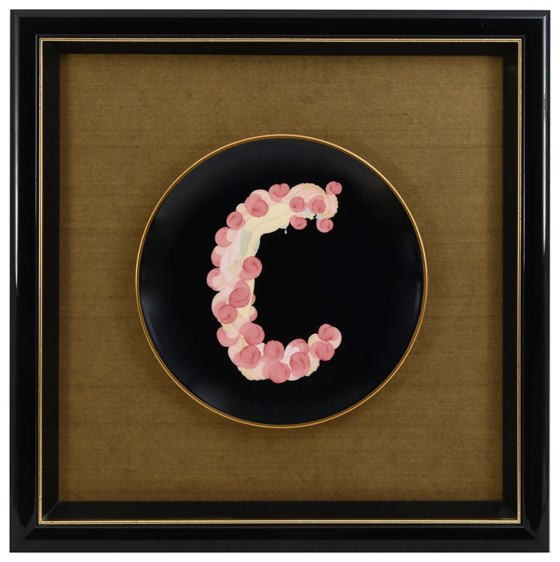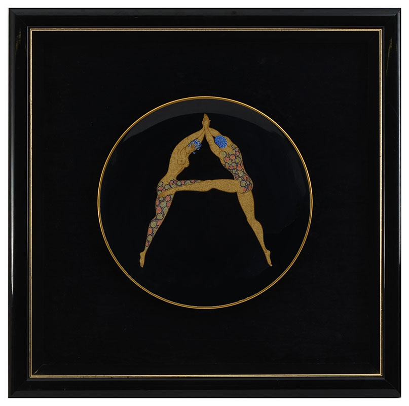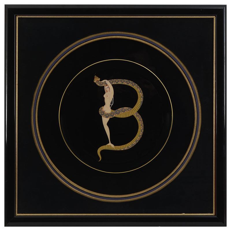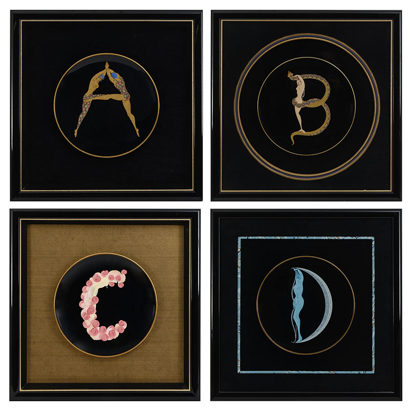 FOUR ERTE ALPHABET PLATES A,B,C,D: Approx. 8.75'' d, matching black lacquer frames,
