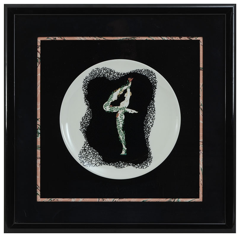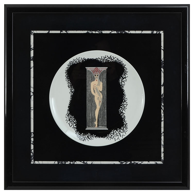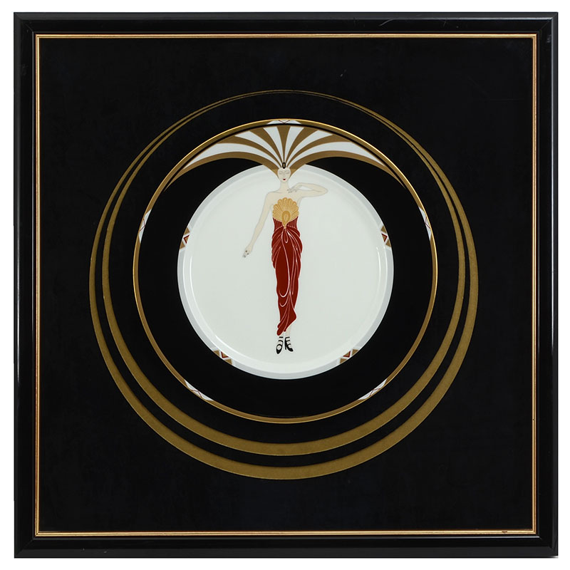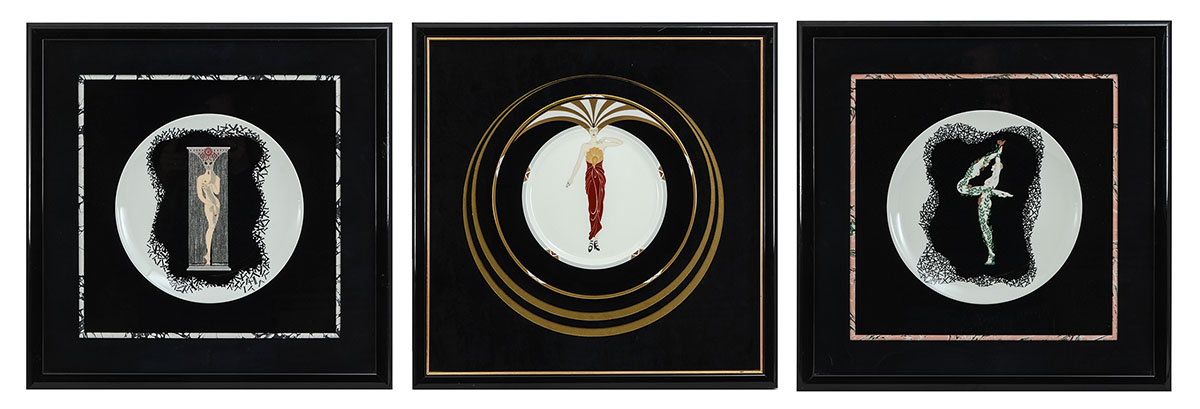 THREE FRAMED ERTE COLLECTOR PLATES: 1) IV, 9'' d, encased in black lacquer frame, 17.25'' x 17.25'': 2) Beauty in a Red Dress, 11.75'' d, custom frame, 21.5'' x 21.5'': 3) I, 9'' d, custom frame in matte, 17.25'' x 17.5''.
