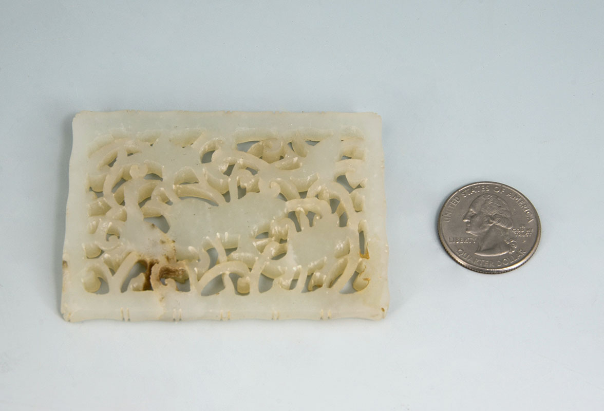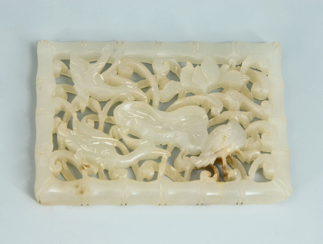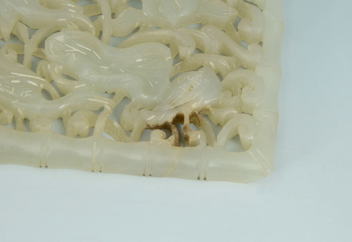 CHINESE CARVED CELADON JADE PANEL: Celadon jade or similar material, reticulated pierced carved with bird and foliate motif, bamboo form frame. Overall measures 3'' x 2 1/8''.