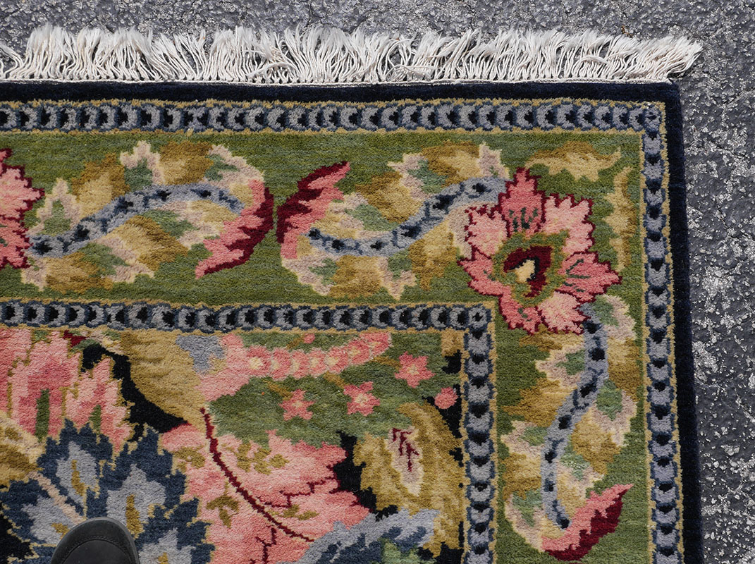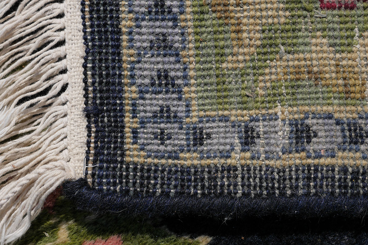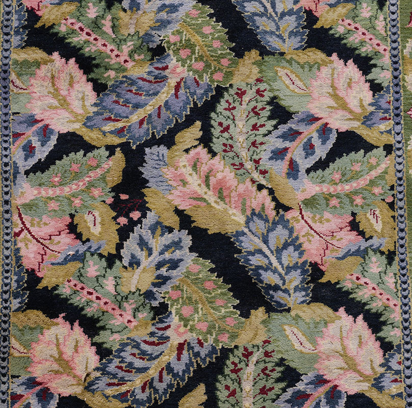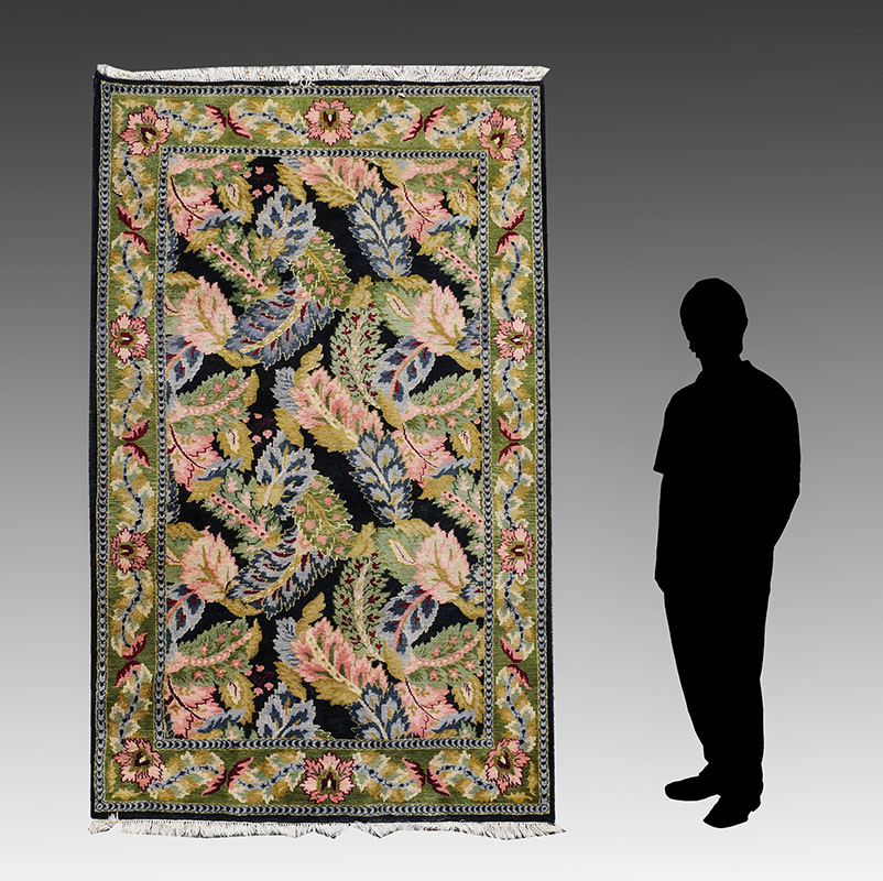 APPROX 15-30 YR OLD INDI-PERSIAN HAND KNOTTED WOOL RUG, 6'1'' X 9': This rug has a bold design of large, vari-colored and type leaves. The pink, green, burgundy, blue, beige, and ivory colored leaves are very striking on the black colored field. The only flowers in this rug are found in the black ground border.