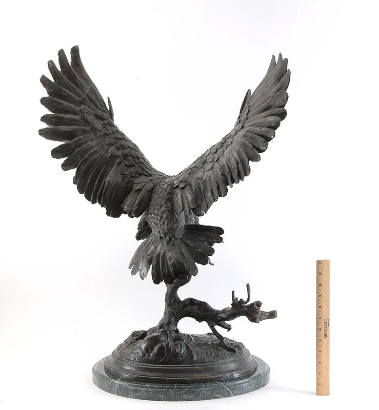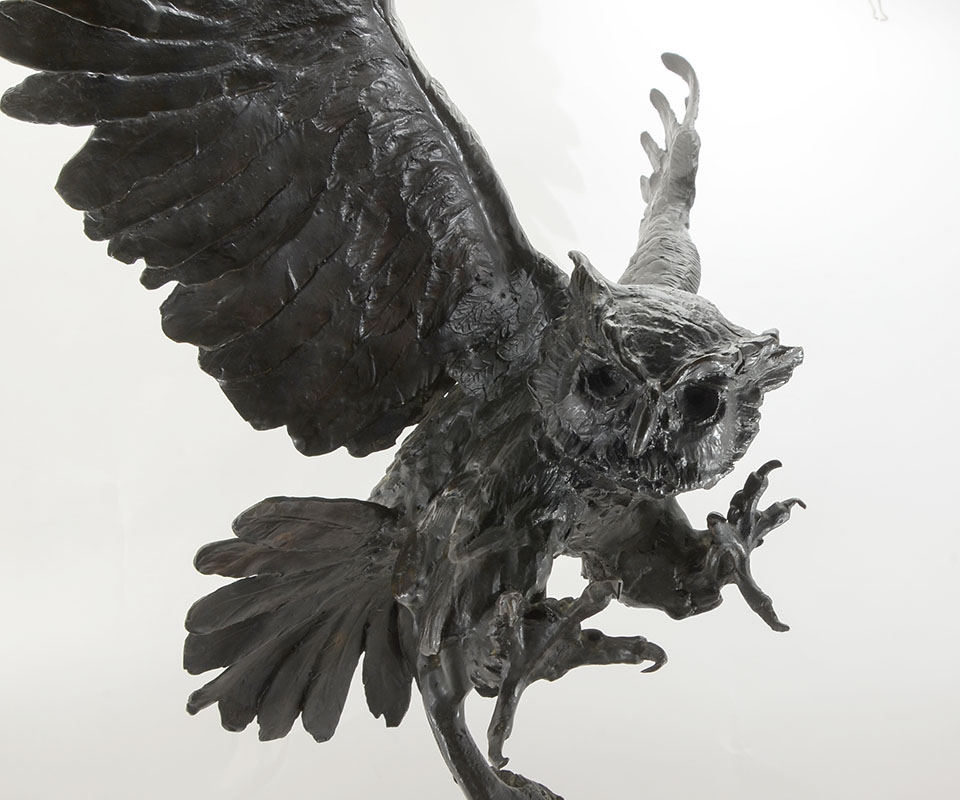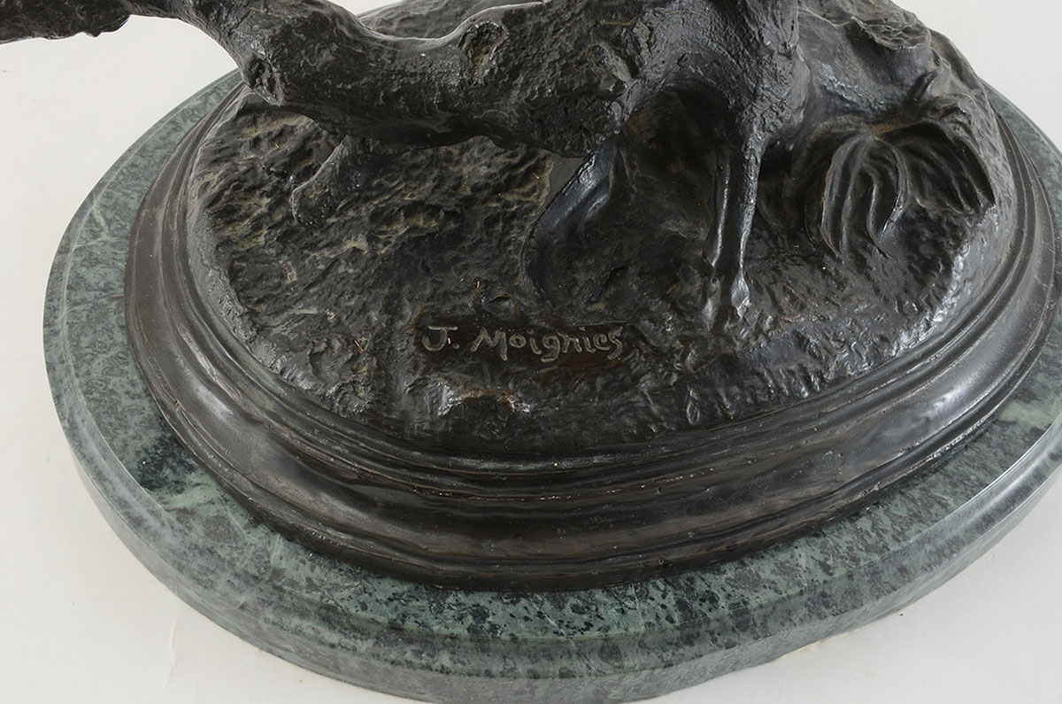 WELL CAST BRONZE OWL AFTER MOIGNIEZ: Approx. 30.5 '' h with beveled marble plinth, 22'' w.