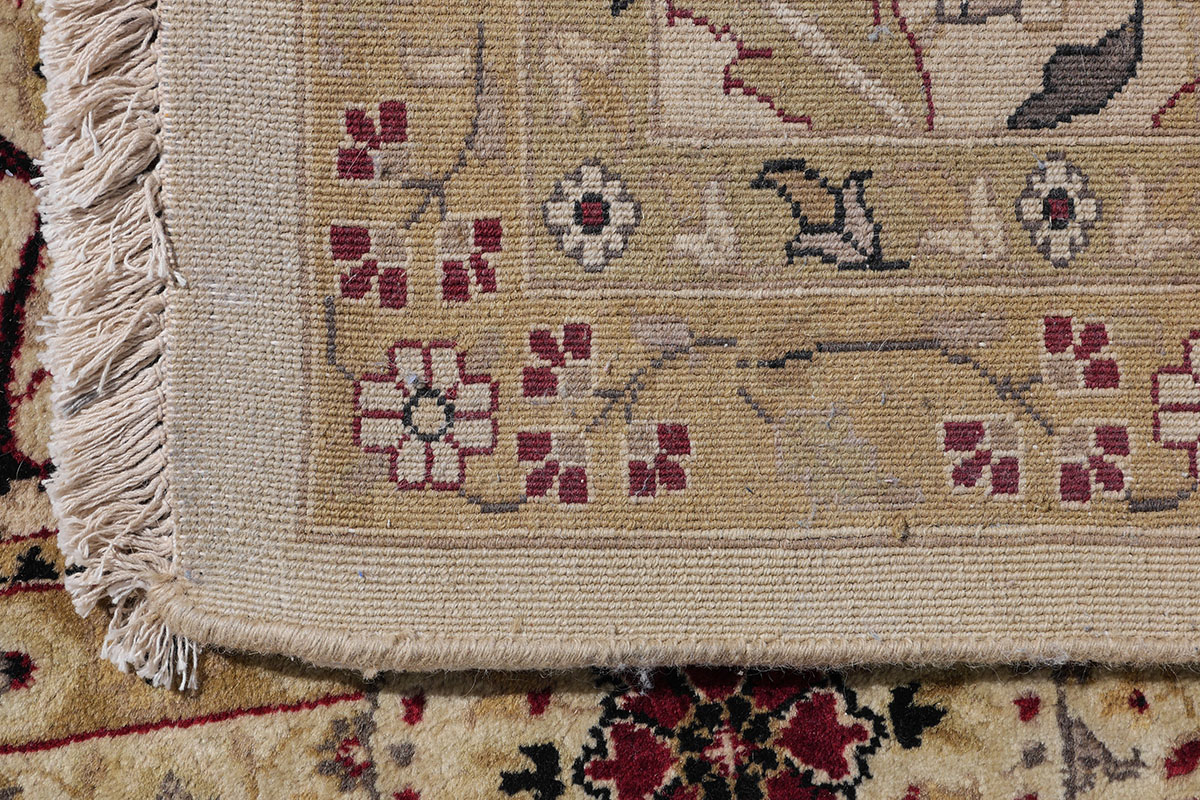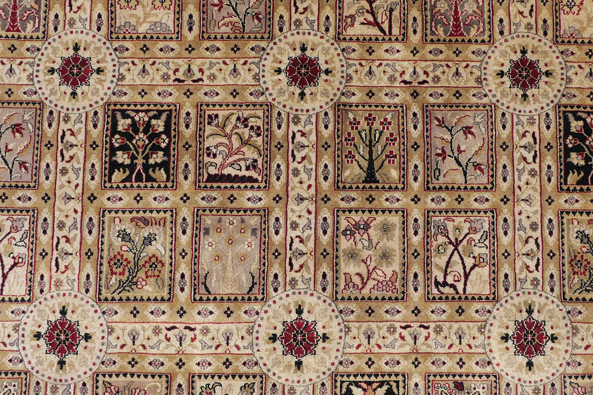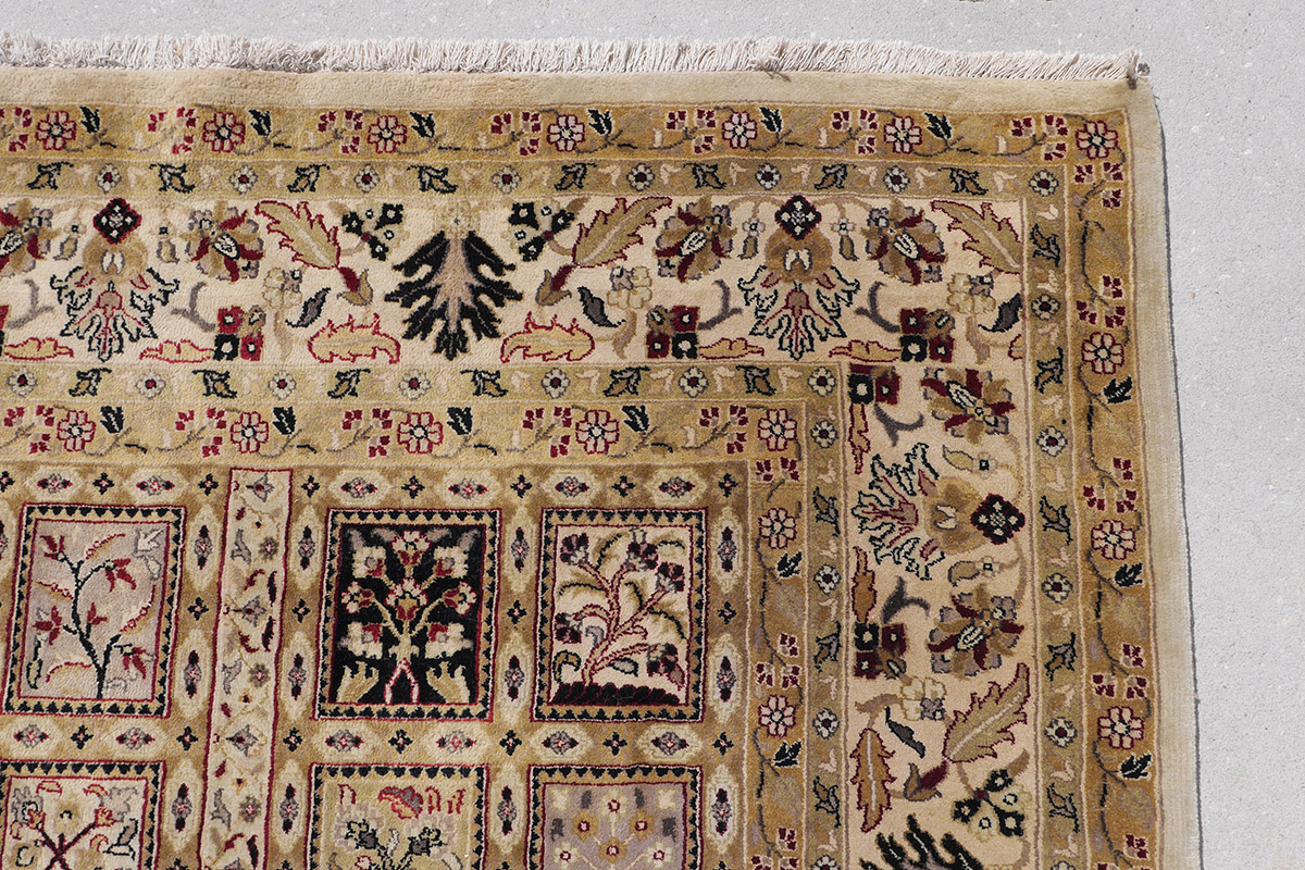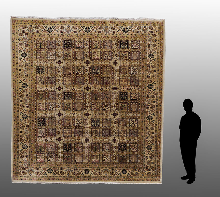 APPROX 20-35 YR OLD PERSIAN BAKHTIARI HAND KNOTTED WOOL RUG, 9' X 11'11'': This rug has a variant of a Bakhtiari garden pattern with four smaller panels making up one larger panel. Rows of four panels divided by white colored bands (the streams) cover the field. White compass point-like circles link the vertical and horizontal bands. The panels (the garden), each have an individual tree or plant within. The white colored main border and the gold colored guard borders frame the main fields ''garden''.