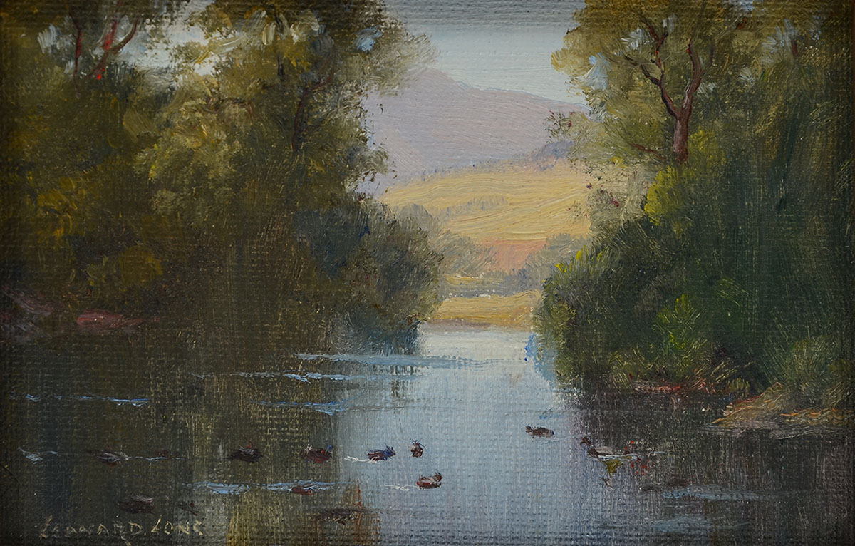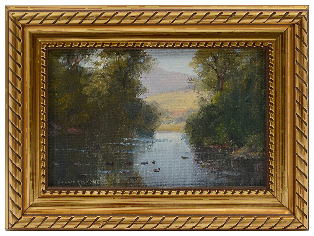 LONG, Leonard, (Australian, 1911-2013): ''Margaret River, W.A.'' , Oil/Canvasboard, 4'' x 6'', signed lower left, labeled verso, easel back frame, 5.75'' x 7.5''. Leonard Long mainly painted landscapes of Australia.