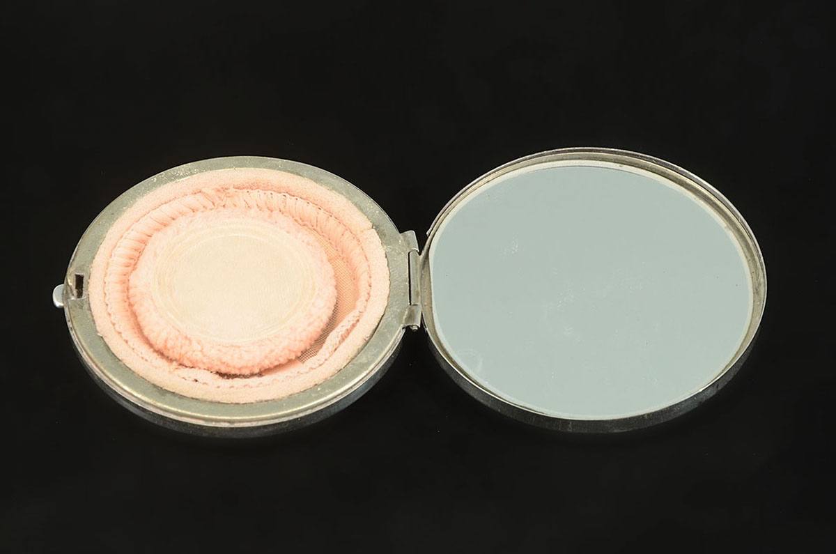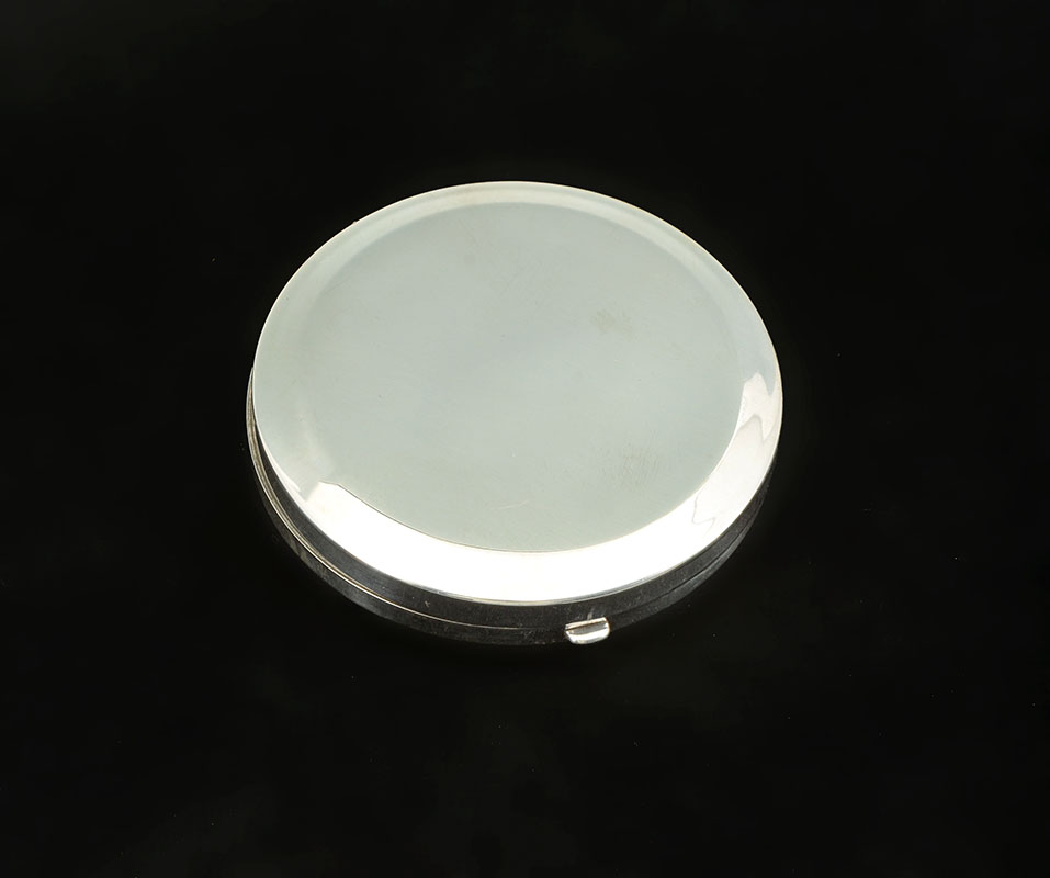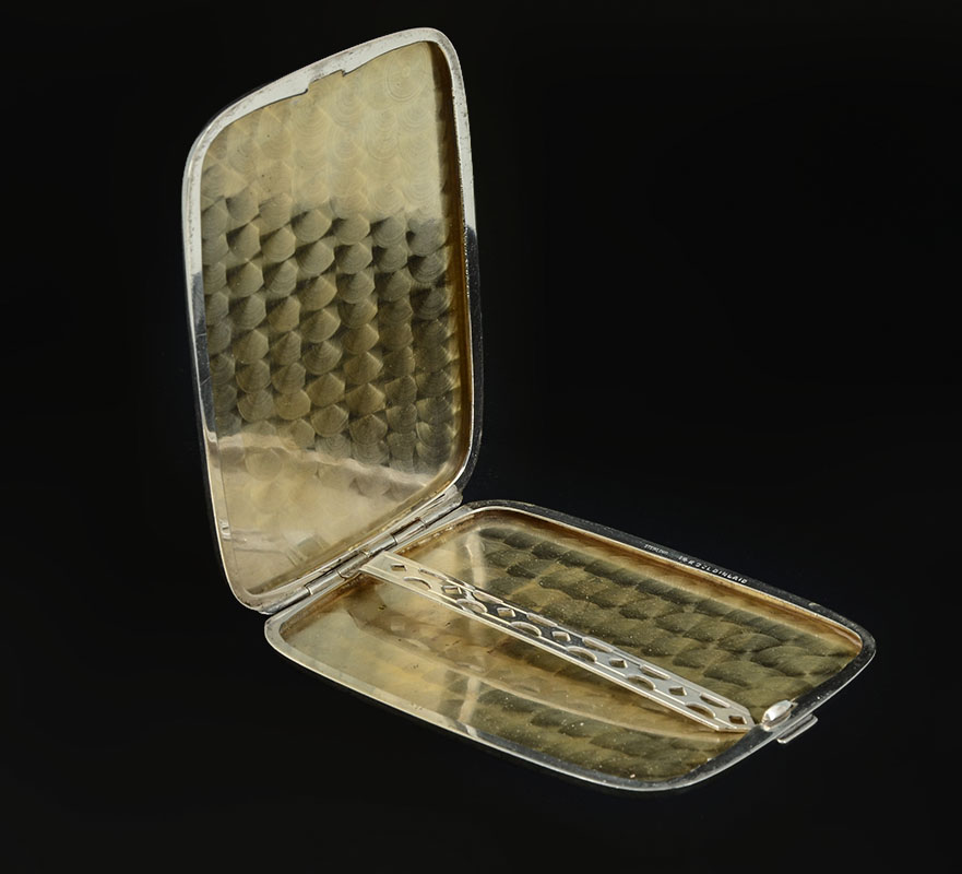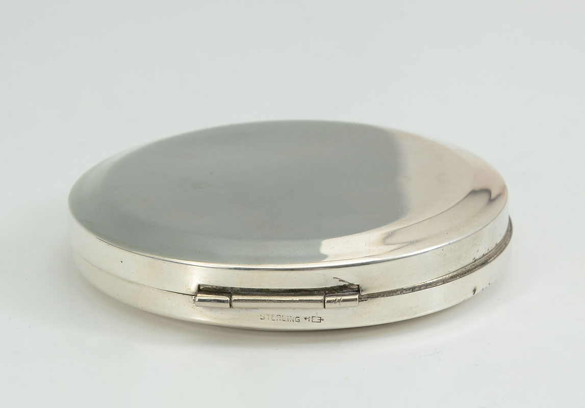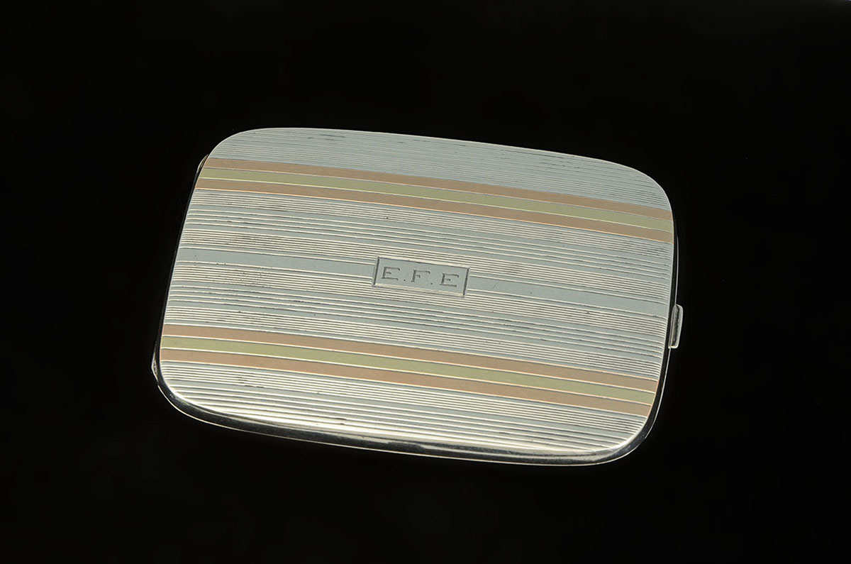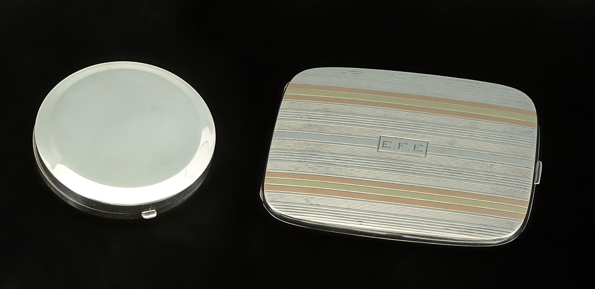 STERLING/14K CIGARETTE CASE & STERLING COMPACT: 1) Handsome cigarette case monogrammed E.F.E. with 14K gold inlay. Some small dents and surface scratching. Total weight 3.915 Troy ounces; 2) Lovely compact marked sterling with a makers mark. Normal wear and some small dents.