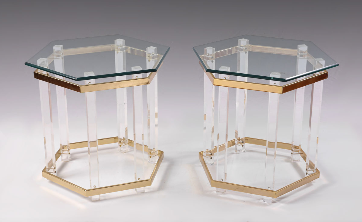 PAIR LUCITE BRASS & GLASS SIDE TABLES: Hexagonal beveled glass top, Lucite supports, hexagonal brass collars. Base 22'' h. x 19 1/4'', top 22'' dia.