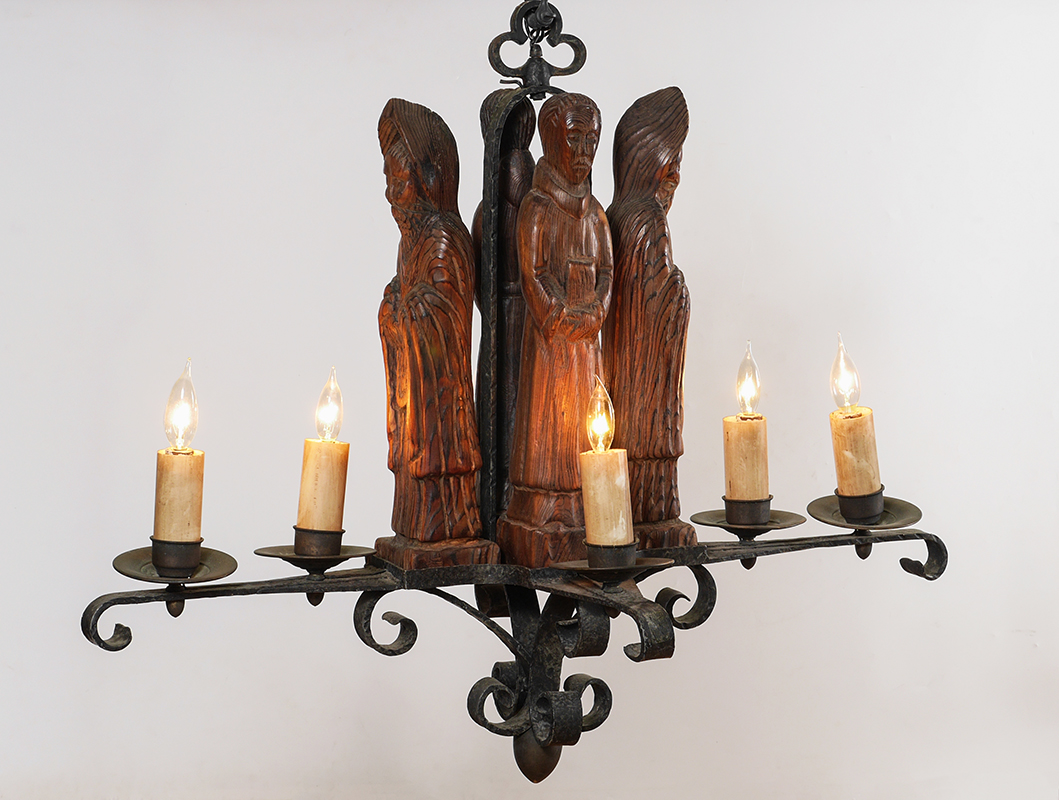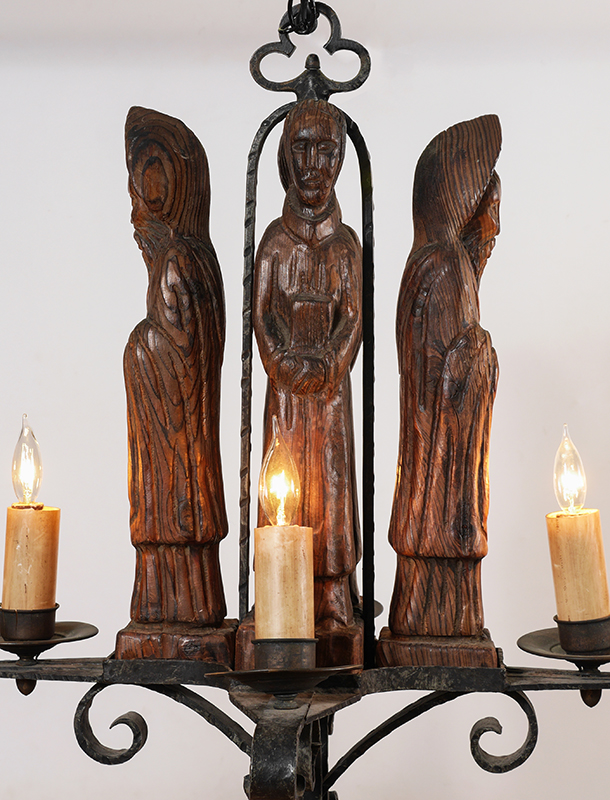 GOTHIC REVIVAL CARVED APOSTLE CHANDELIER: Wrought iron 4 arm, 6 light chandelier with carved wood figures of apostles or monks, overall measures 31 1/2'' h. x 35 3/4'' x 21 1/2''.