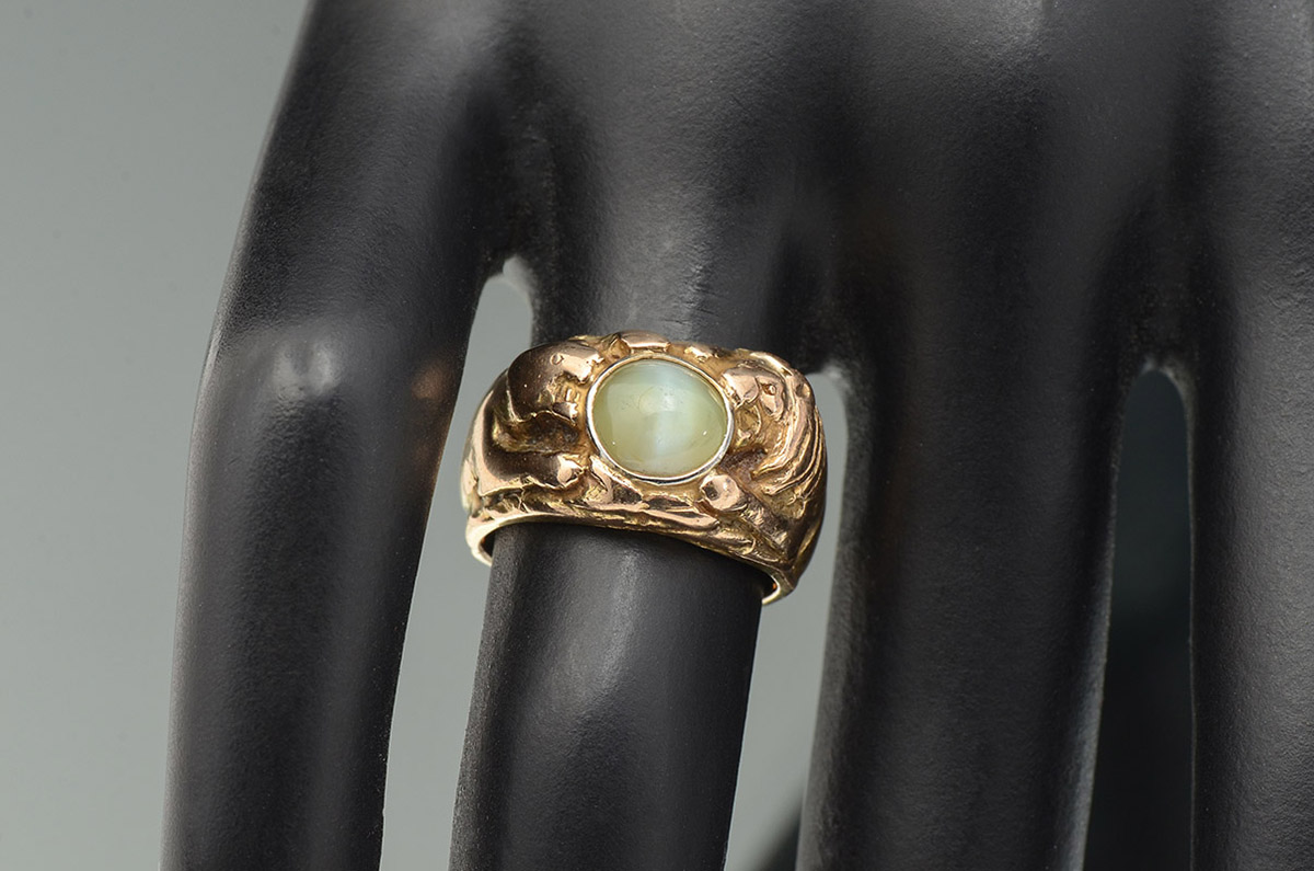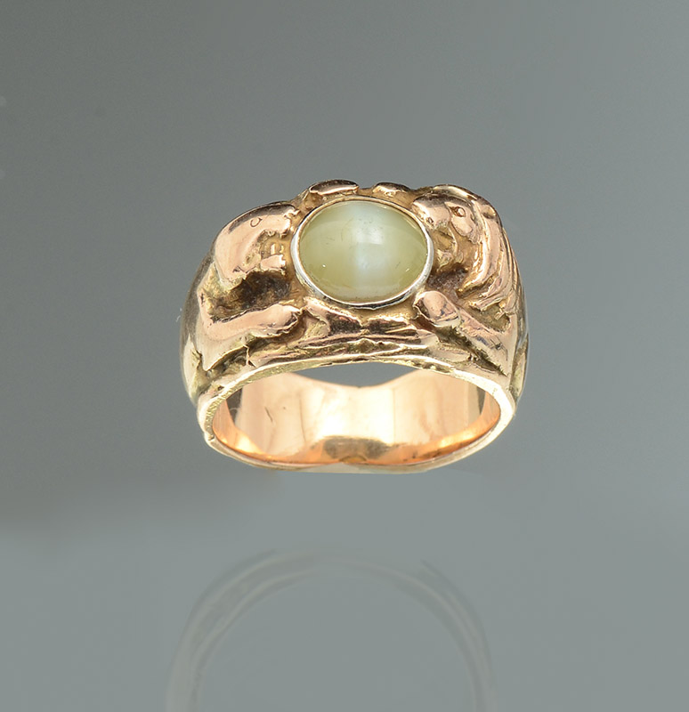 14K CAT'S EYE CHYSOBERYL: Cat's eye is set in a heavy yellow gold ring featuring 2 lions holding the cabochon cut chysoberyl. Size 5. Total weight 11.2 grams.