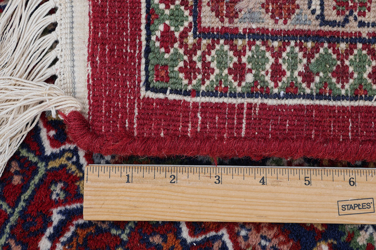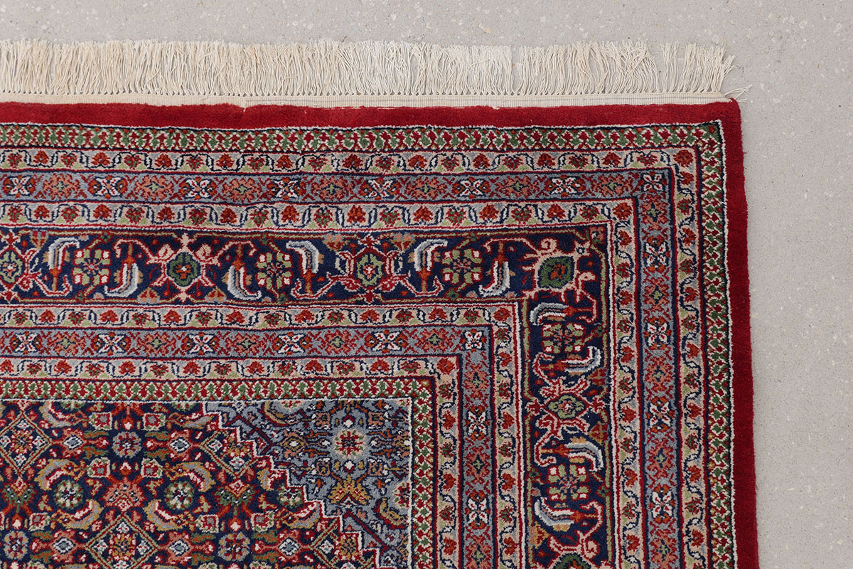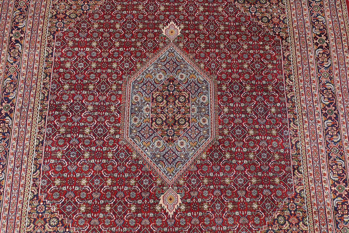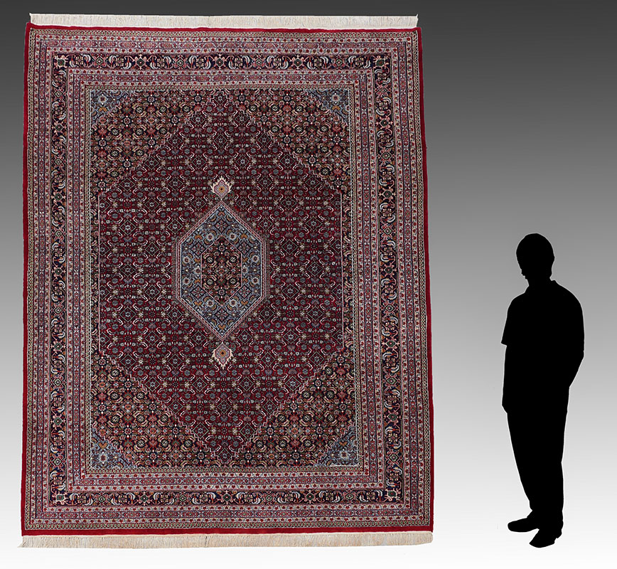 APPROX 15-30 YR OLD PERSIAN HAND KNOTTED WOOL RUG, 8'4'' X 11'2'': This room-size rug has a small central medallion in shades of blue around a black center and spandrels at either end. The red field is completely covered by a tight repeating pattern that forms diamonds and squares. The predominate color over the white ,blues, and black of the pattern is the red of the ground. Multiple guard borders of red, green, and blue surround the black main border.