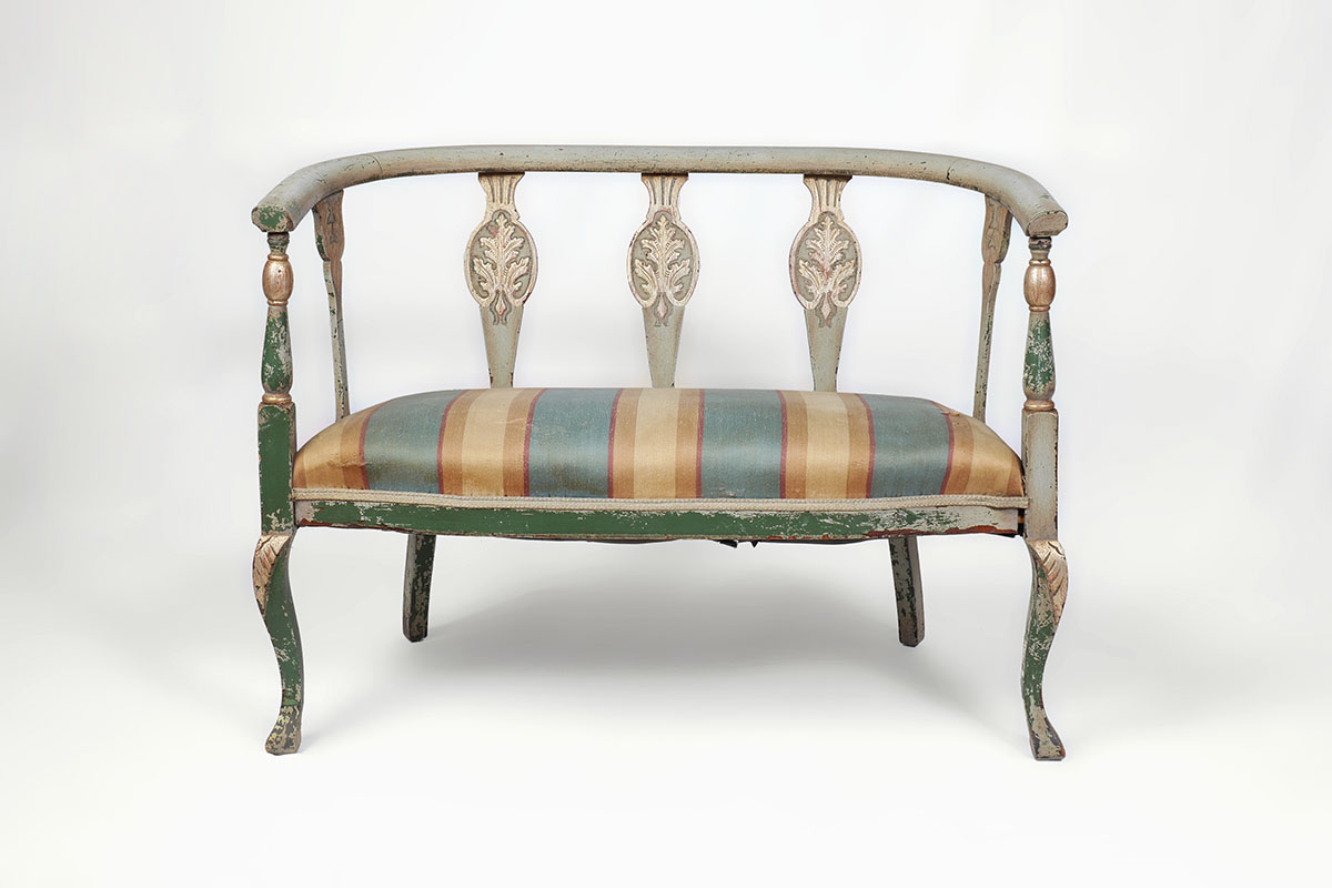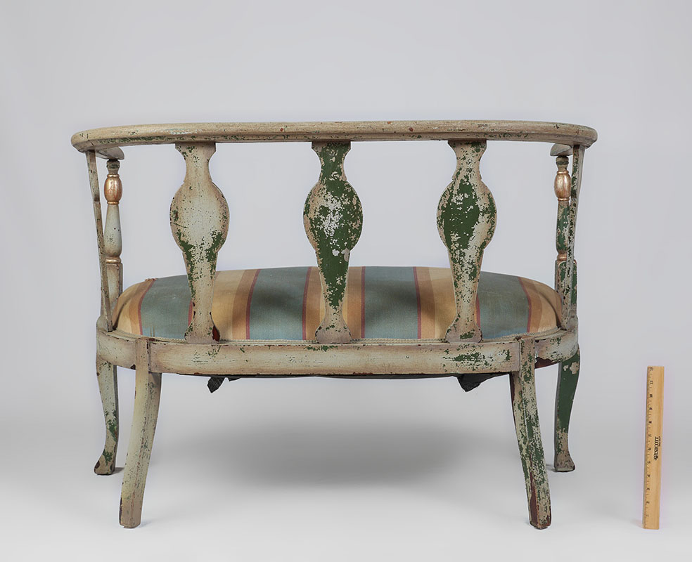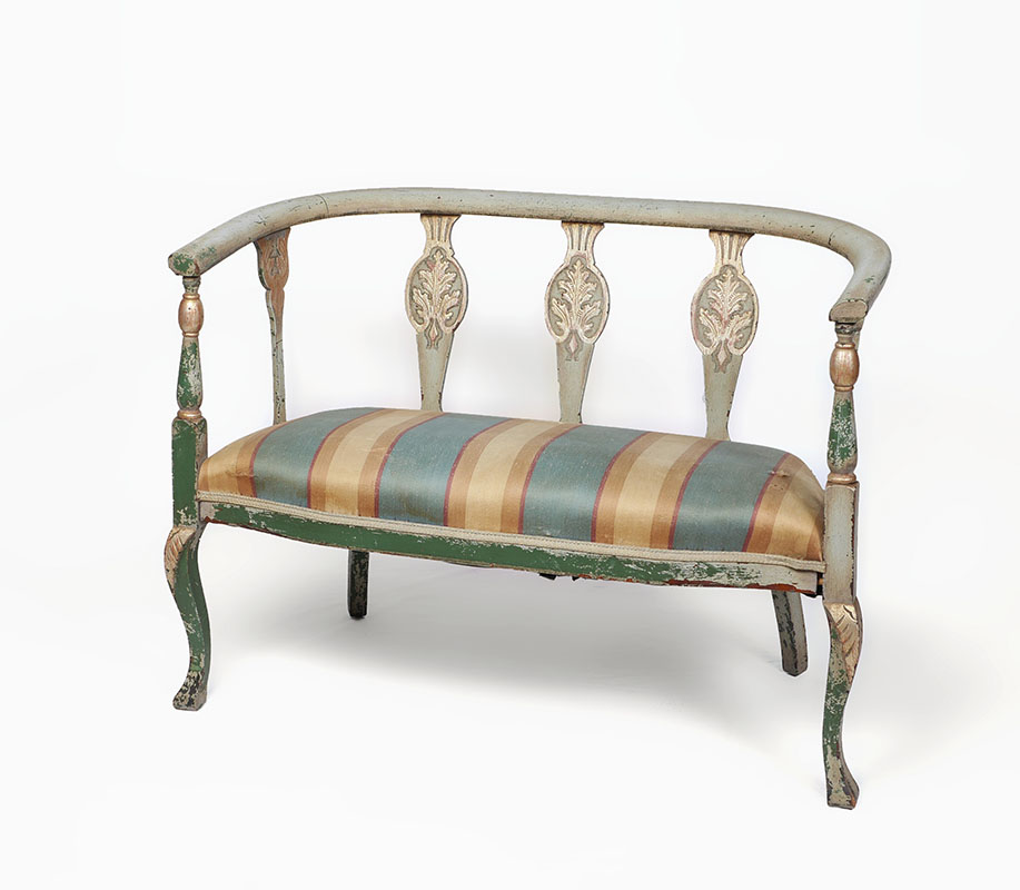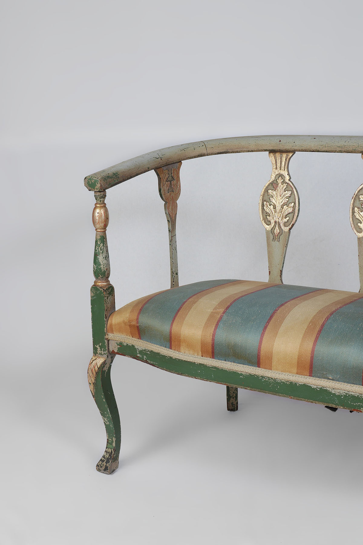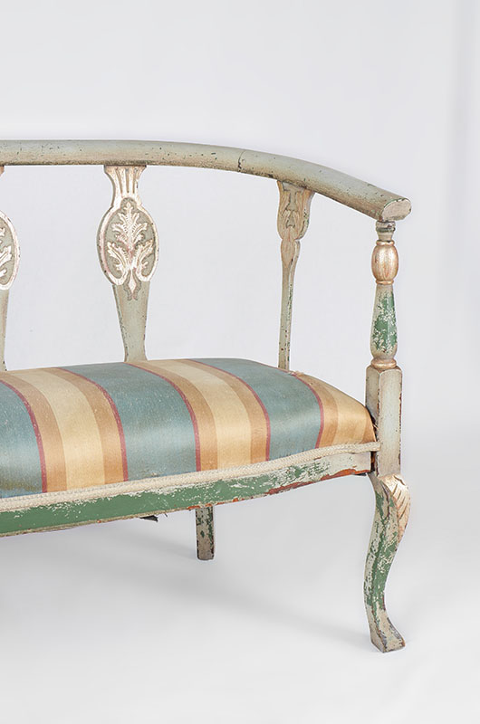 PAINT DECORATED SETTEE: Early 20th century, shaped top rail, carved back splats with foliate medallions, turned supports. Carved and shaped front legs, flaking grey over green and red paint, striped upholstery. Overall 30'' h. x 40'' x 21 1/2''.