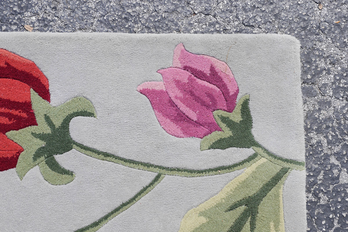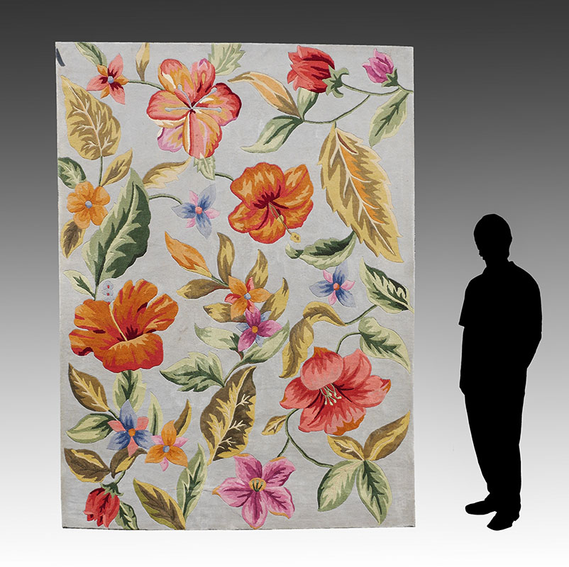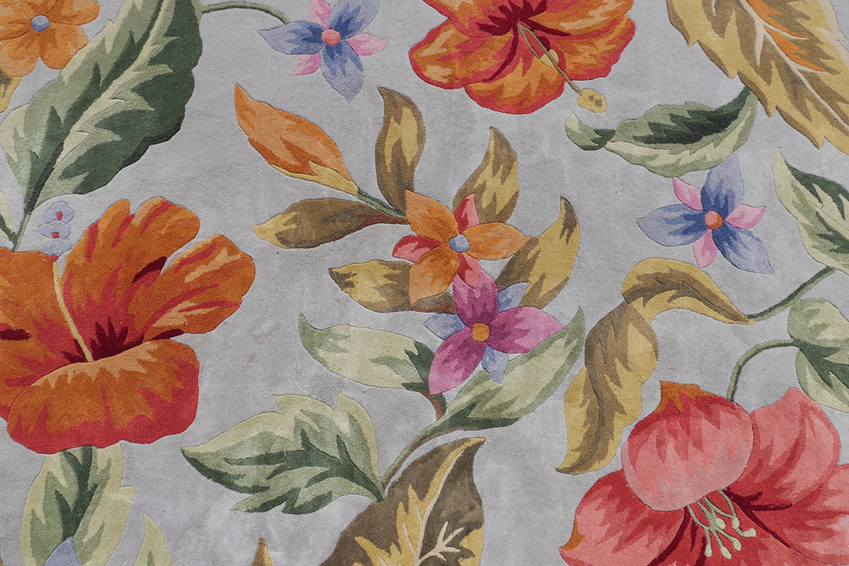 APPROX 15-25 YR OLD CHINESE HAND HELD MACHINE TUFTED WOOL RUG, 7'5'' X 9'5'': This decorator type rug has a large floral borderless design. The motifs are sculpted and the colors are shaded to add detail to the rug. The bright cheerful colors rest on a pale grey ground.