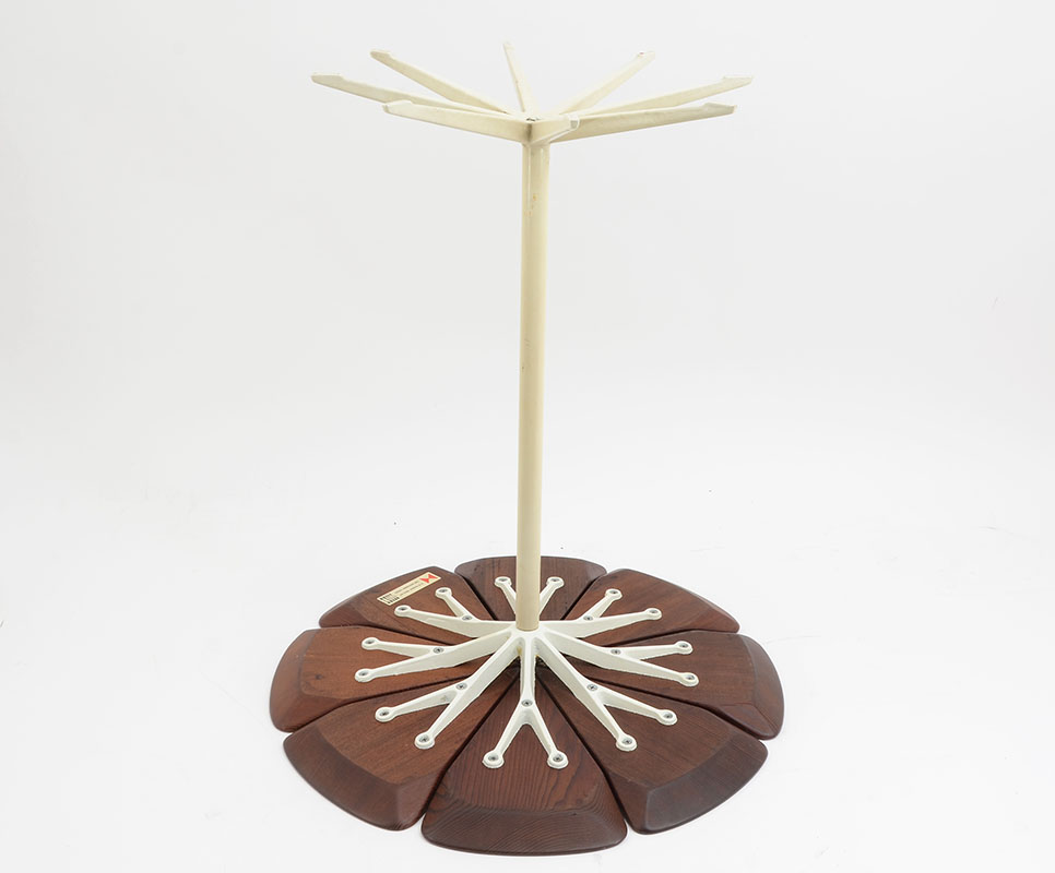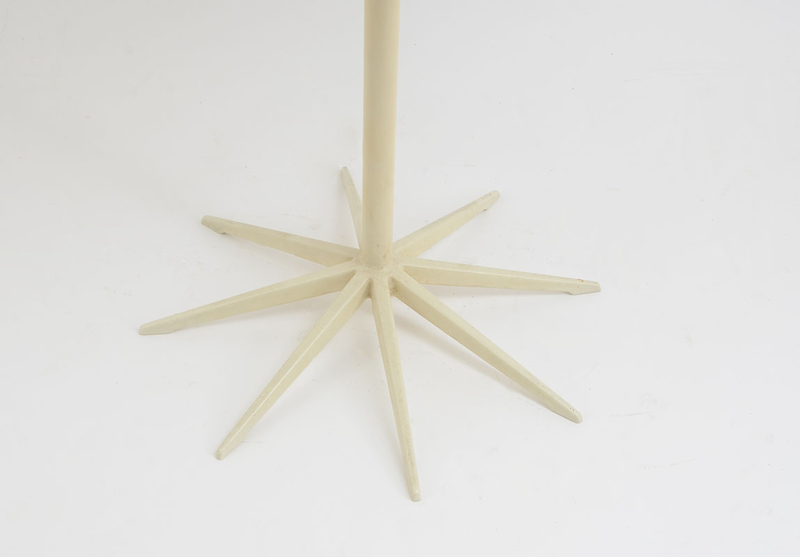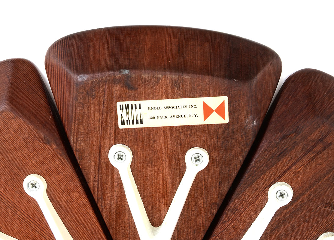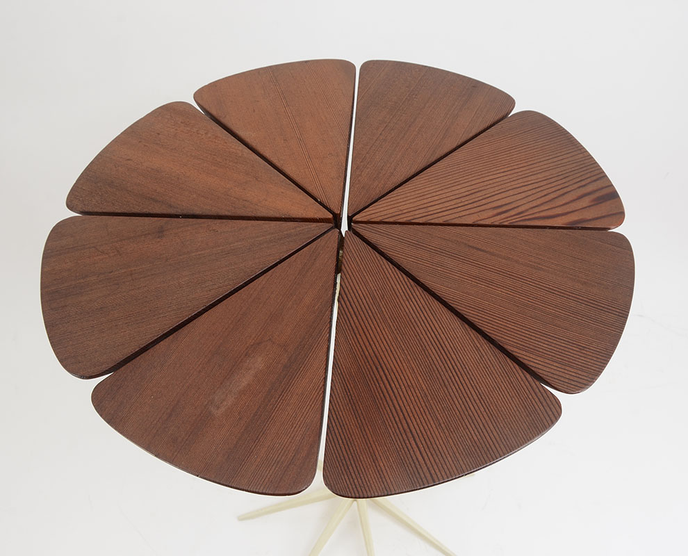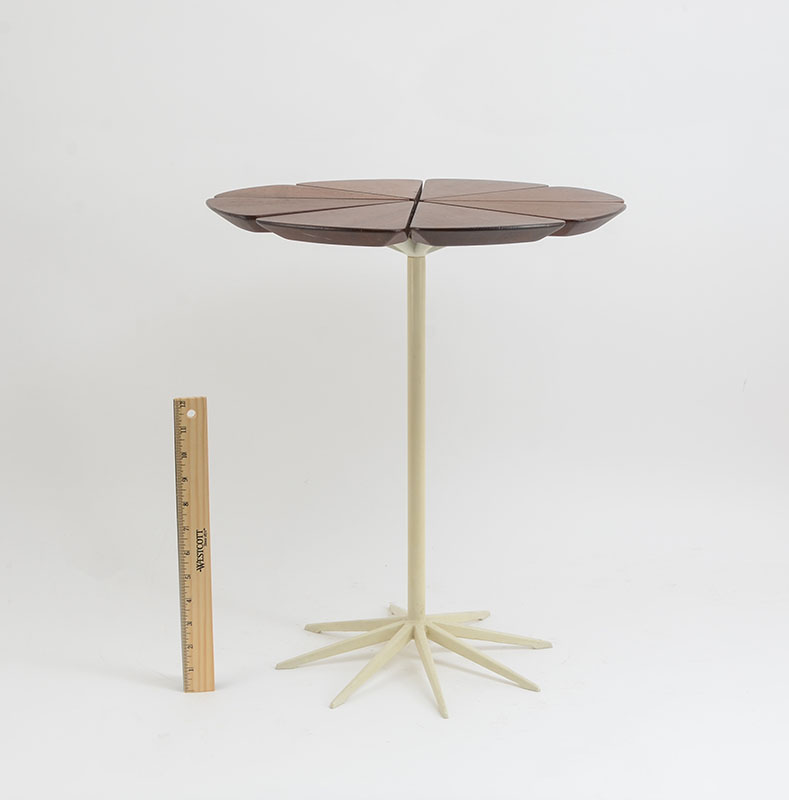 RICHARD SCHULTZ FOR KNOLL PETAL SIDE TABLE: Designed by Richard Schultz for Knoll, 8 petal wood top over painted white aluminum base, Knoll label under top. Overall measures 19'' h. x 16''.