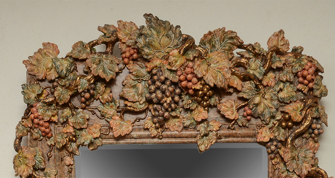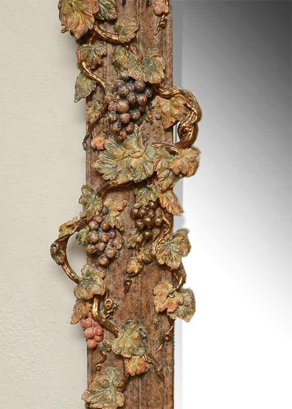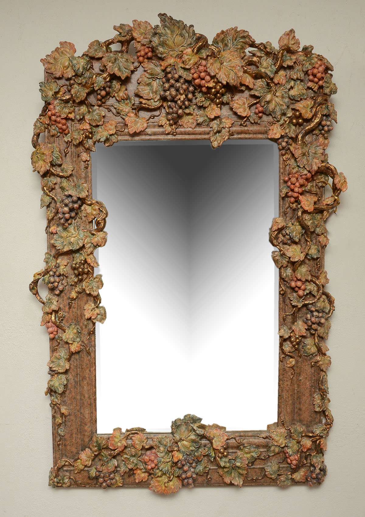 CASTILIAN GRAPE VINE MOTIF LARGE MIRROR: Heavy molded composite frame with elaborate grape vine motif from Castilian. Beveled glass mirror, overall measures 54'' h. x 35'' x 3 1/2''.