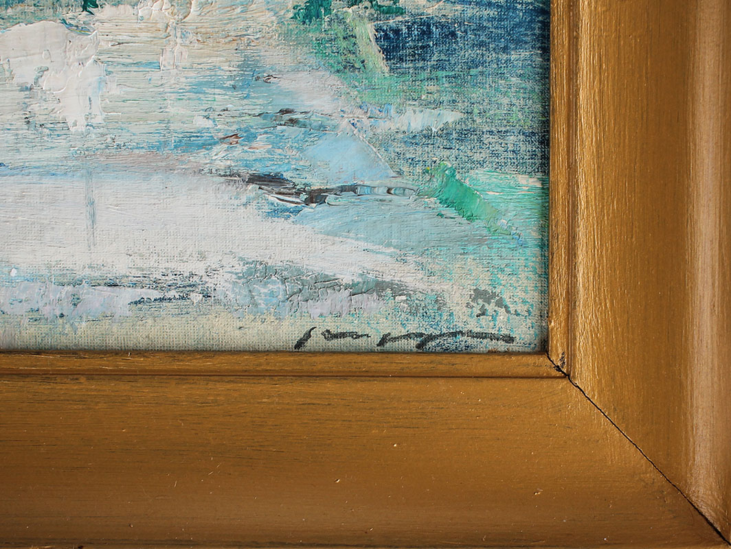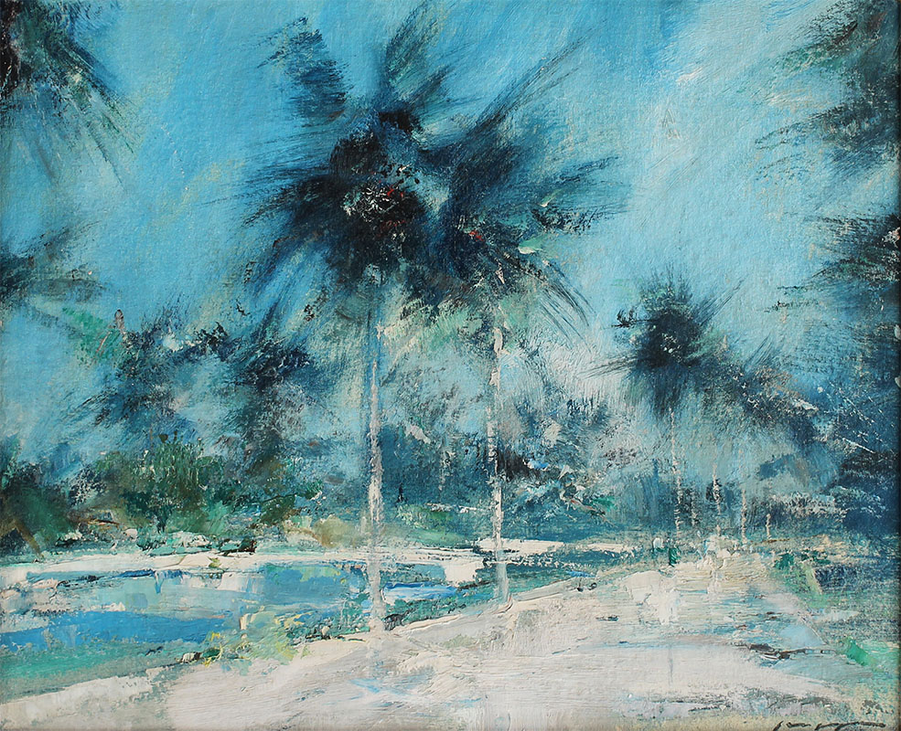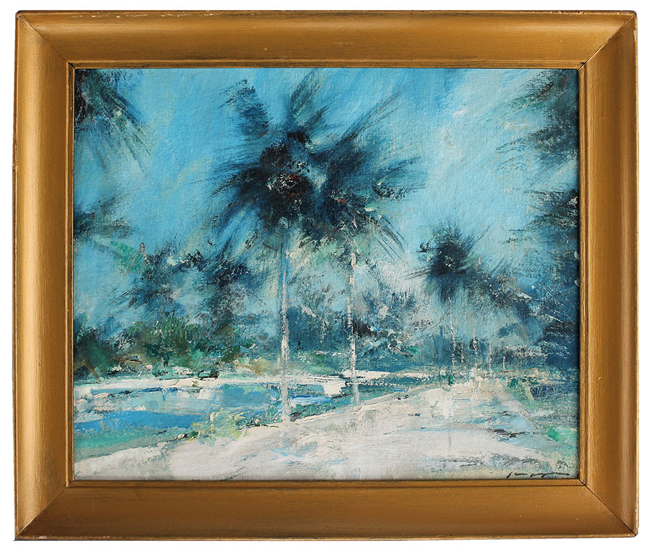 GRUPPE, Charles, (American, 1928-): Tropical Landscape with Palms, Oil/Canvasboard, 15.5'' x 19'', signed lower right, framed, 19'' x 22.5''. Charles Gruppe is known widely for his marine and landscape paintings.