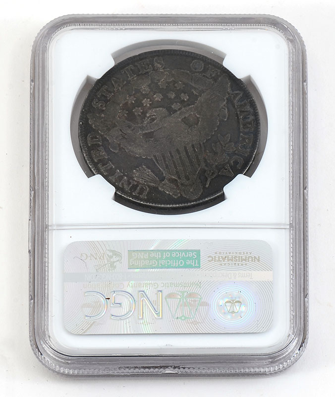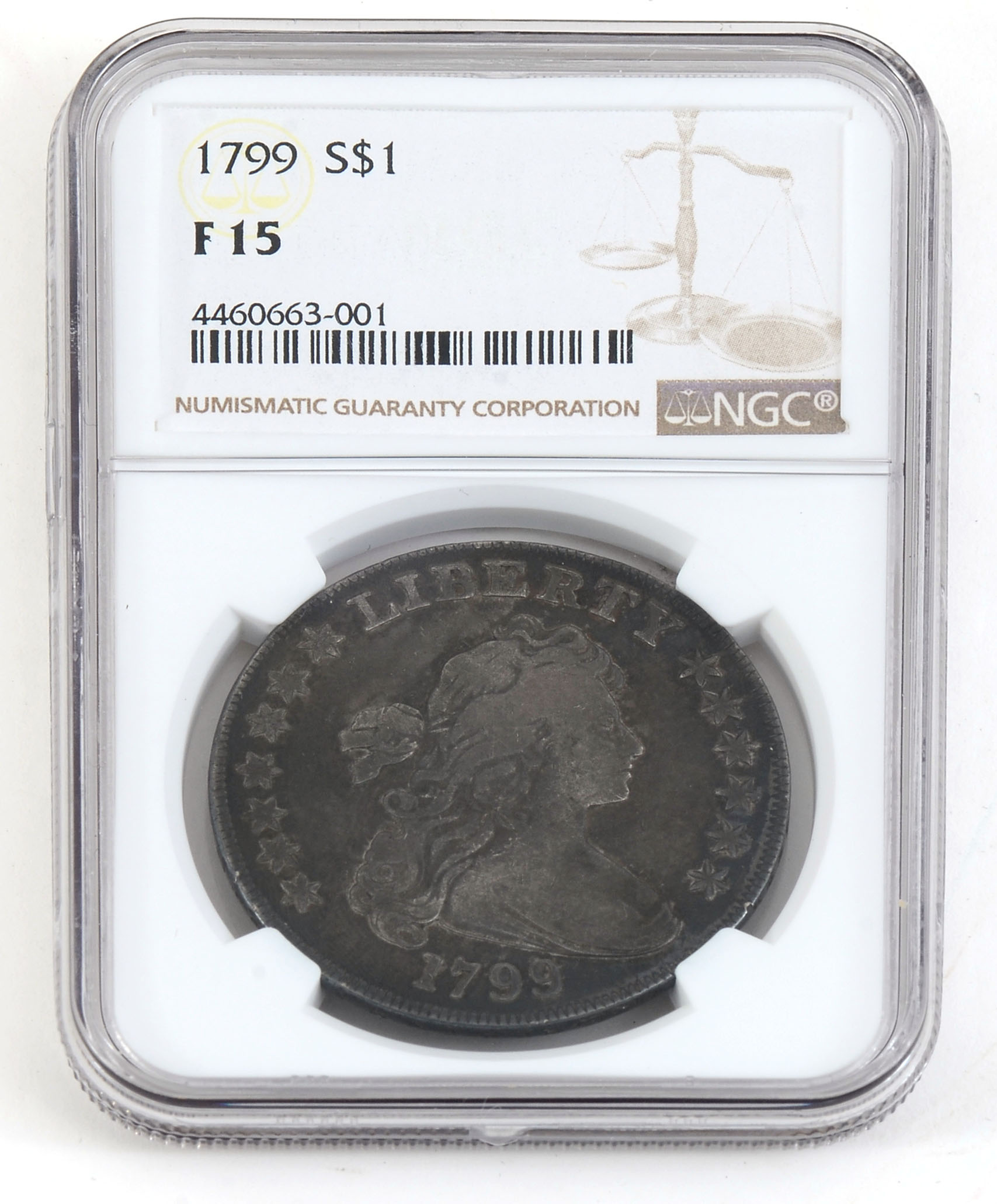 1799 DRAPED BUST US SILVER DOLLAR: Slabbed and graded Fine 15 by NGC.