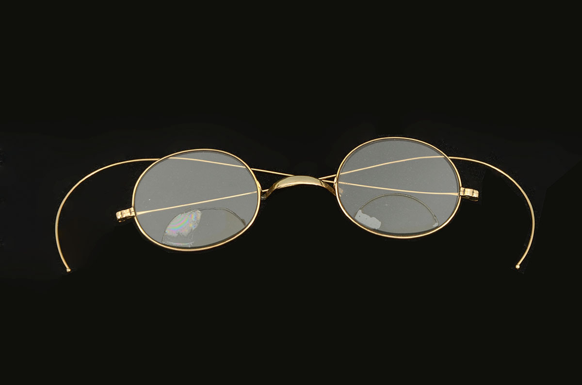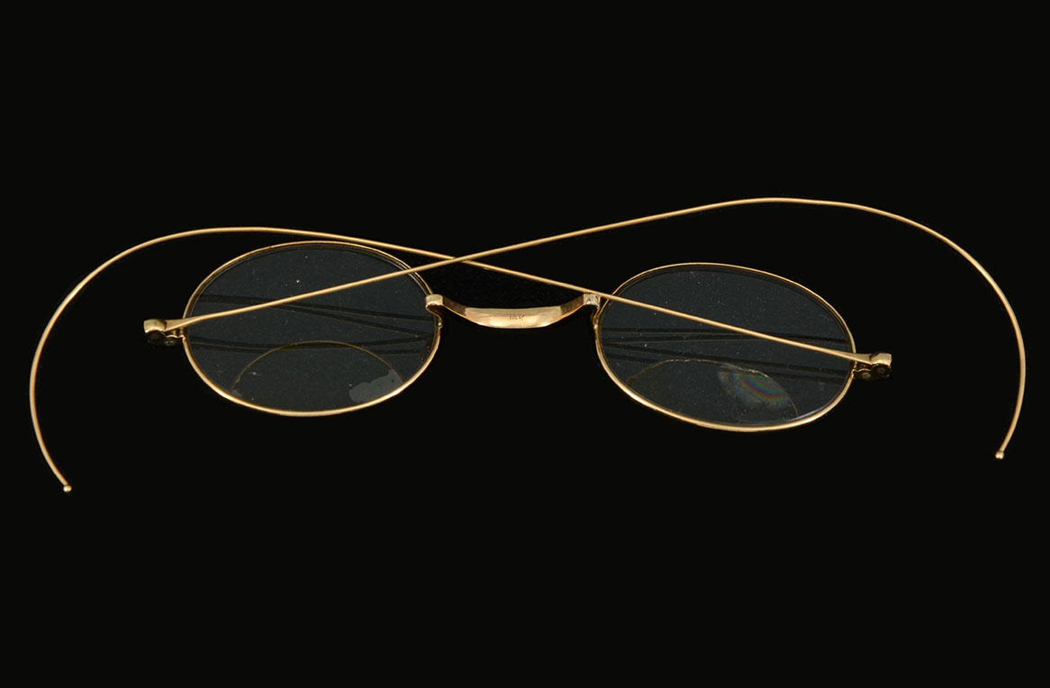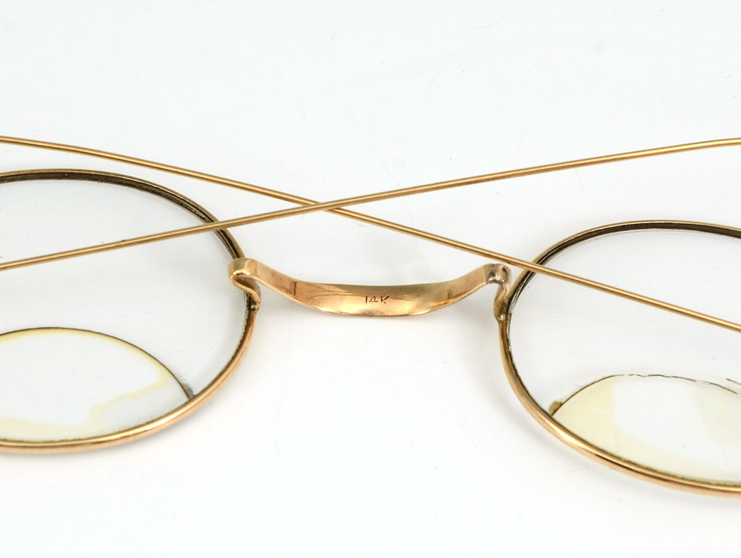 VINTAGE 14K YELLOW GOLD SPECTACLES: Oval shaped in good condition. Pins are all there and tight, and temples are in very good shape. Marked 14K on the bridge. Length across front is 4.75'' and temple length is approx 4.5''.